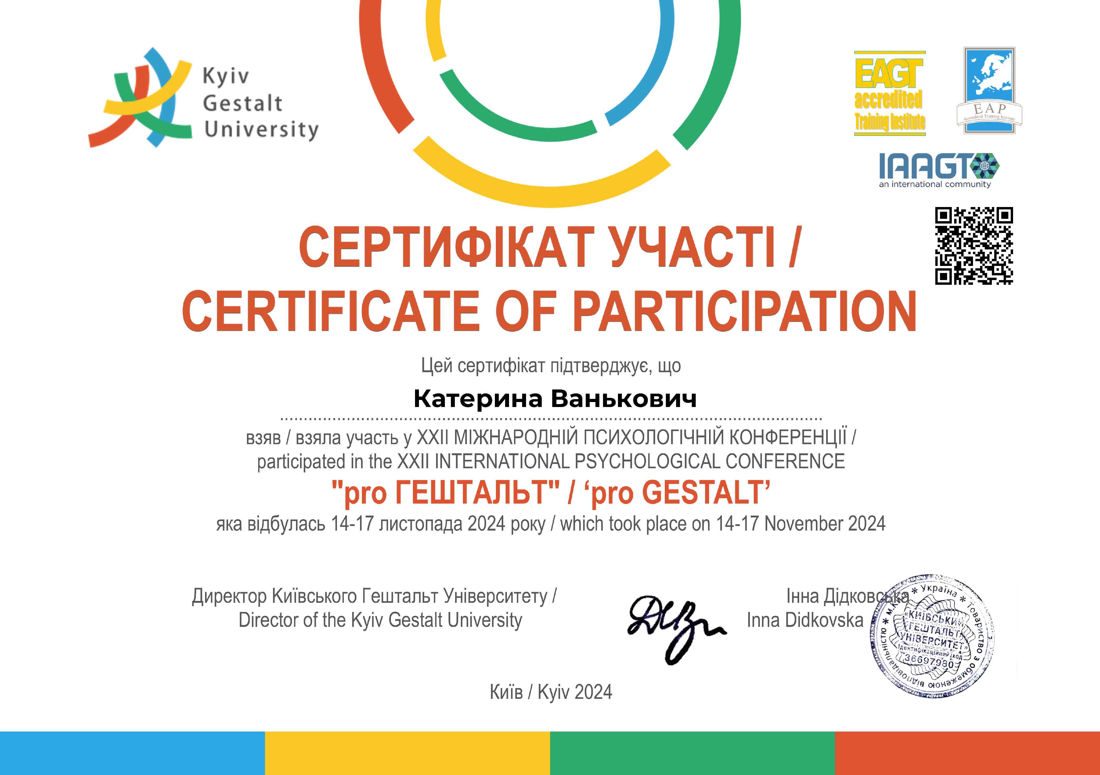 2021 - 2022 - І рівень навчальної програми з Гештальт-терапії, Київський Гештальт Університет (КГУ)