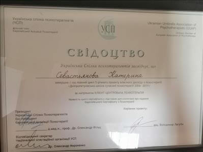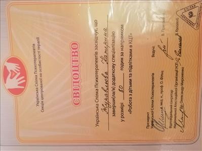 Додаткова спеціалізація (2017-2018) - "Робота з дітьми та підлітками у Клієнт-центрованій терапії" (в рамках УСП, тривалістю 80 годин).