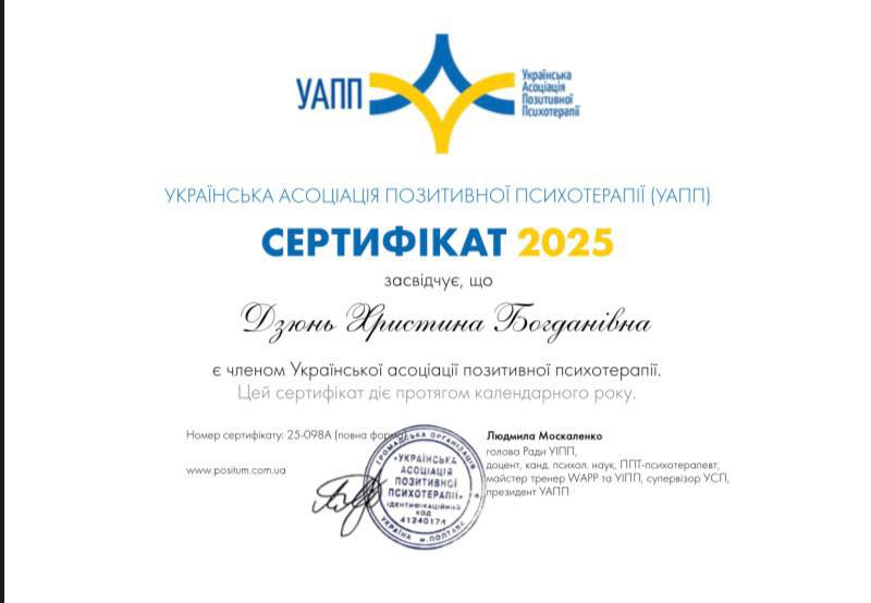 Під час зустрічей я допомагаю людині зрозуміти себе глибше, навчитися чути свої почуття й потреби, будувати опору на себе та формувати здорові взаємини зі світом.