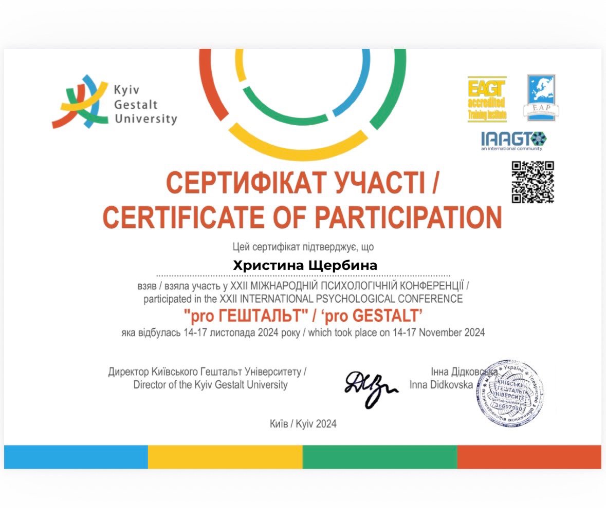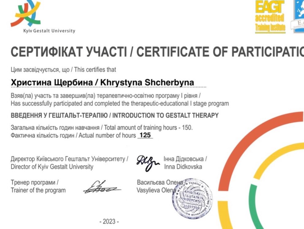 Моя подруга гештальтист- запропонувала спробувати першу сходинку гештальт-терапії. Саме там для мене відбувся важливий поворот: я вперше відчула живий контакт — із собою, з іншими й із тим, що відбувається «тут і тепер». З’явилося більше ясності, усвідомленості та відчуття опори на себе.