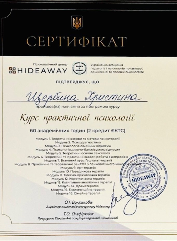 Сьогодні я дипломована психологиня, бізнес-психологиня, гештальт-терапевтка в процесі навчання.