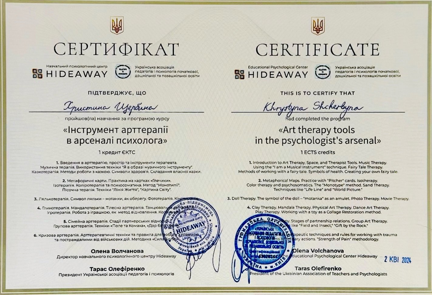 1. Навчальний психологічний центр HIDEAWAY –«Інструменти Арттерапії в арсеналі психолога»