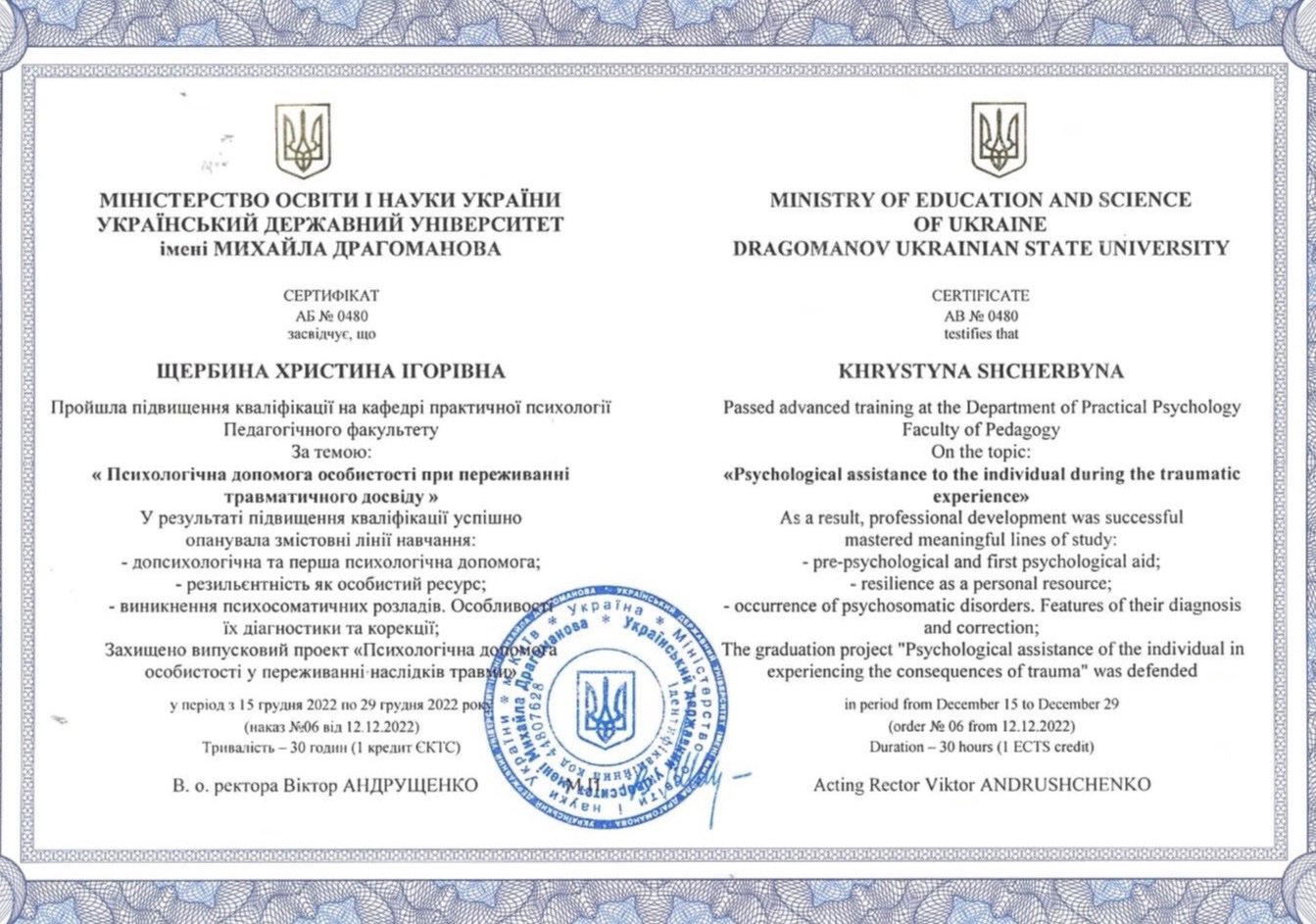 3. Український державний університет імені Михайла Драгоманова –«Психологічна допомога особистості при переживанні травматичного досвіду»