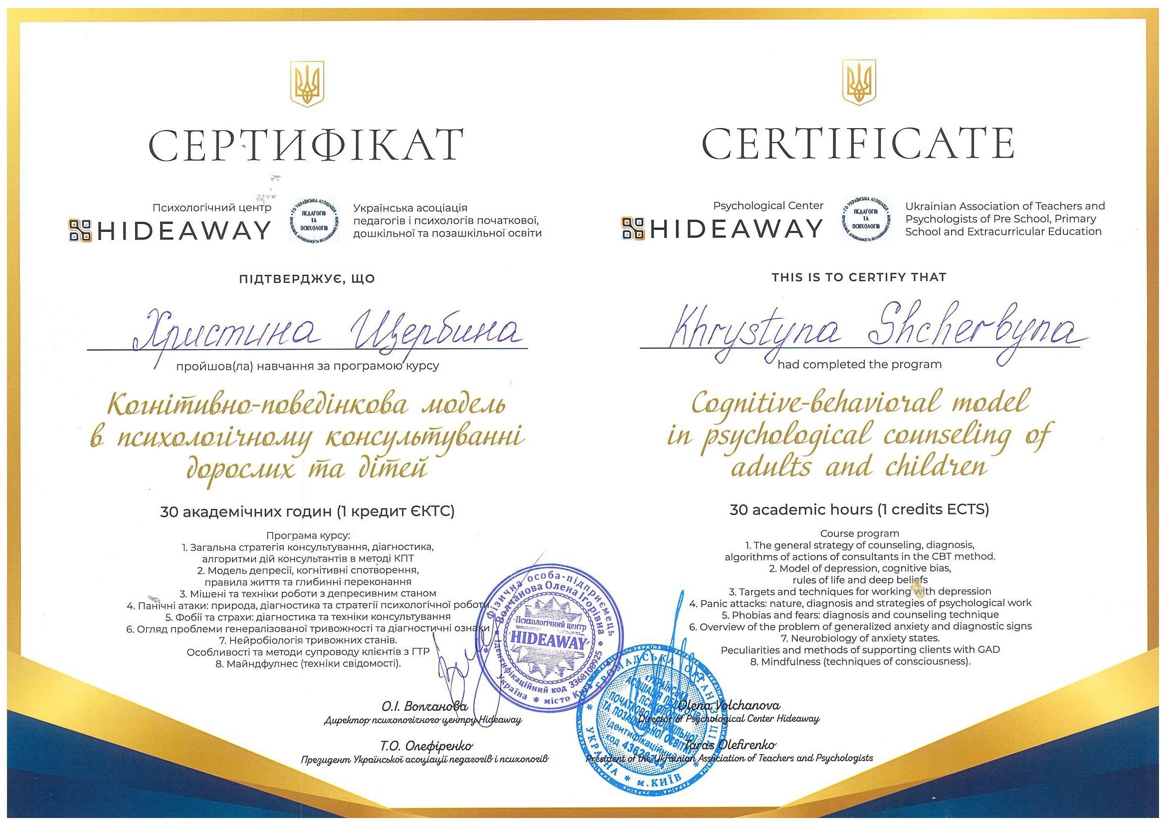 5. Навчальний психологічний центр HIDEAWAY –«Когнітивно-поведінкова модель в психологічному консультуванні дорослих та дітей»