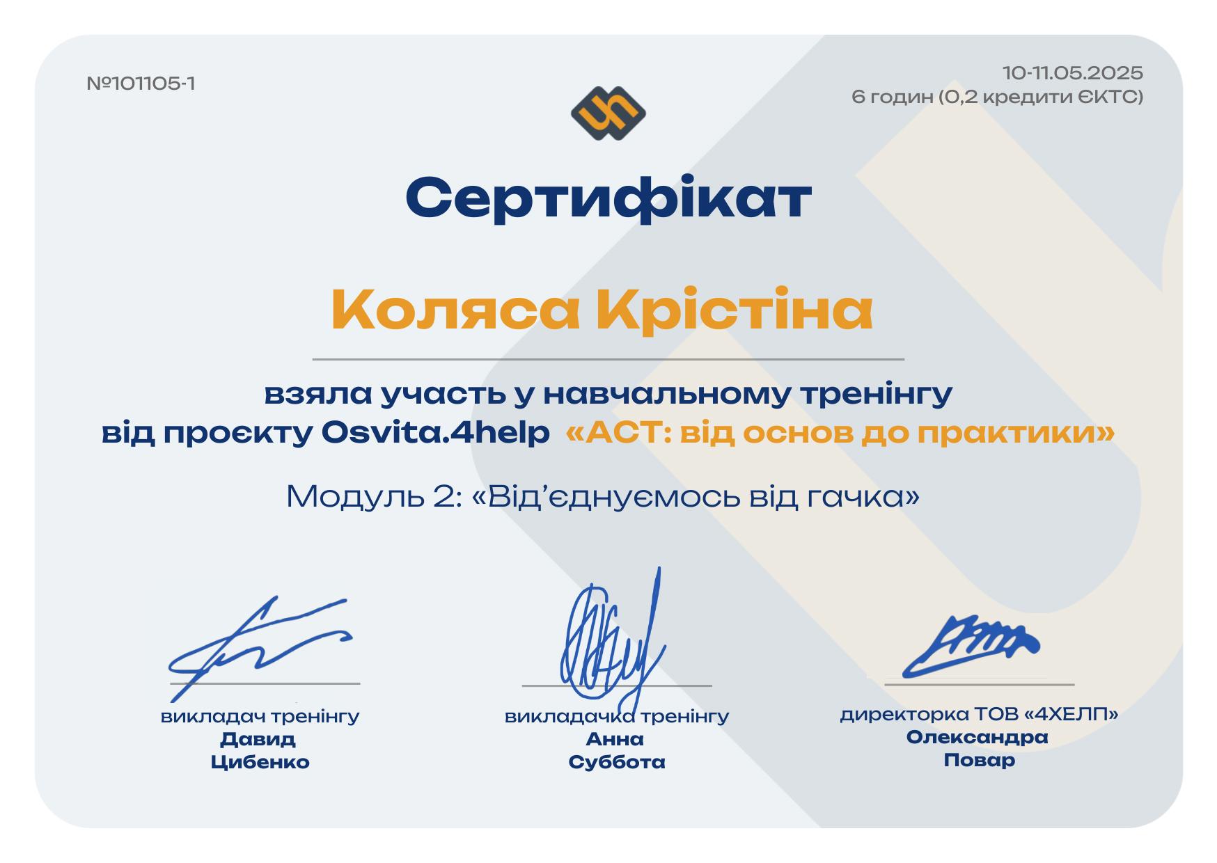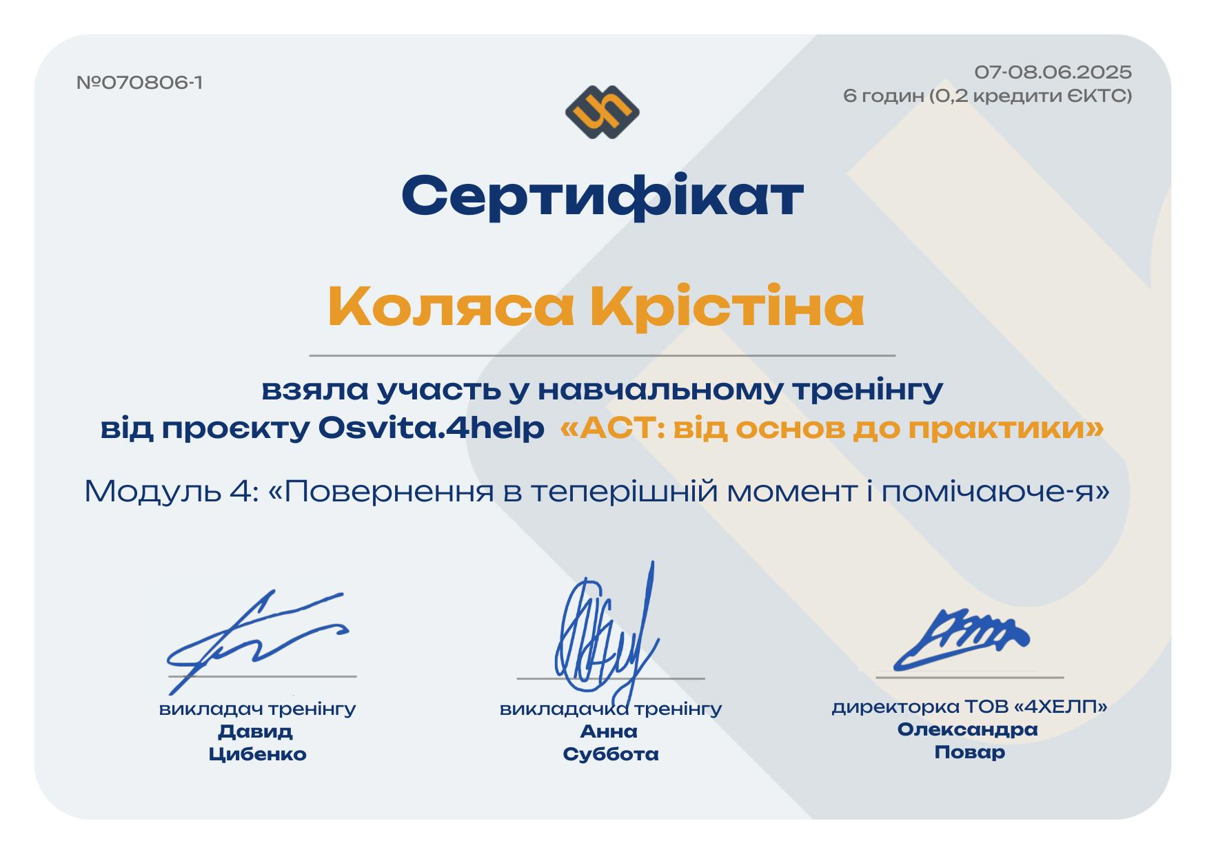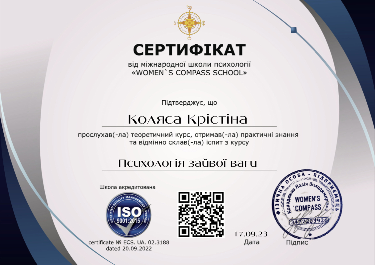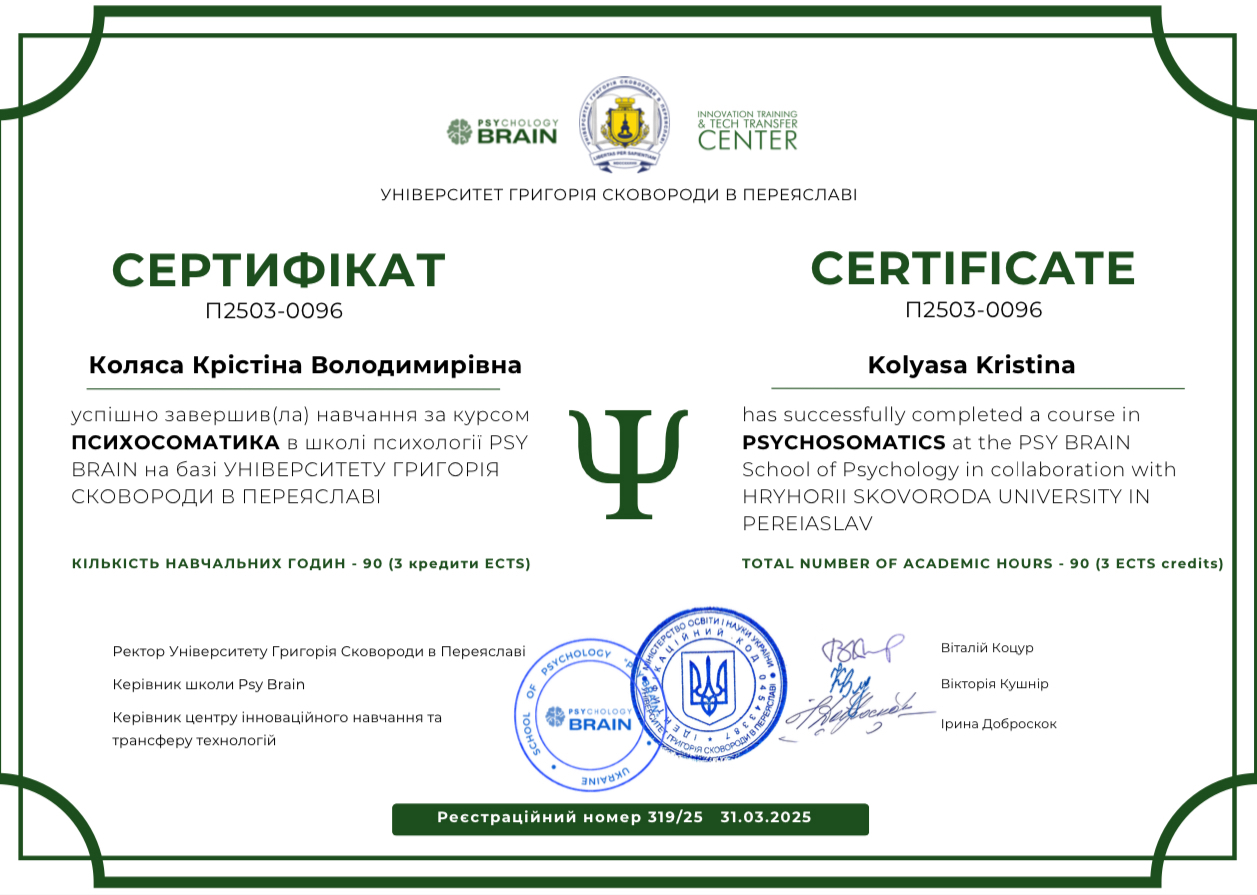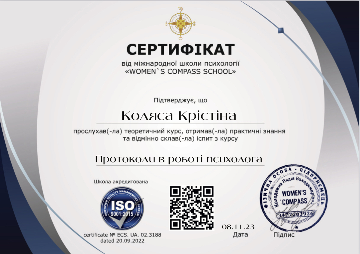 Мій підхід — гештальт і ACT, плюс роки навчання з психосоматики, харчової поведінки й сімейної психології. Але, якщо відверто, клієнти рідко запам’ятовують назви методів. Важливіше інше: зі мною можна бути собою — із вашою втомою, тривогою, кризами, вигоранням та проблемами у стосунках.