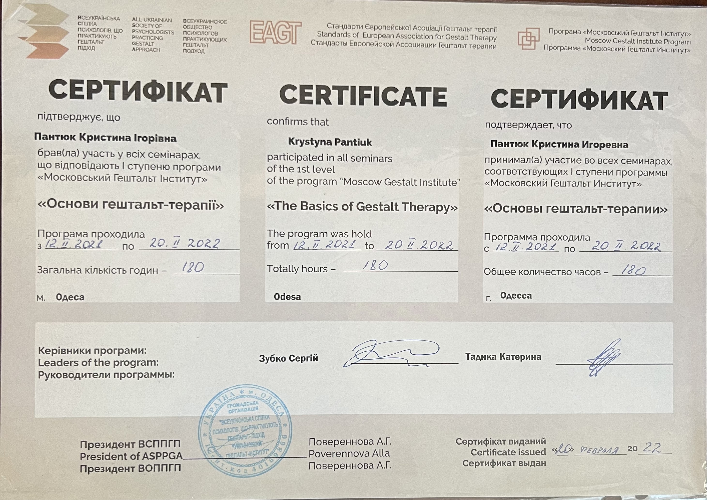 У 2022 році закінчила першу ступень Гештальту