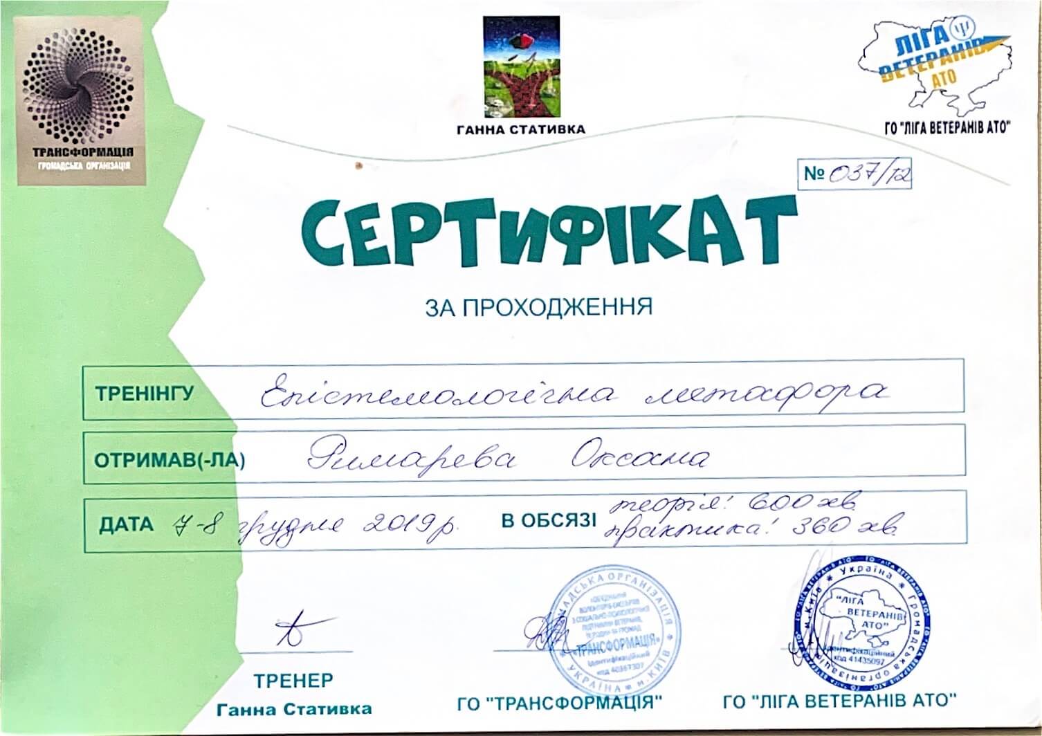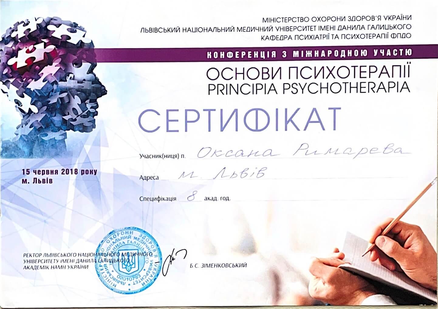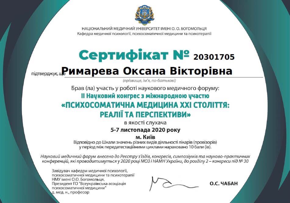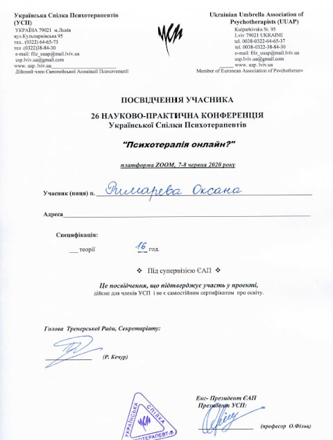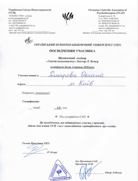 - Вища психологічна: Український психотерапевтичний Університет: Психоаналітик