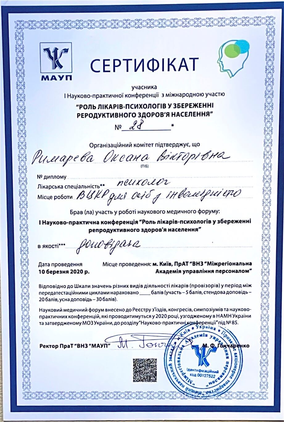 - Доповідач на Науково-практичній конференції "Роль лікарів-психологів у репродуктивному здоров'ї населення"