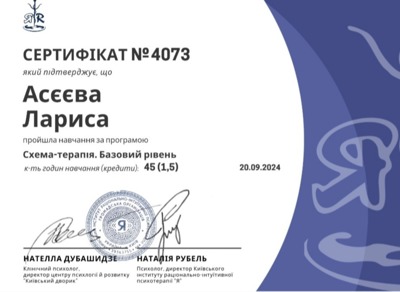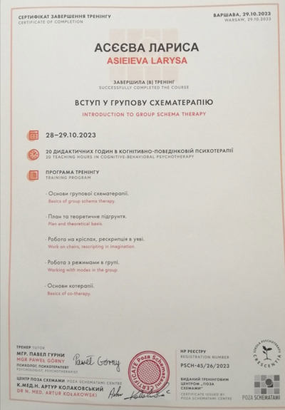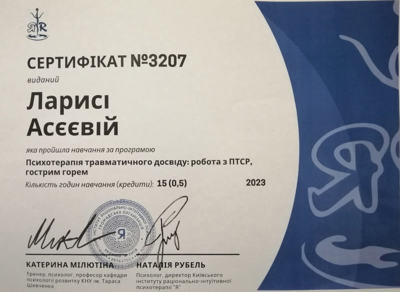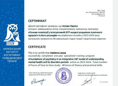 - навчаюсь в УІКПТ на програмі " Основи психіатрії" . 2023 - 2024рр.