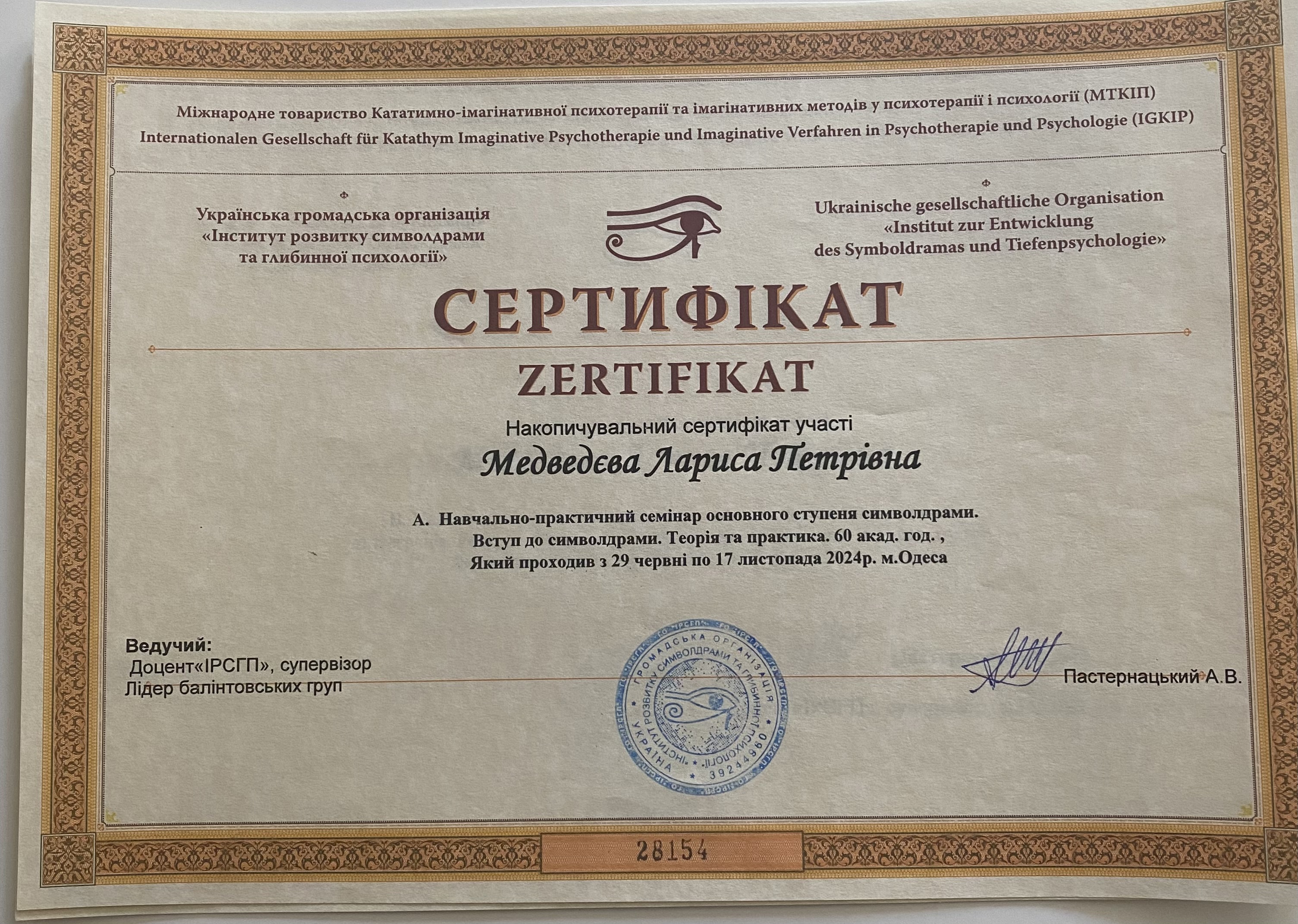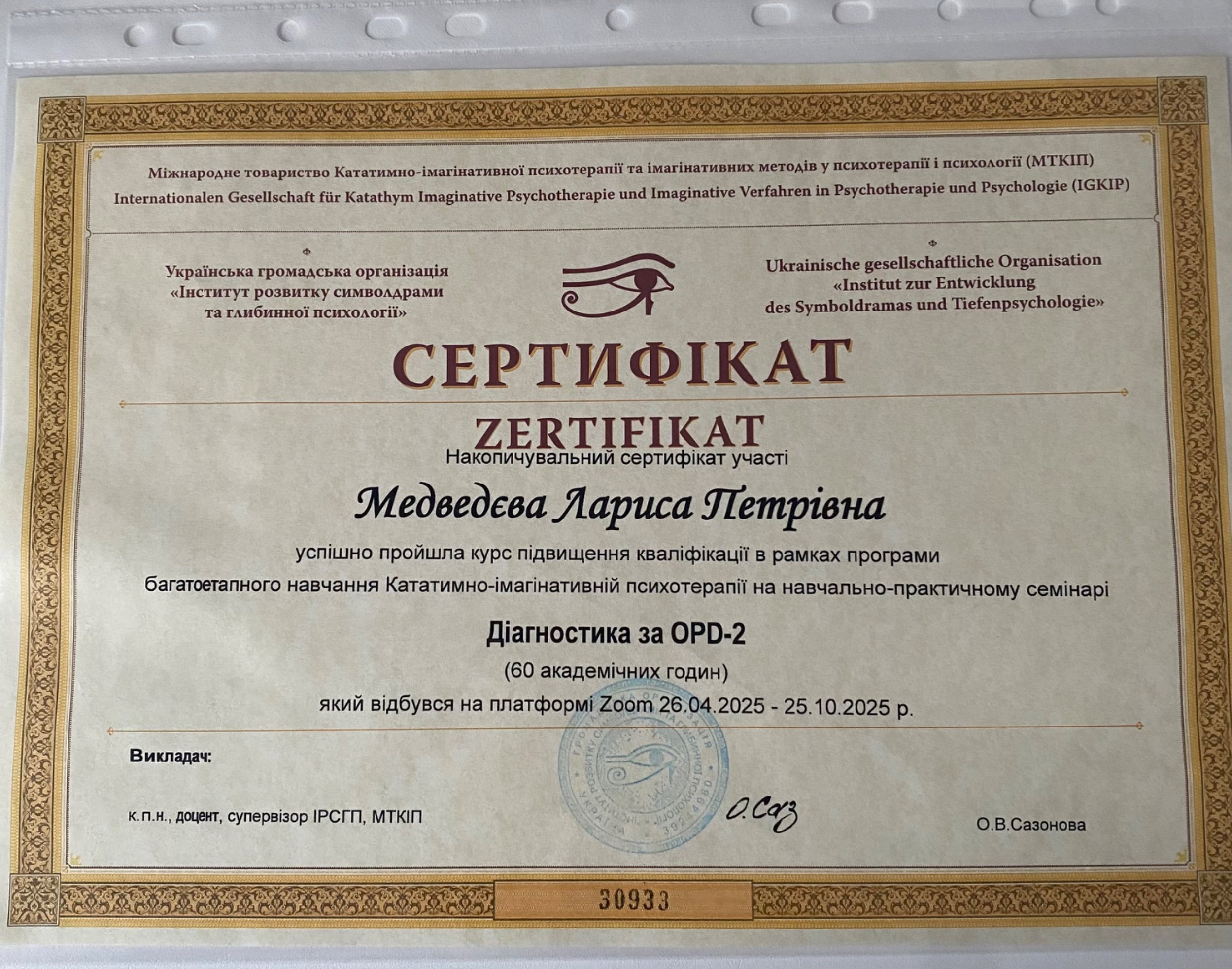 2. Одеський психоаналітичний інститут, сертифікат психодинамічного психотерапевта