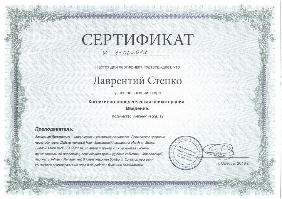 Тому, коли я почав свою професійну діяльність психолога, мій вибір зупинився саме на когнітивно-поведінковій терапії, стоїцизмі, базі нейрофізіології, нейробіології та концепції долеаналізу.