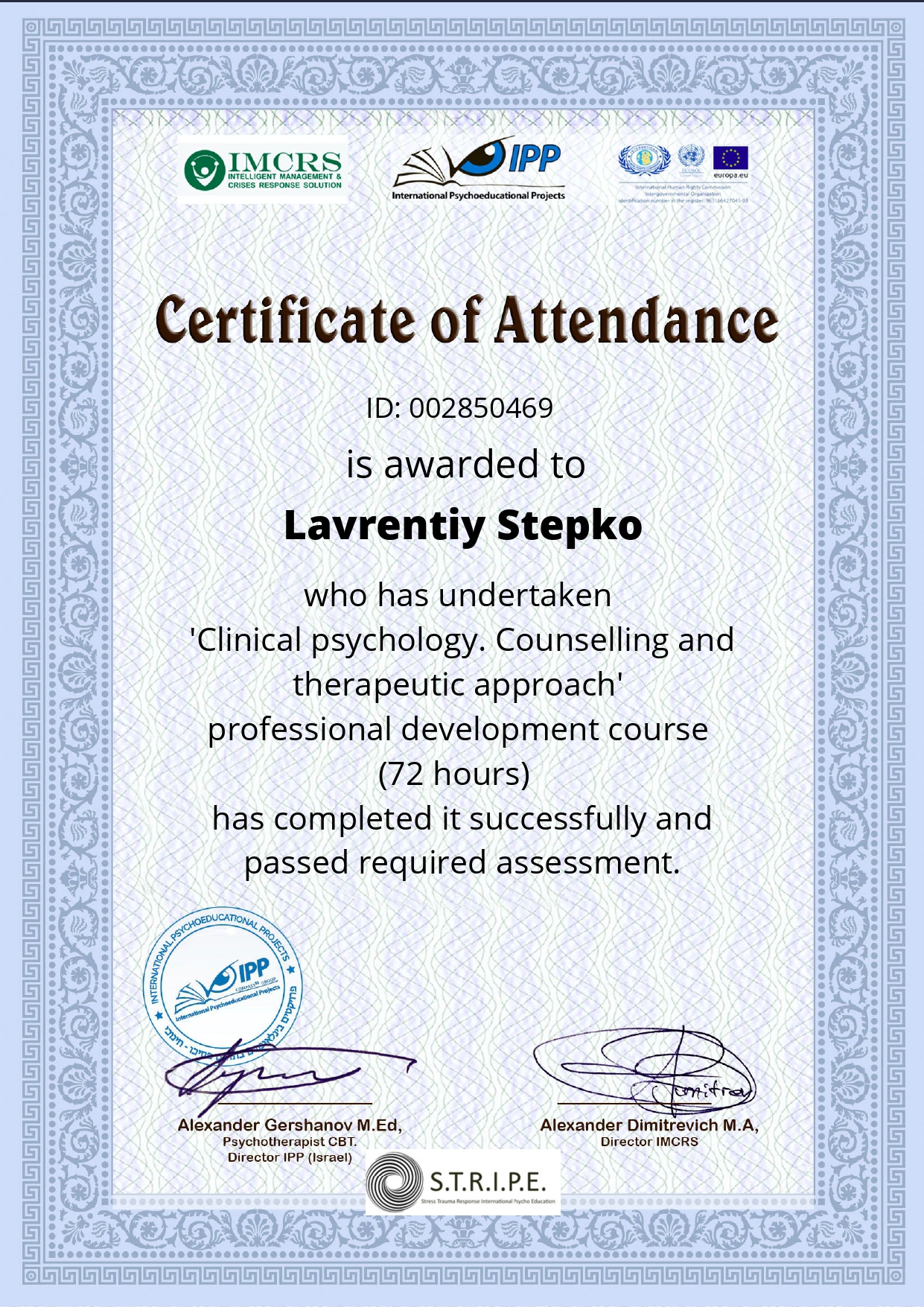 5. Центр перепідготовки та підвищення кваліфікації ФПСР ОНУ ім. І. І. Мечникова, Intelligent Management & Crises Response Solutions (Велика Британія), Міжнародна психоосвітня платформа Stress & Trauma Response International Psycho Education (Ізраїль–Велика Британія). Сертифікаційна програма «Консультування в когнітивно-поведінковому підході».