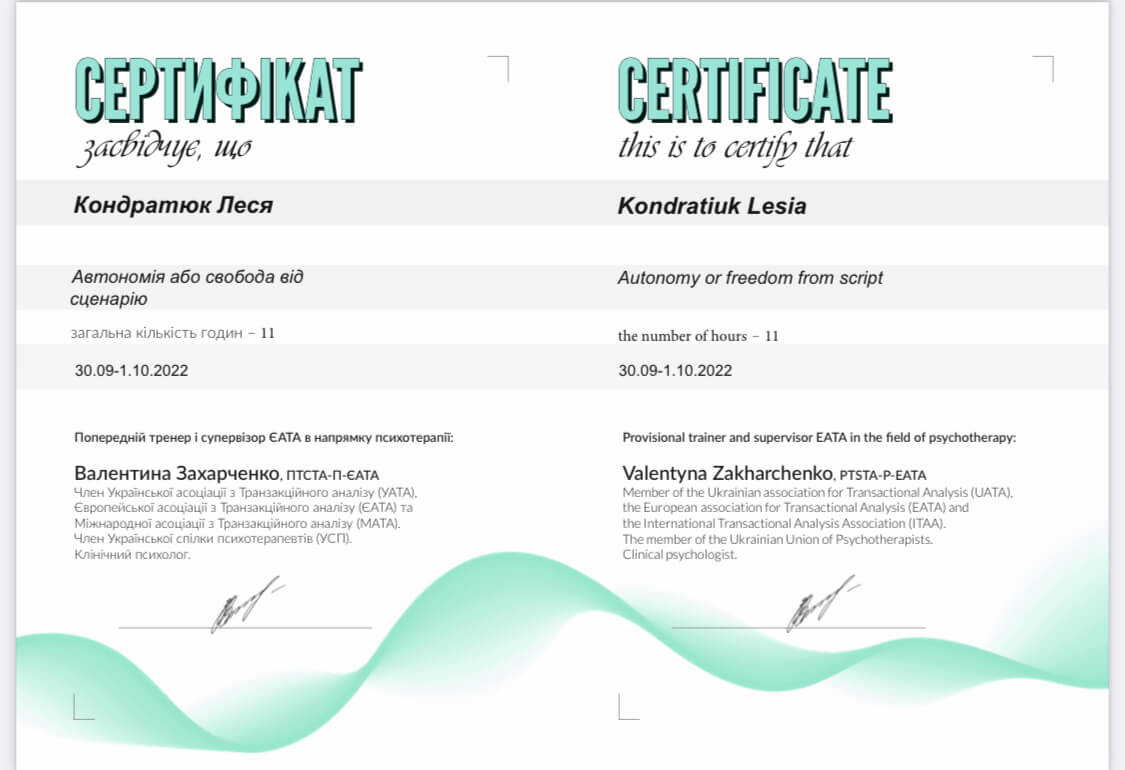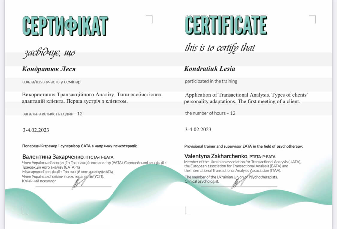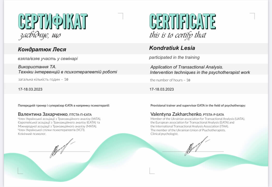 Практик в методах Транзактний аналіз та Гештальт-терапія.