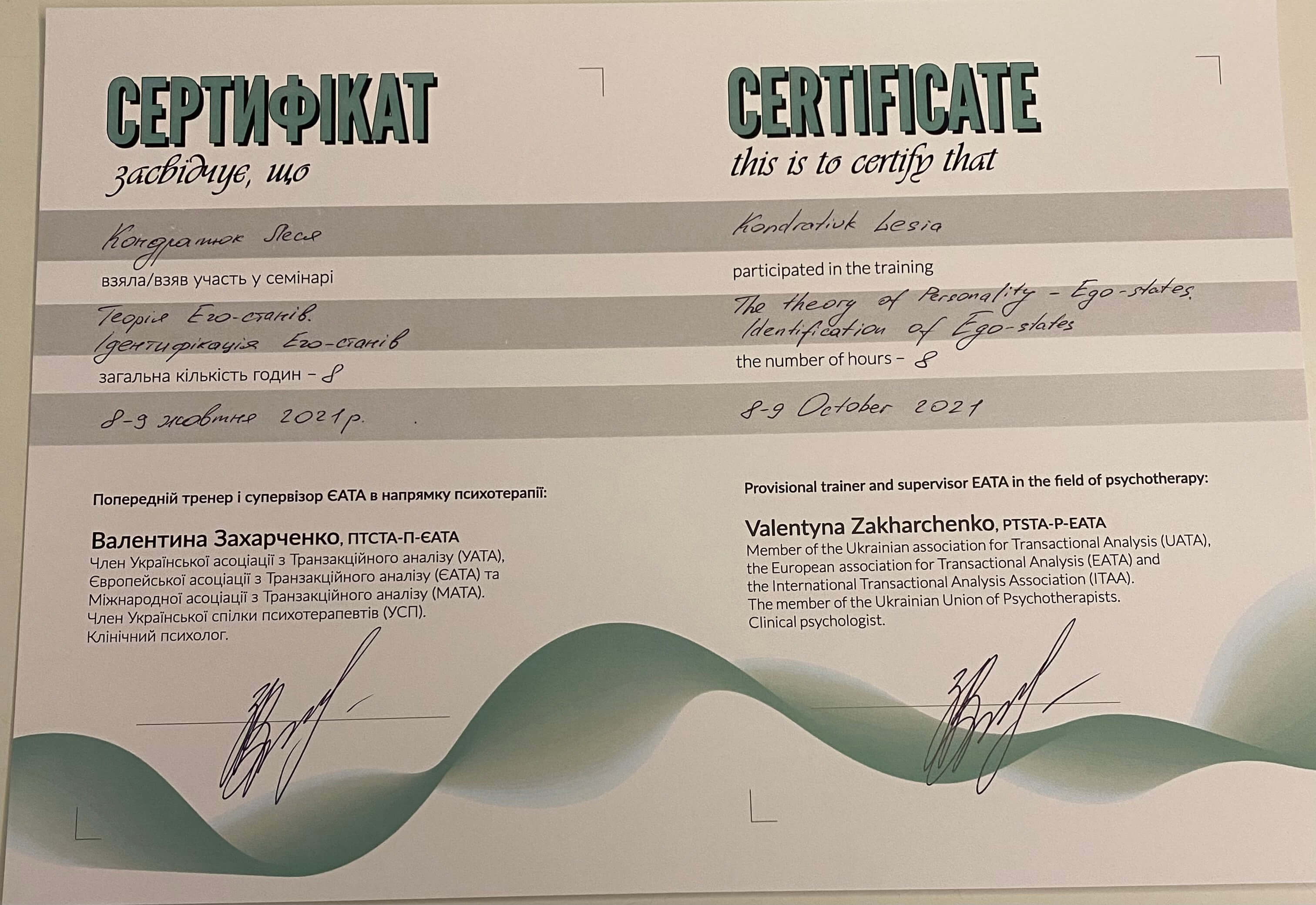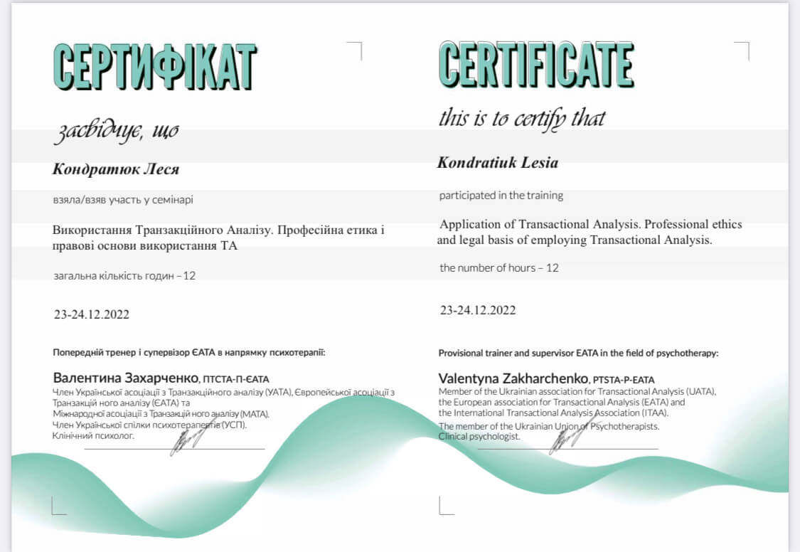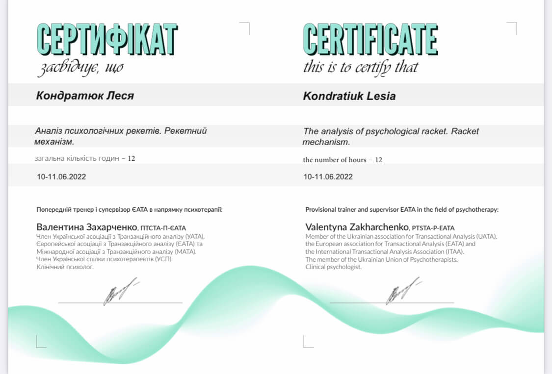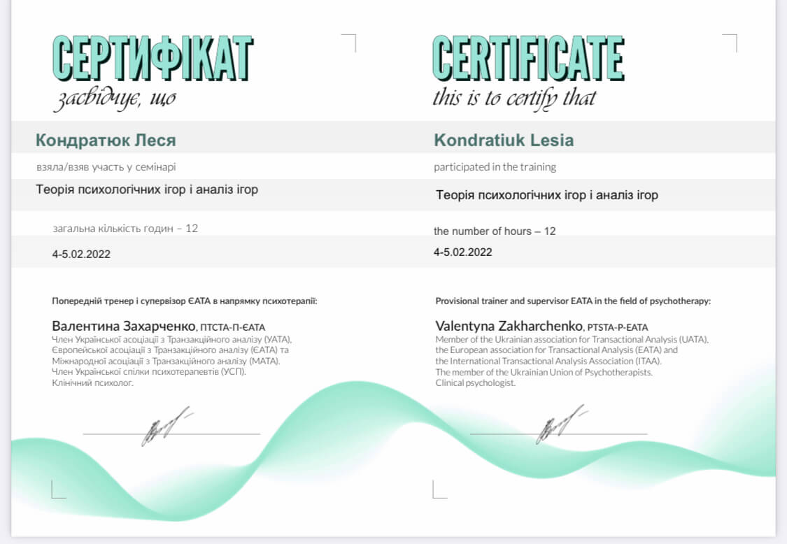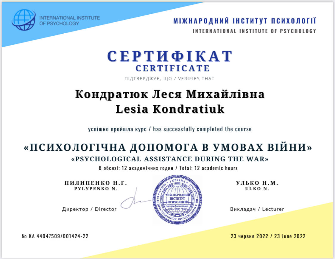 • Міжнародний Інститут Психології , «Психологічна допомога в умовах війни», «Психіатрія для психологів», «Теорія прив’язаності», «Психосоматика».