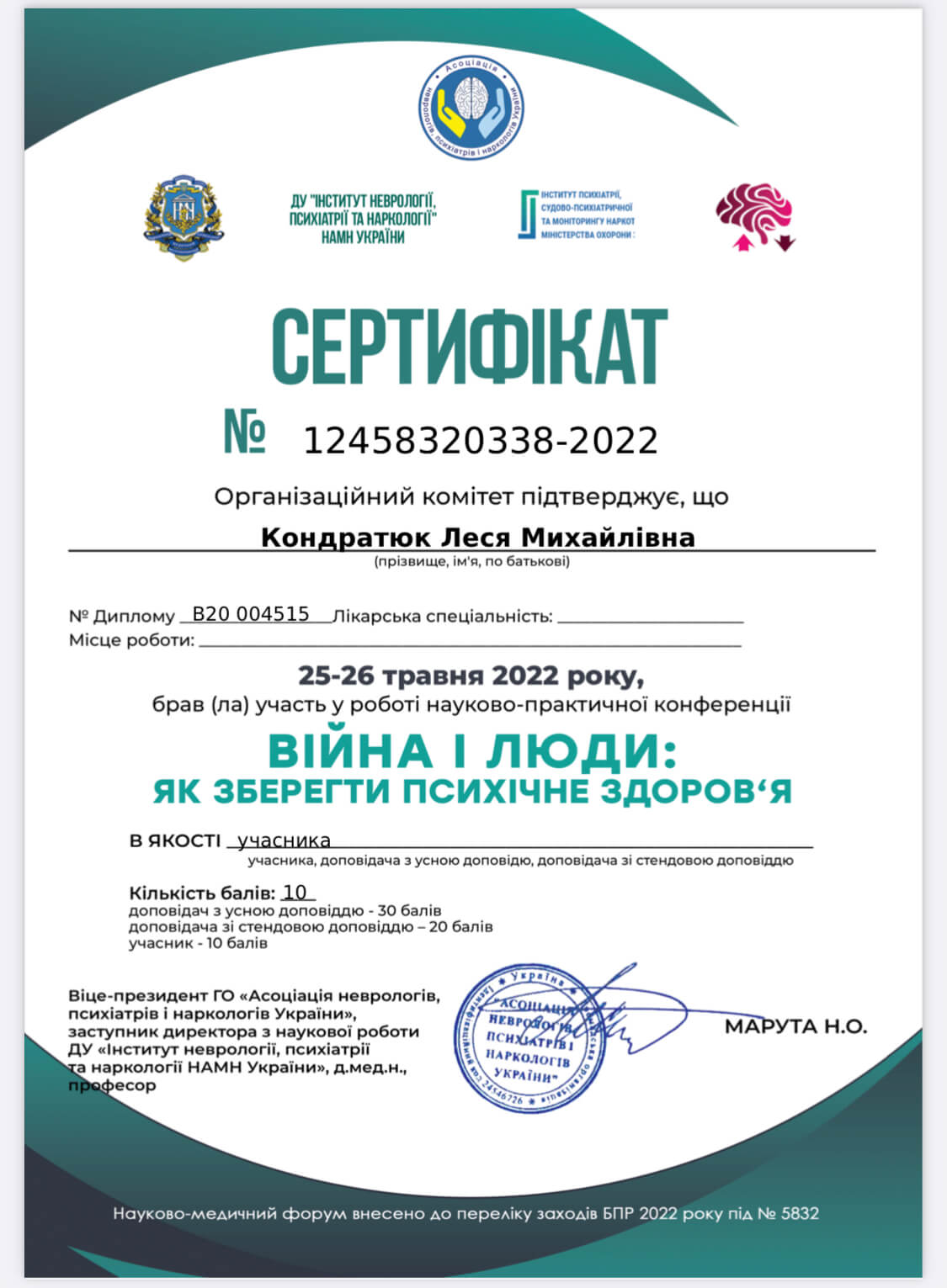 • Асоціація неврологів, психіатрів і наркологів України, науково-практична конференція «Війна і люди: як зберегти психологічне здоров’я».