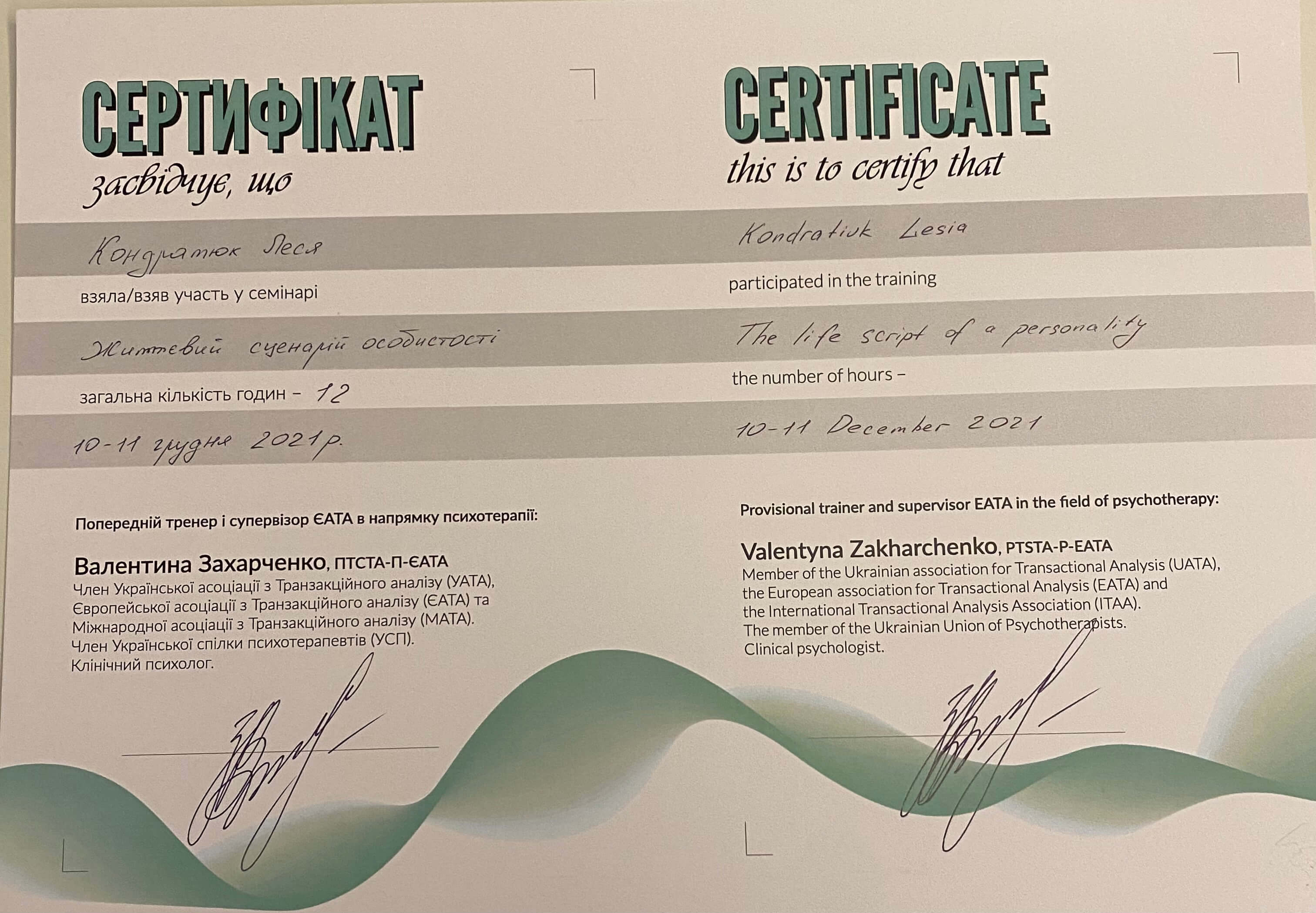 • Асоціація практикуючих психологів Івано-Франківської області, курс « Особливості використання казкотерапії у роботі практичного психолога та соціального педагога»