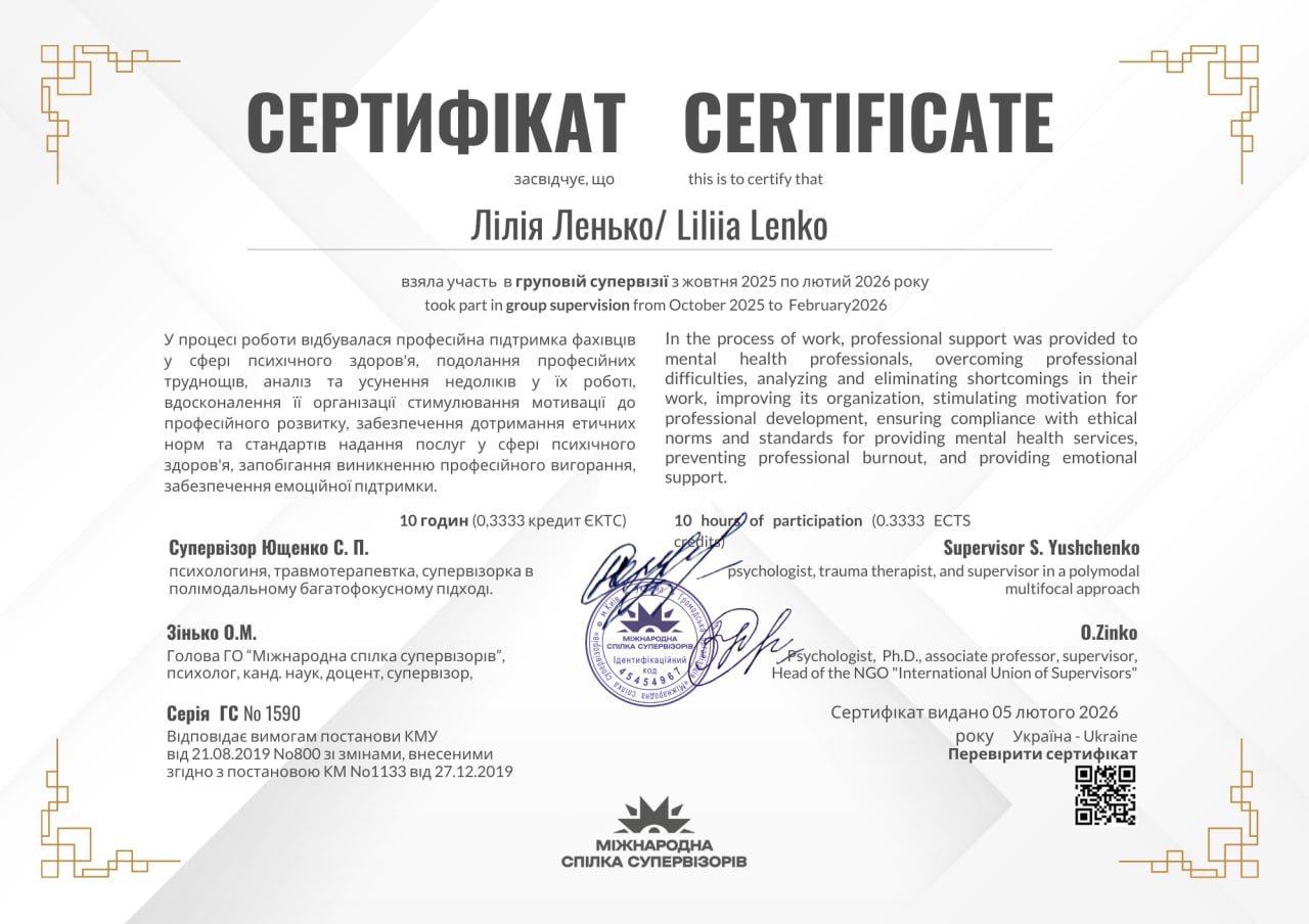 ~Навчання з напрямку психосоматики (член асоціації психотерапевтів психосамотології та тілесної теріпії) (2022);