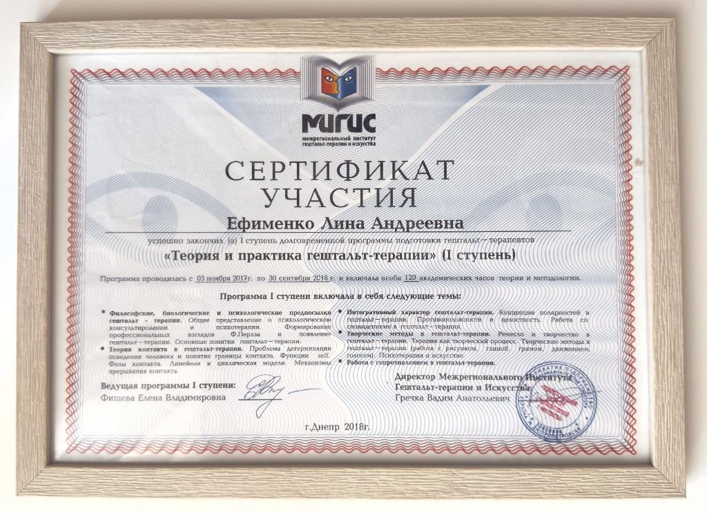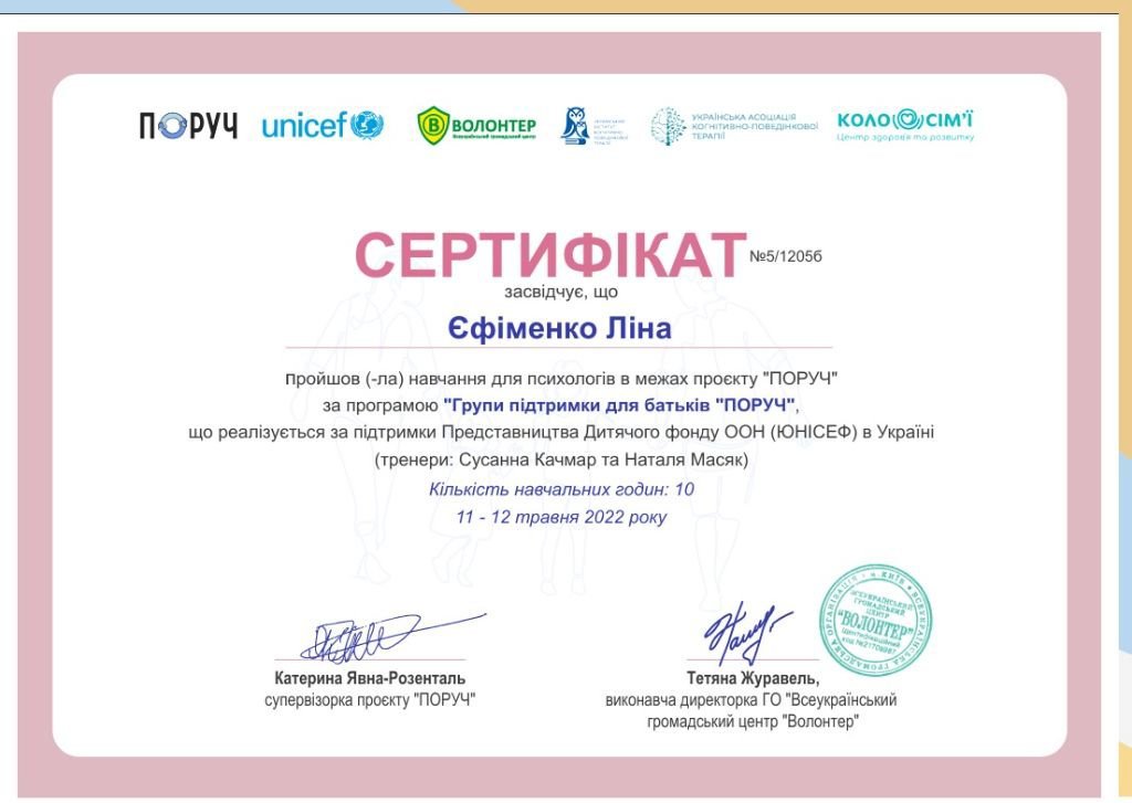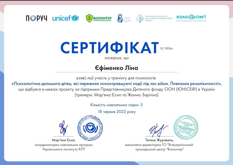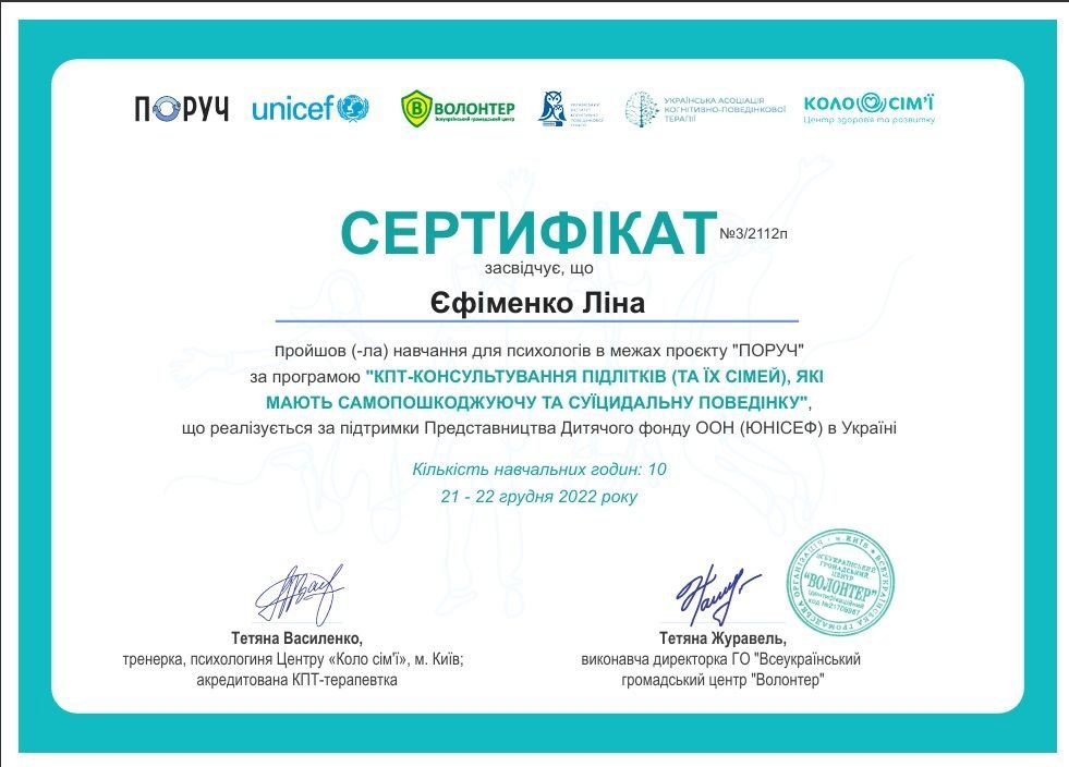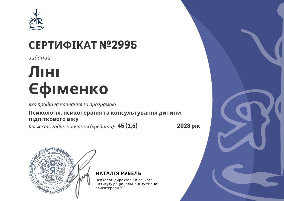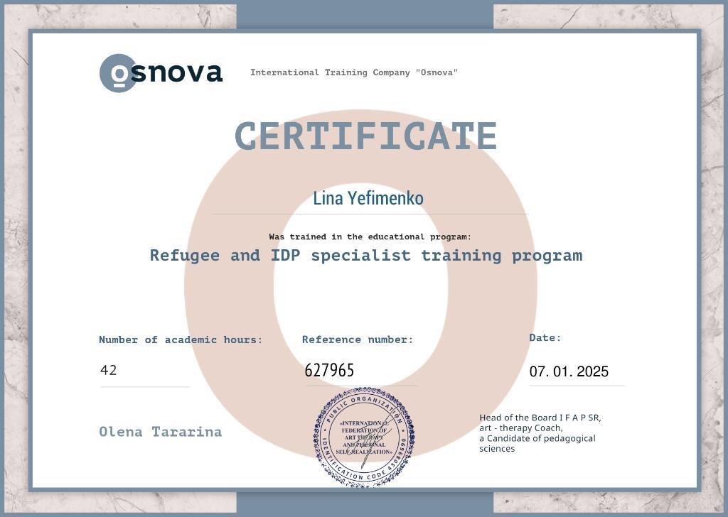 Я маю системну професійну підготовку і продовжую навчання, адже для мене важливо залишатись у професійному розвитку. Я вірю, що психотерапія — це сфера, де якість освіти, етика і стандарти мають значення, бо за цим стоїть безпека і довіра клієнта.