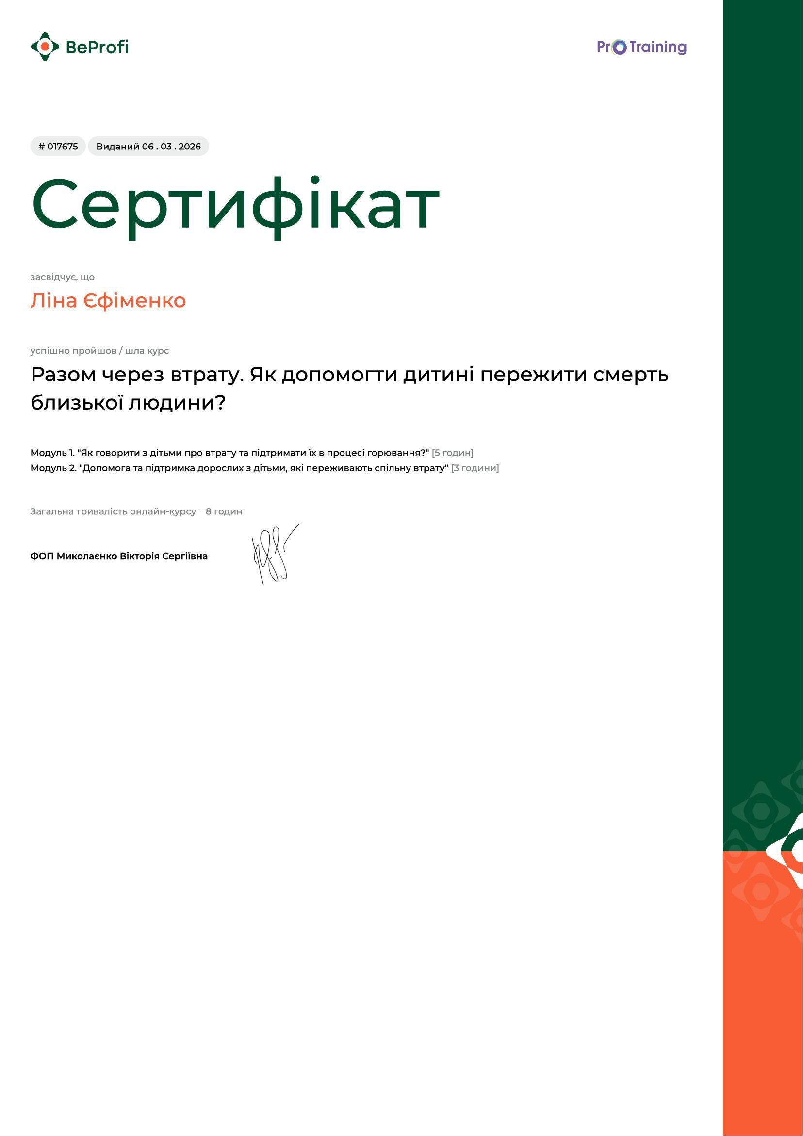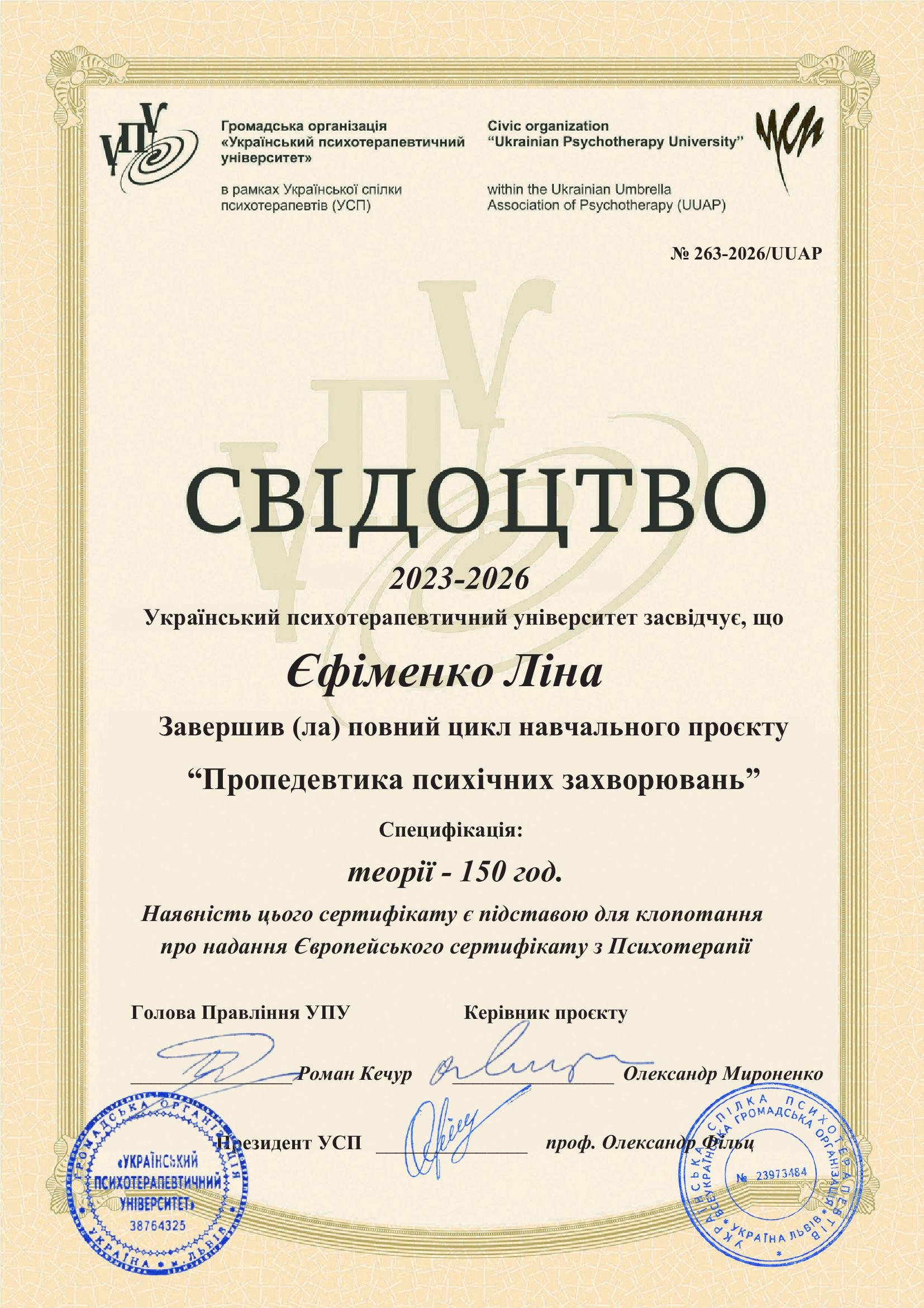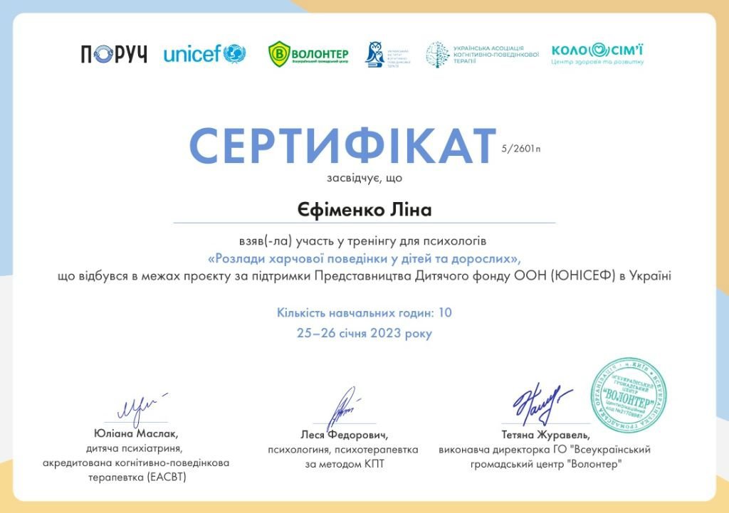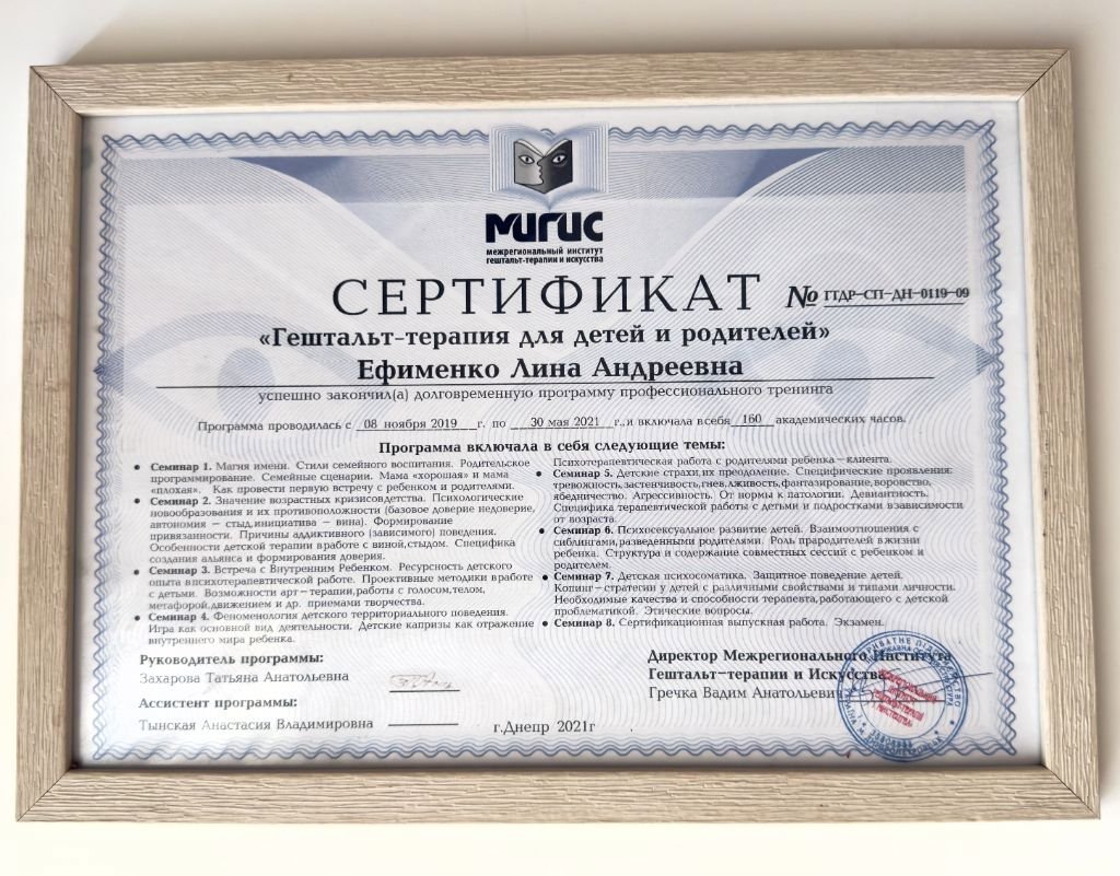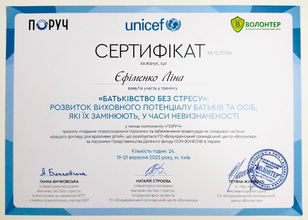 Я маю системну професійну підготовку і продовжую навчання, адже для мене важливо залишатись у професійному розвитку. Я вірю, що психотерапія — це сфера, де якість освіти, етика і стандарти мають значення, бо за цим стоїть безпека і довіра клієнта.