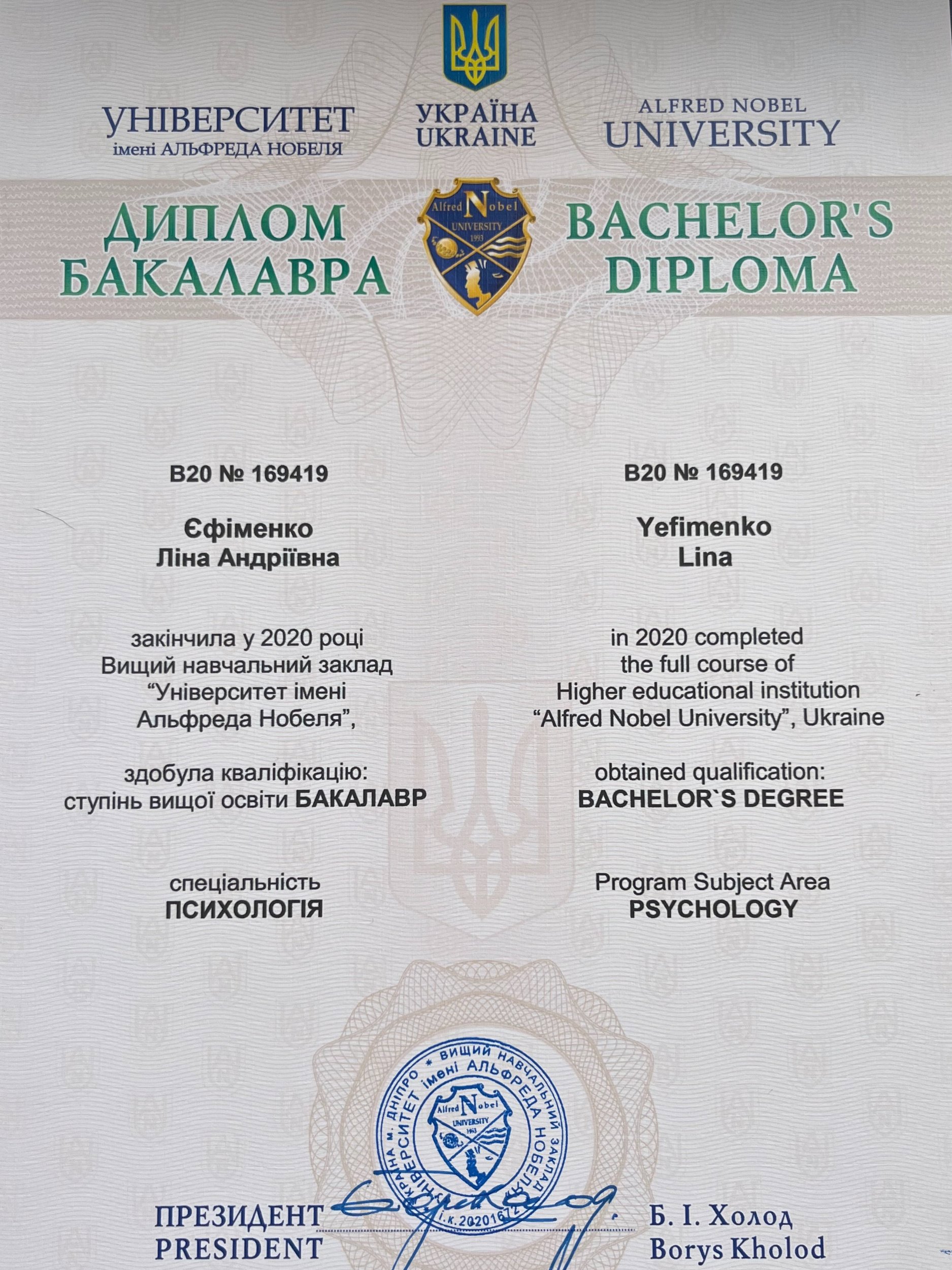 — Дніпропетровський університет імені Альфреда Нобеля, спеціальність «Психологія» (бакалавр)