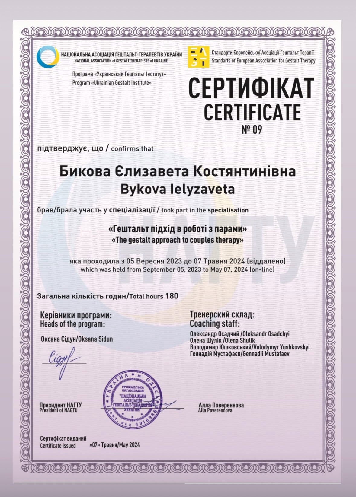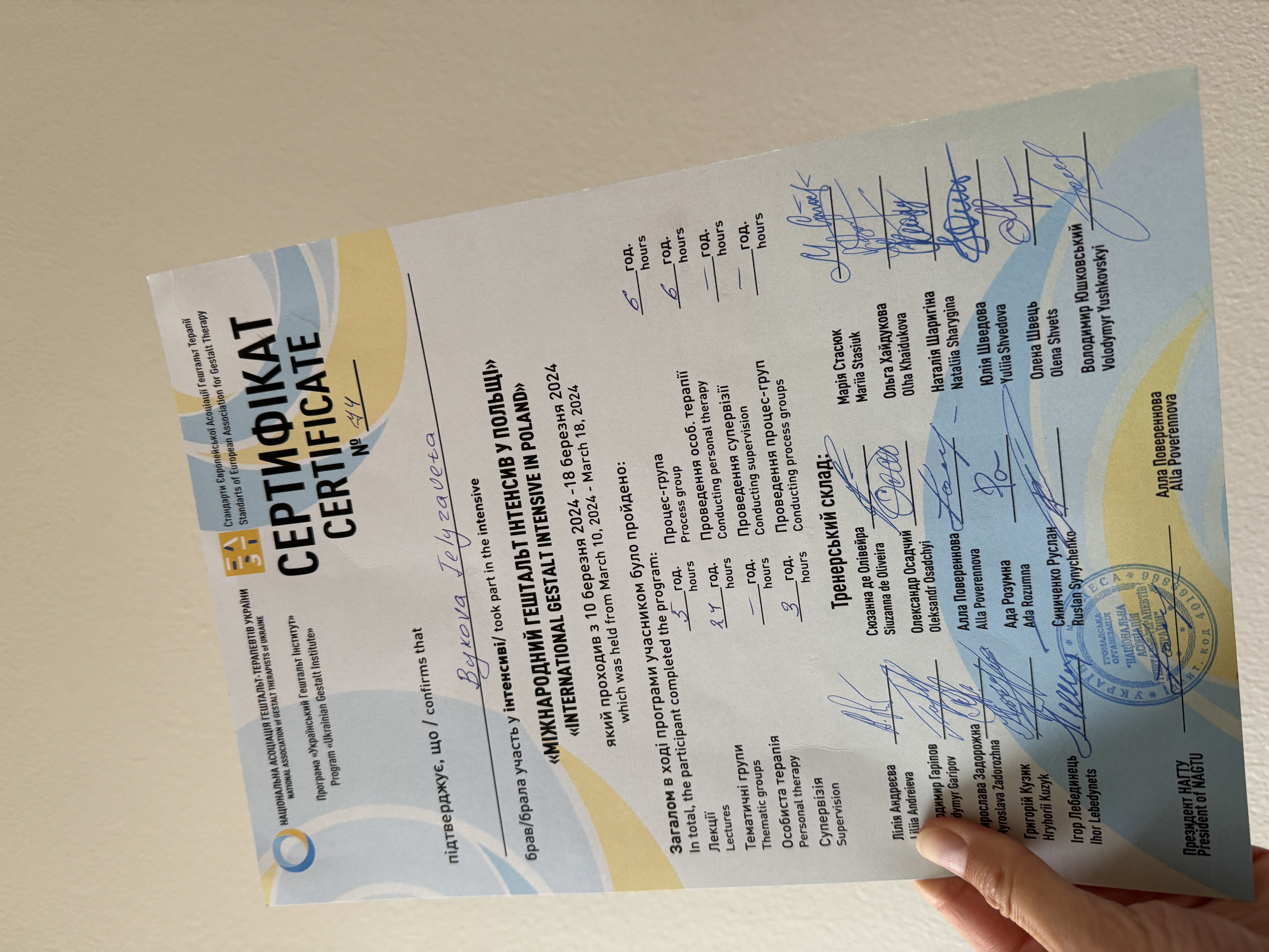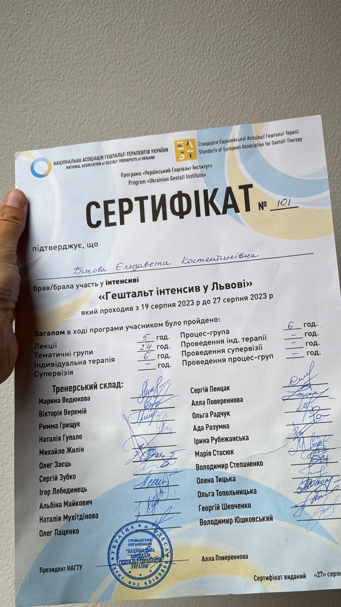 Я сертифікована гешталь-психотерапевтка. Отримала терапевтичну освіту в НАГТУ. Зараз проходжу навчання в супервізійній програмі.