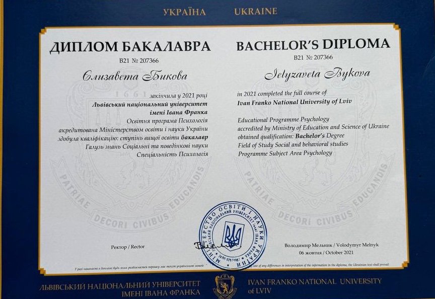 Львівський Національний Університет імені Івана Франка, спеціальність - психологія, рік закінчення - 2021 р.