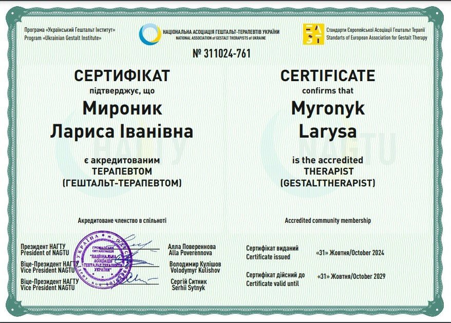 Мене звати Лора. Я психолог, сертифікований та акредитований як гештальт-терапевт НАГТУ. Спеціалізація "Психосоматика" НАГТУ.