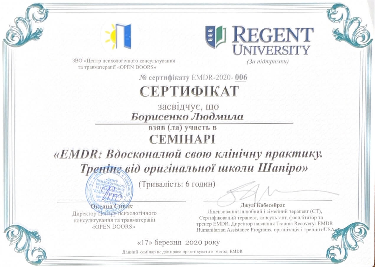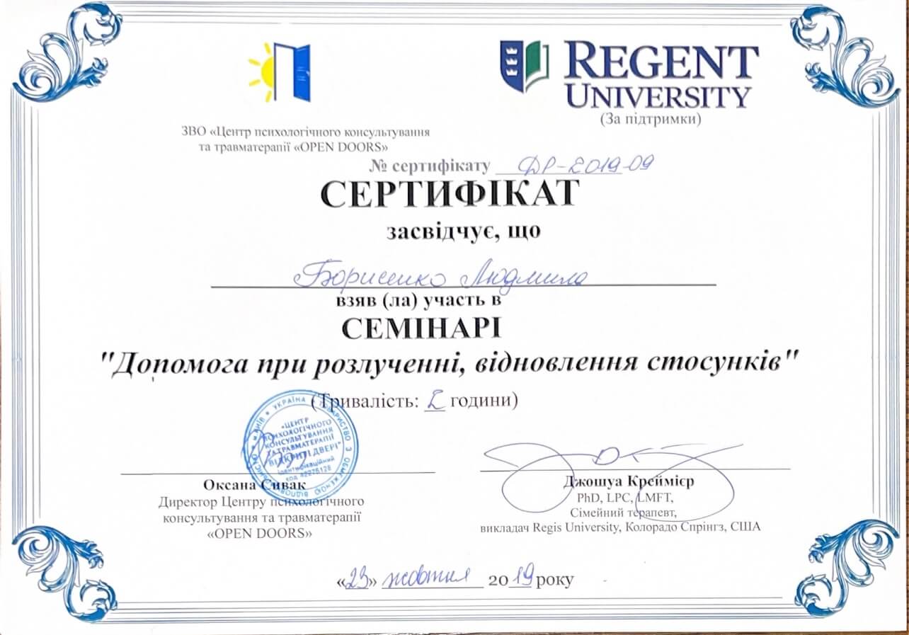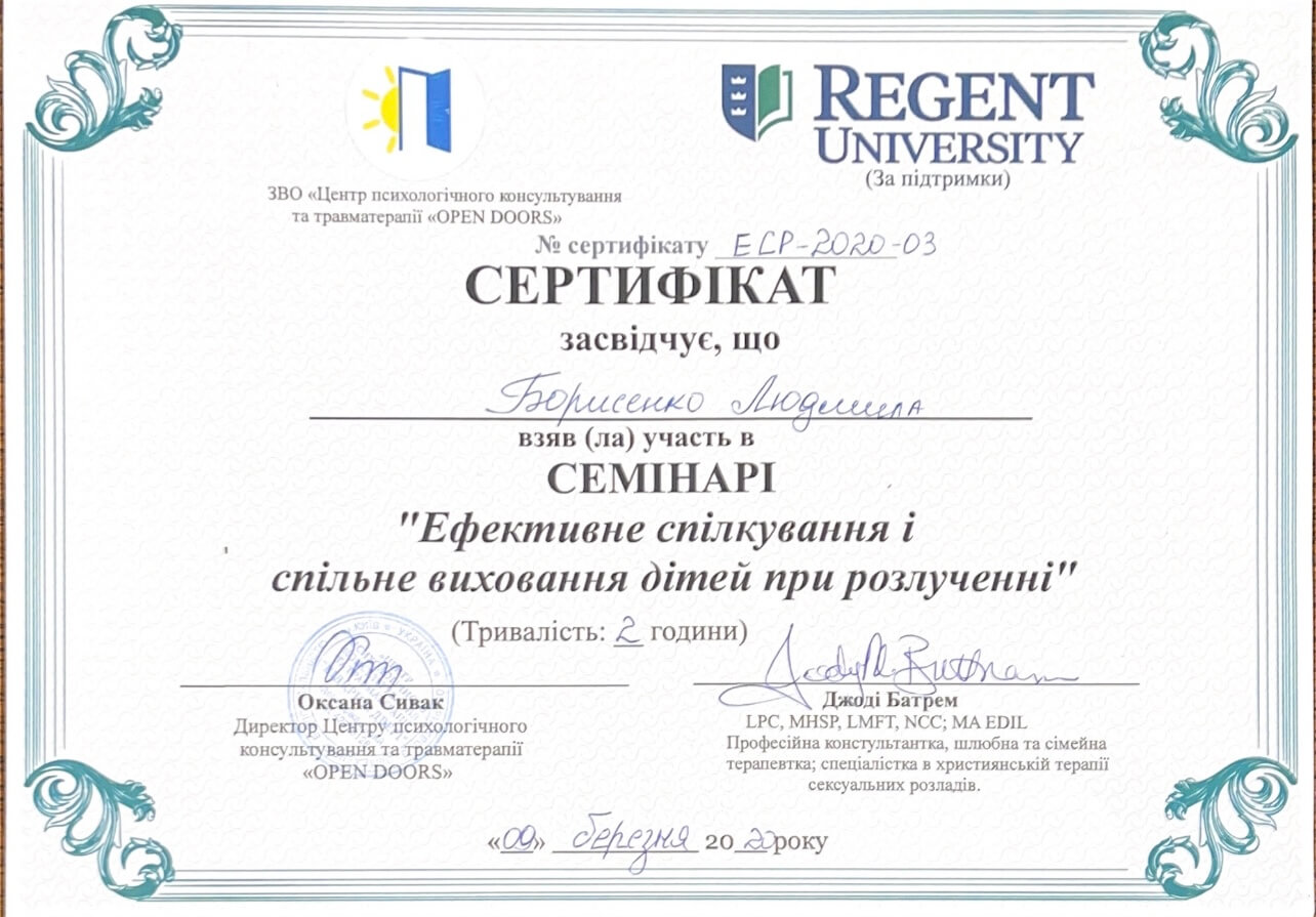 ЗВО «Центр психологічного консультування та травматерапії «OPEN DOORS» (за підтримки REGENT UNIVERSITY)