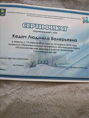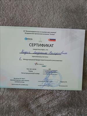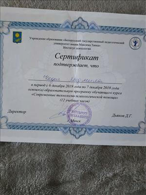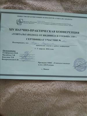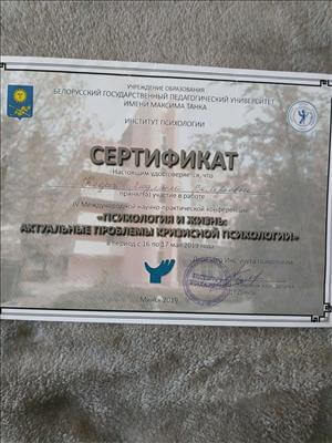 "Білоруський державний педагогічний університет імені М.Танка", кваліфікація психолог. Закінчила 1 ступінь, 2 ступінь гештальт-підхід. Сертифікований гештальт-терапевт.