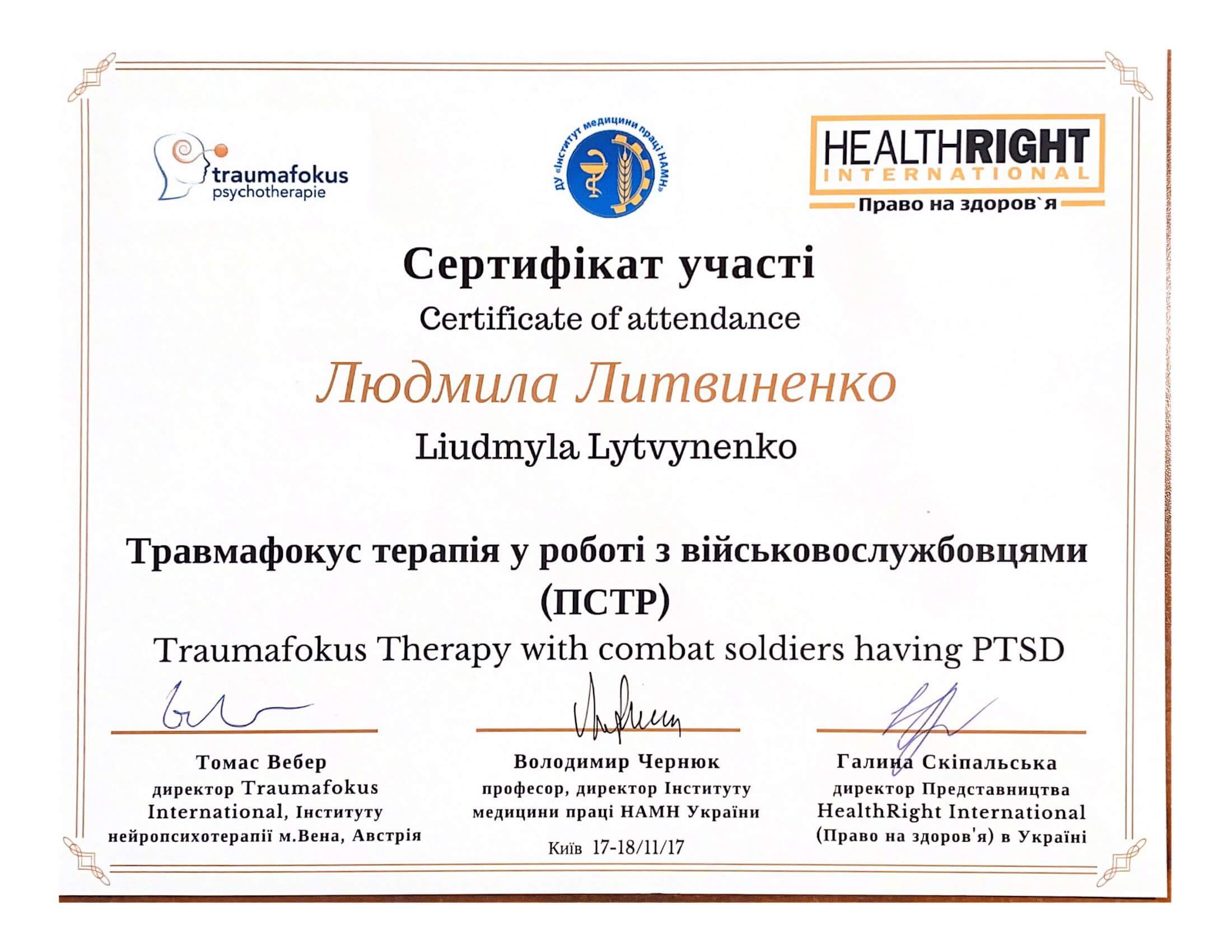 Працювала у різних проектах: Львів (Україна), школа "Консультування та психотерапії", групи особистісного зростання методом психодрами (500 годин).