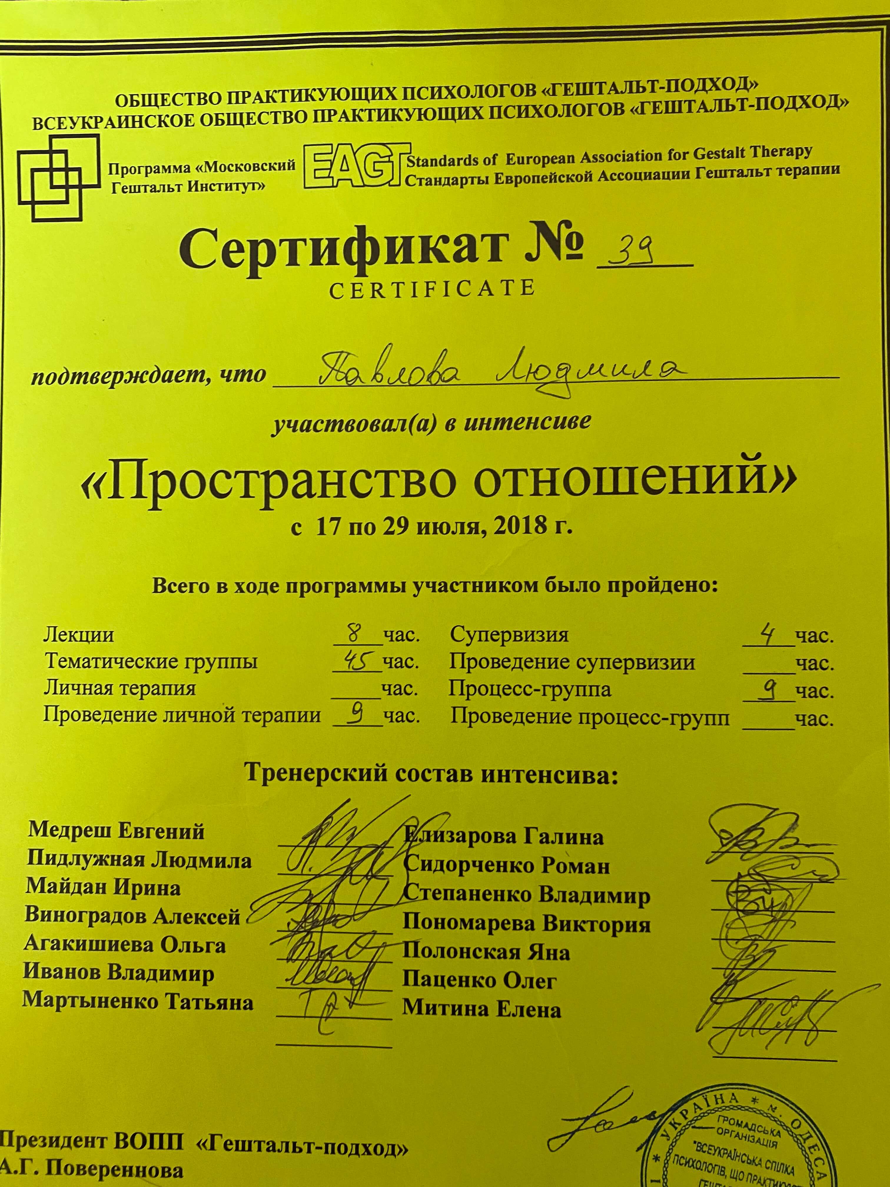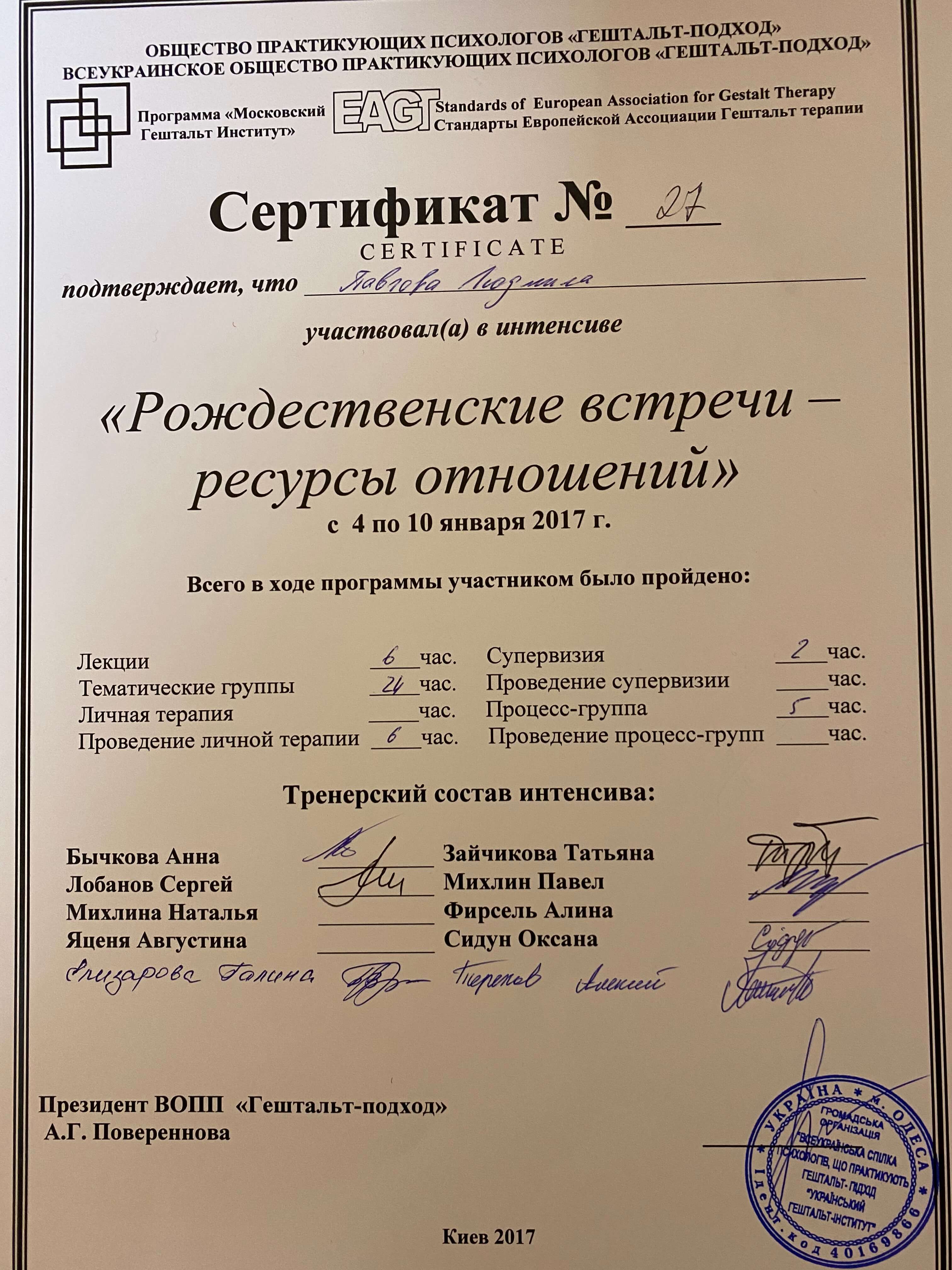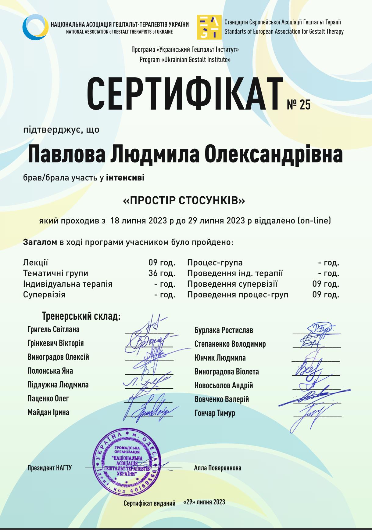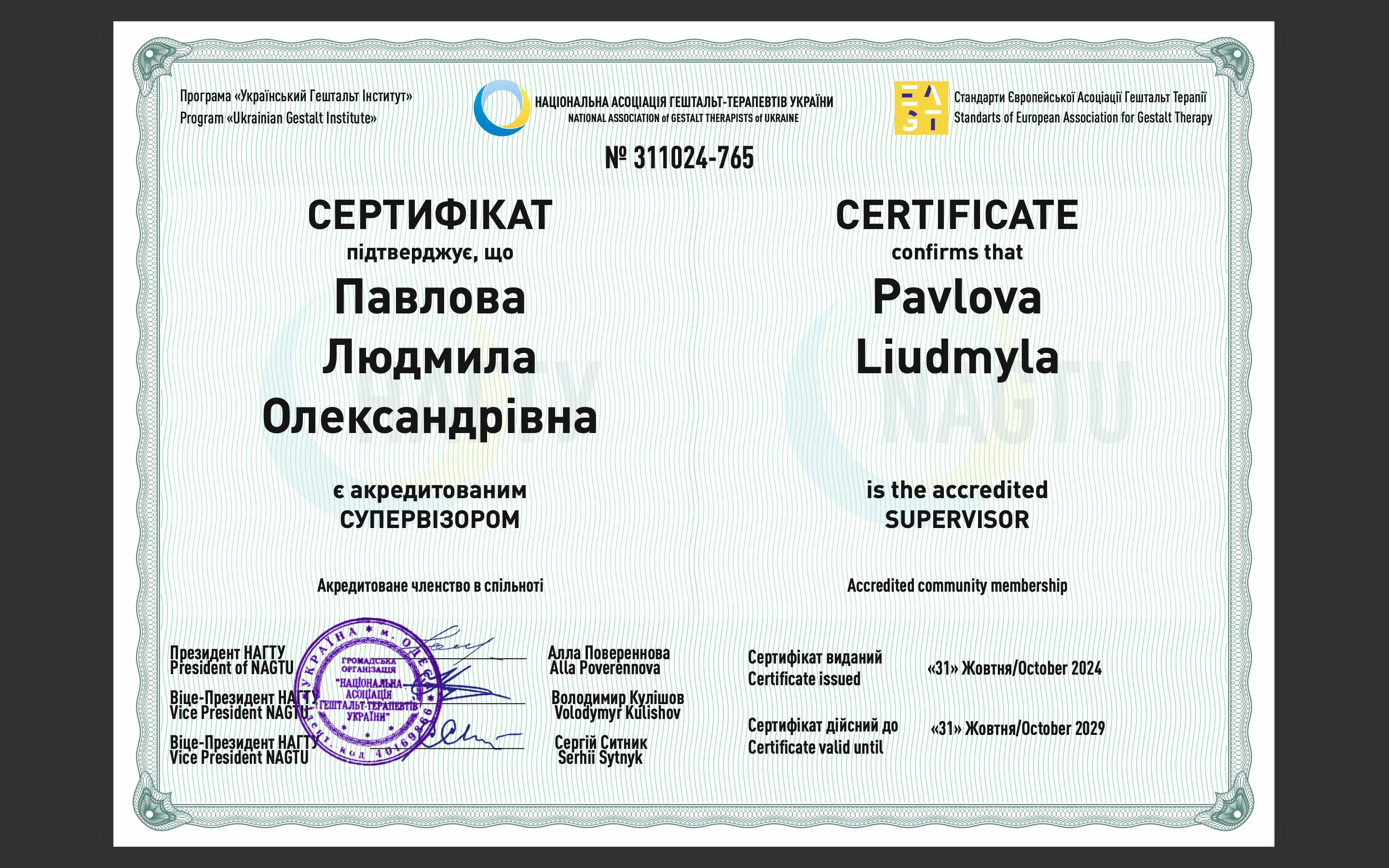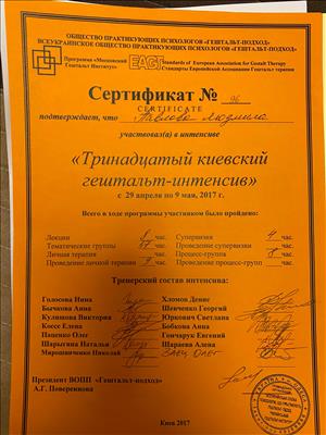 3 ступінь НАГТУ(гештальт) з сертифікацією і акредитацією в якості супервізора 2019-2023 р.