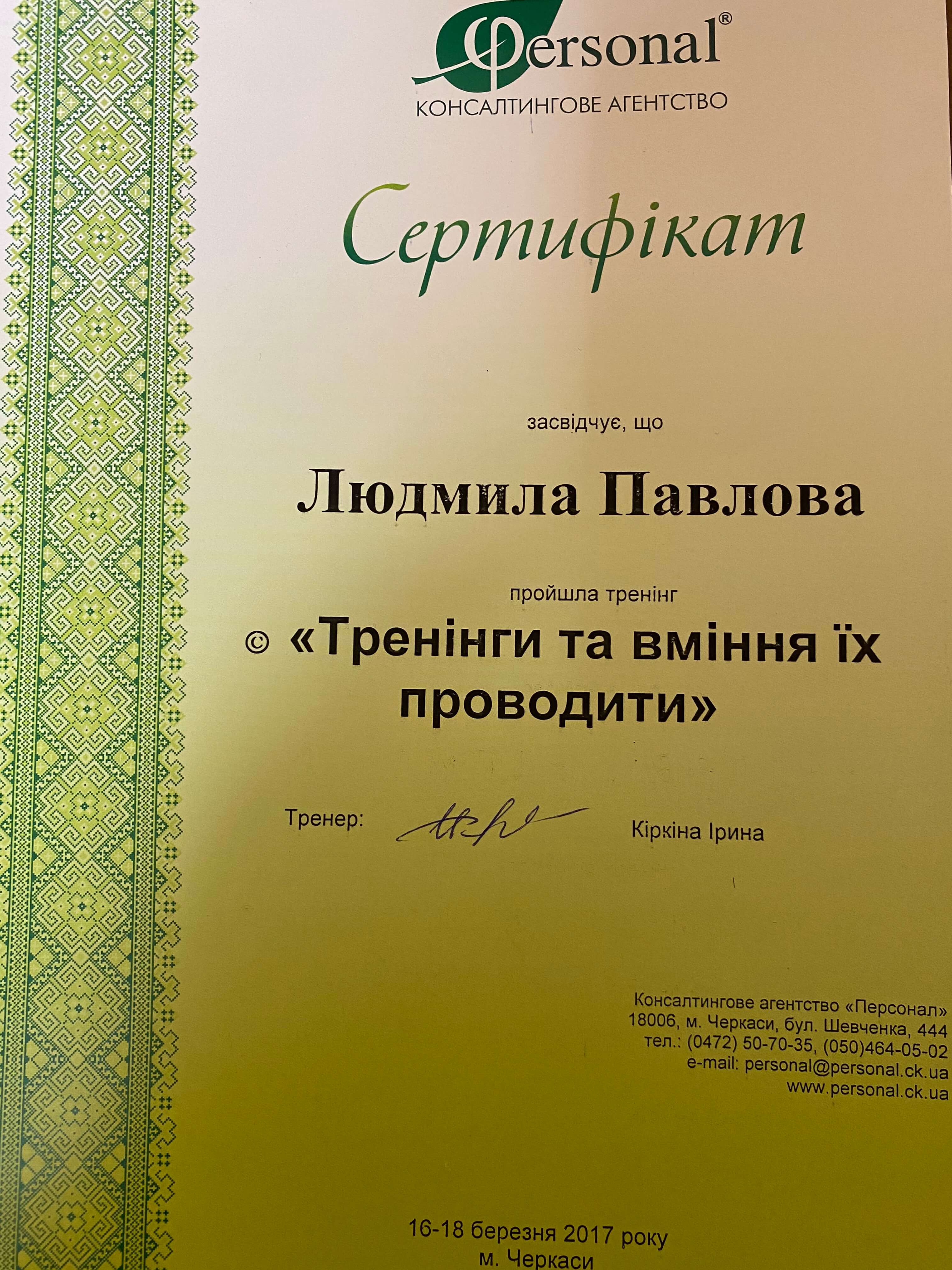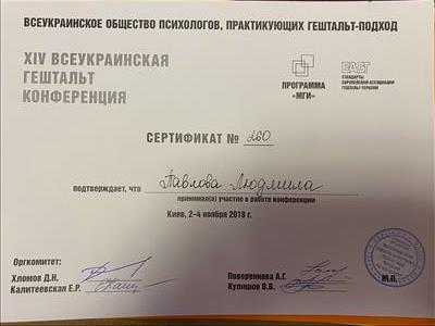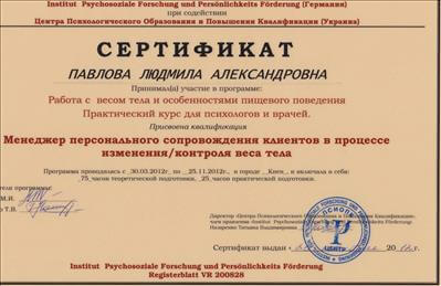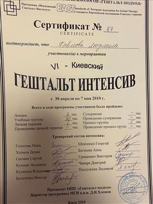 Спеціалізація ОППГП "Робота з психосоматичними розладами у клінічній гештальт-терапії" 2011-1013рр Програма Інституту Психологічної Освіти та Підвищення Кваліфікації (Німеччина) "Робота з вагою тіла та особливостями харчової поведінки" 2012р