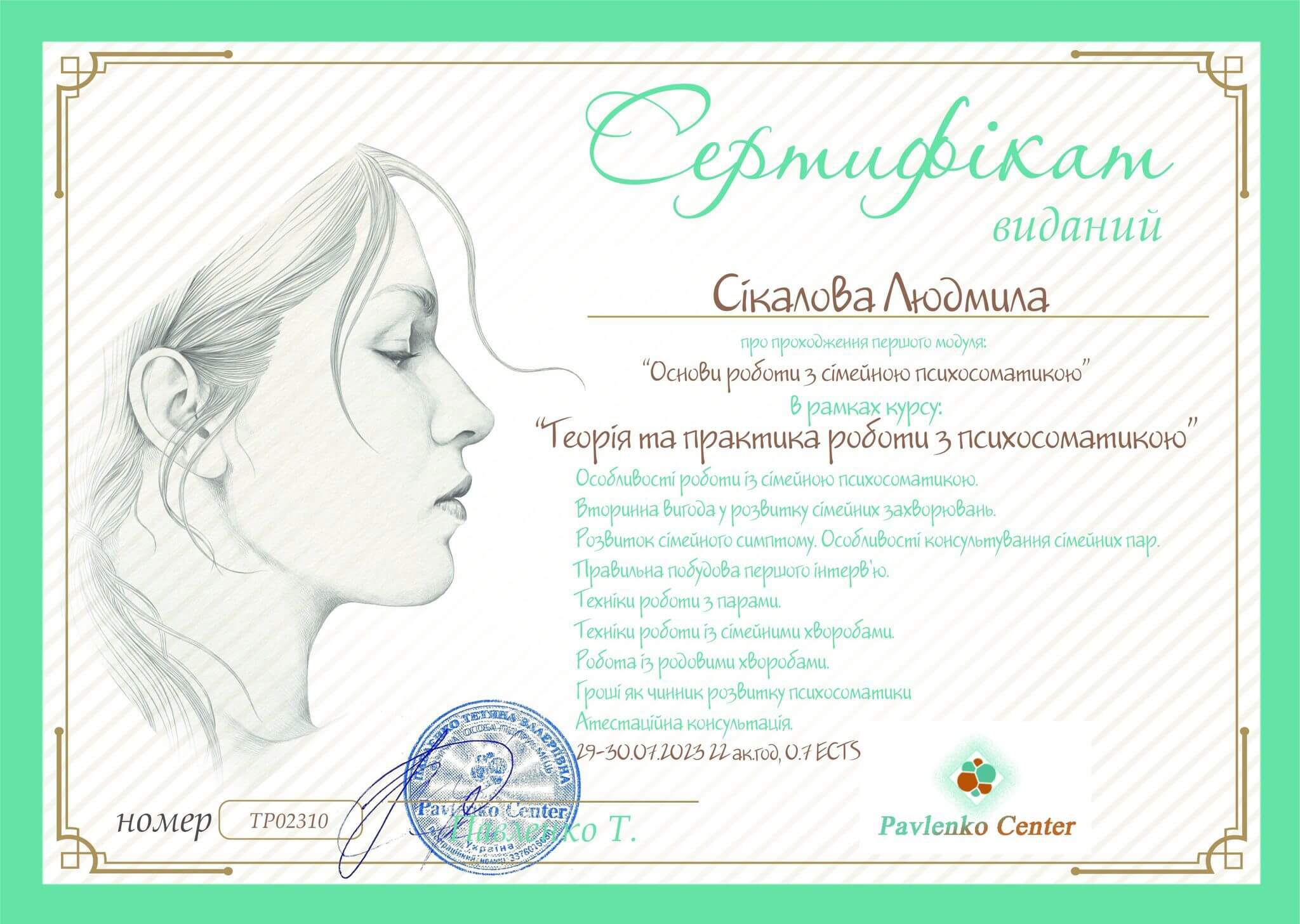 Спеціальність "Практічна психологія", отримала ступінь магістра психології. 2022р.