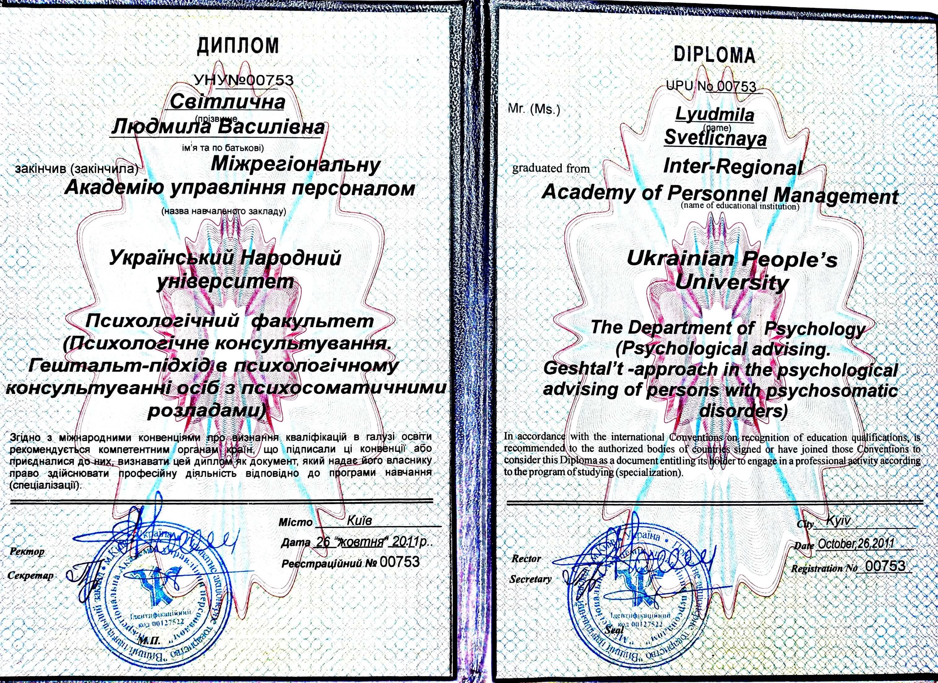 Закінчена вища освіта. Запорізький Національний технічний університет. Магістр психології. Міжрегіональна академія управління персоналом – Гештальт підхід у роботі з психосоматичними розладами.