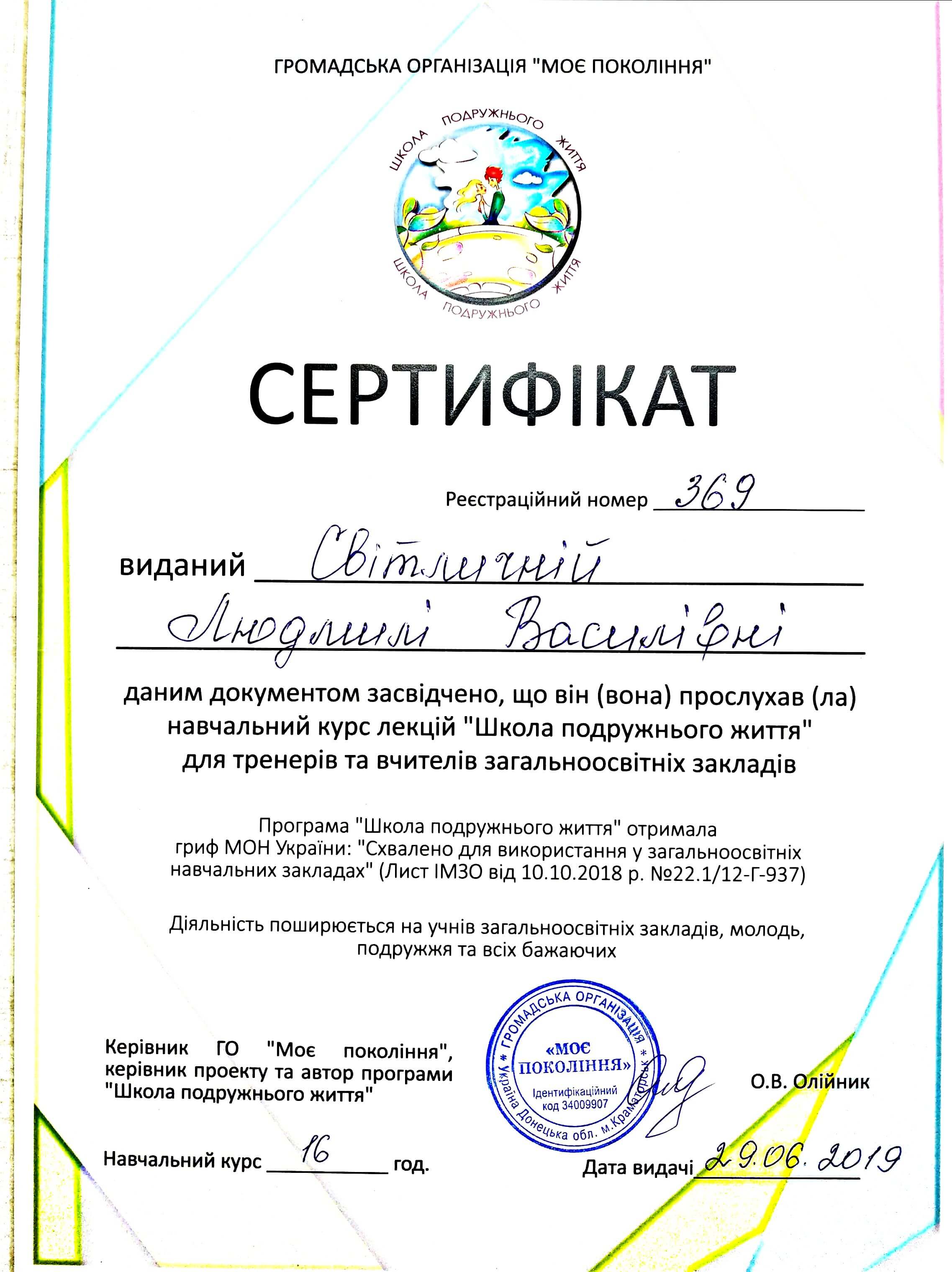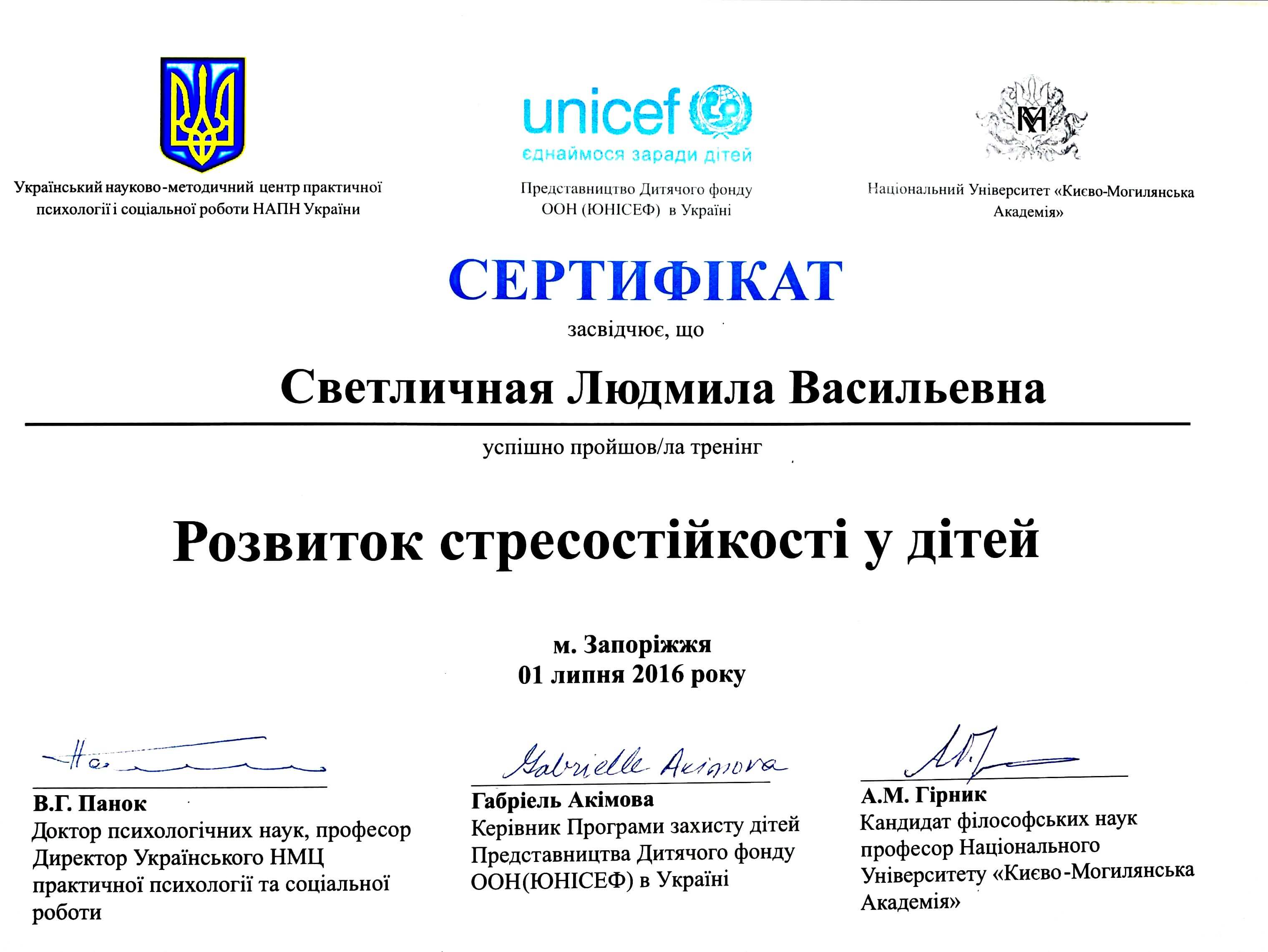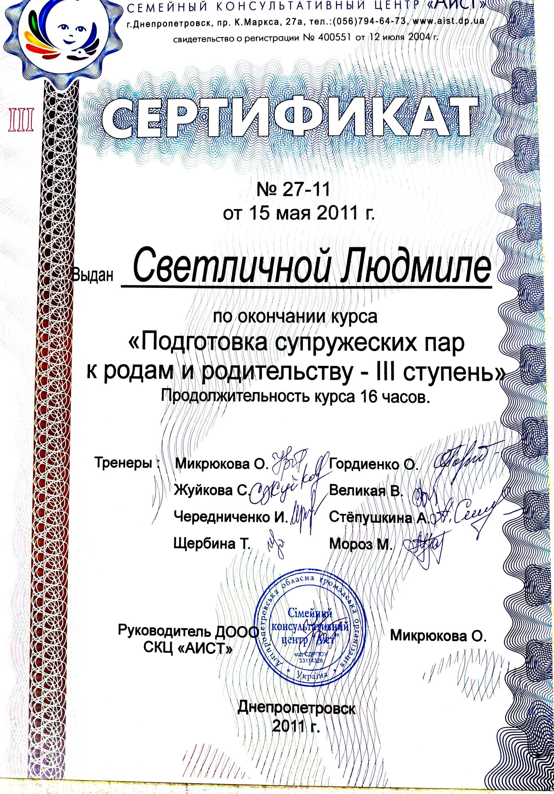 Перинатальна психологія та сімейне консультування – 185 годин; Психотерапія патологічних проявів при переживанні горя та втрати – 104 години;