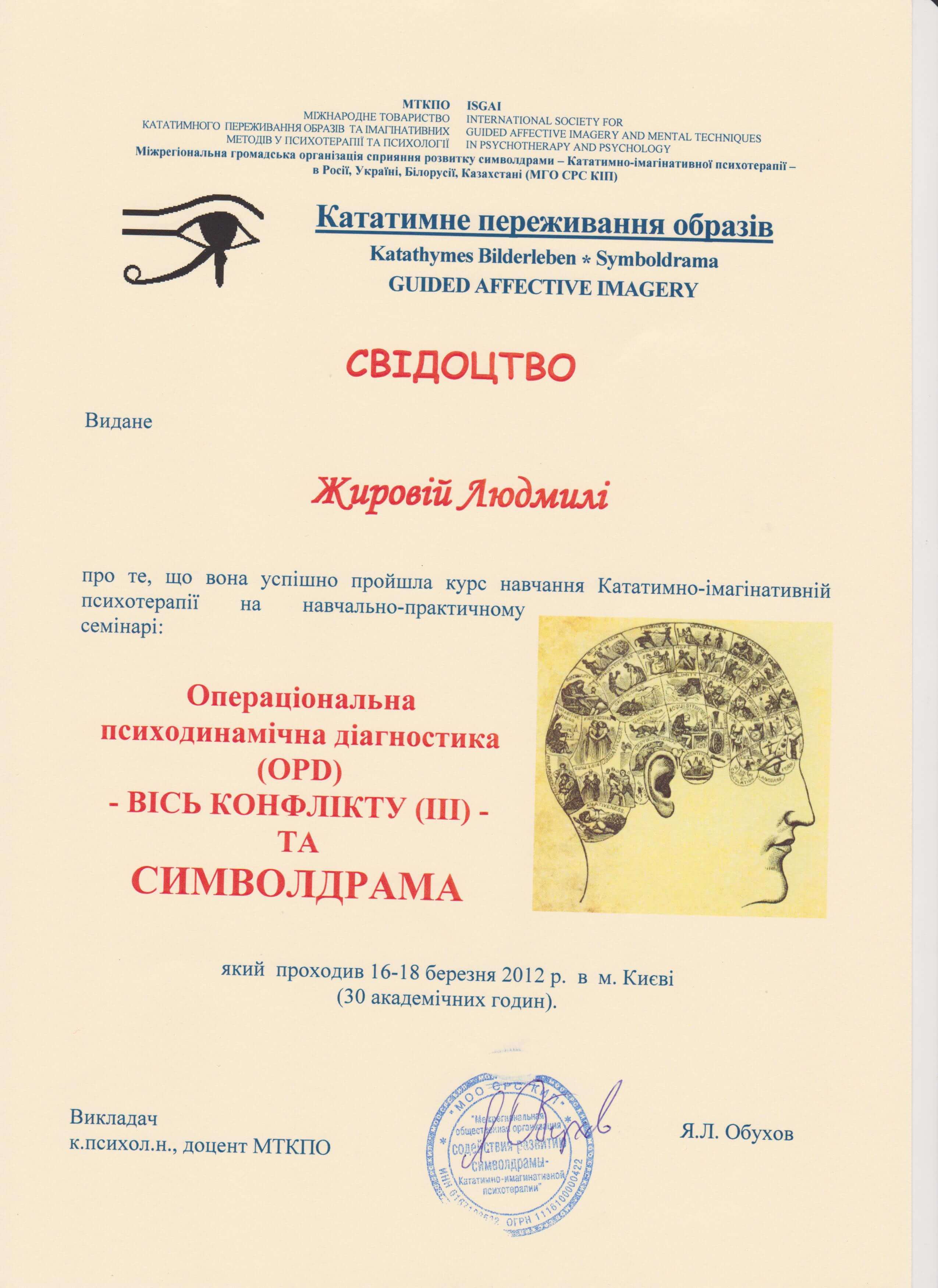 курс підвищення кваліфікації у межах програми багатоетапного навчання кататимно-імагінативній психотерапії, здобувши особистий досвід у ГРУПОВІЙ ТЕРАПІЇ