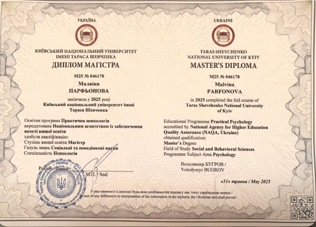 - Магістр практичної психології, Київський національний університет імені Тараса Шевченка.