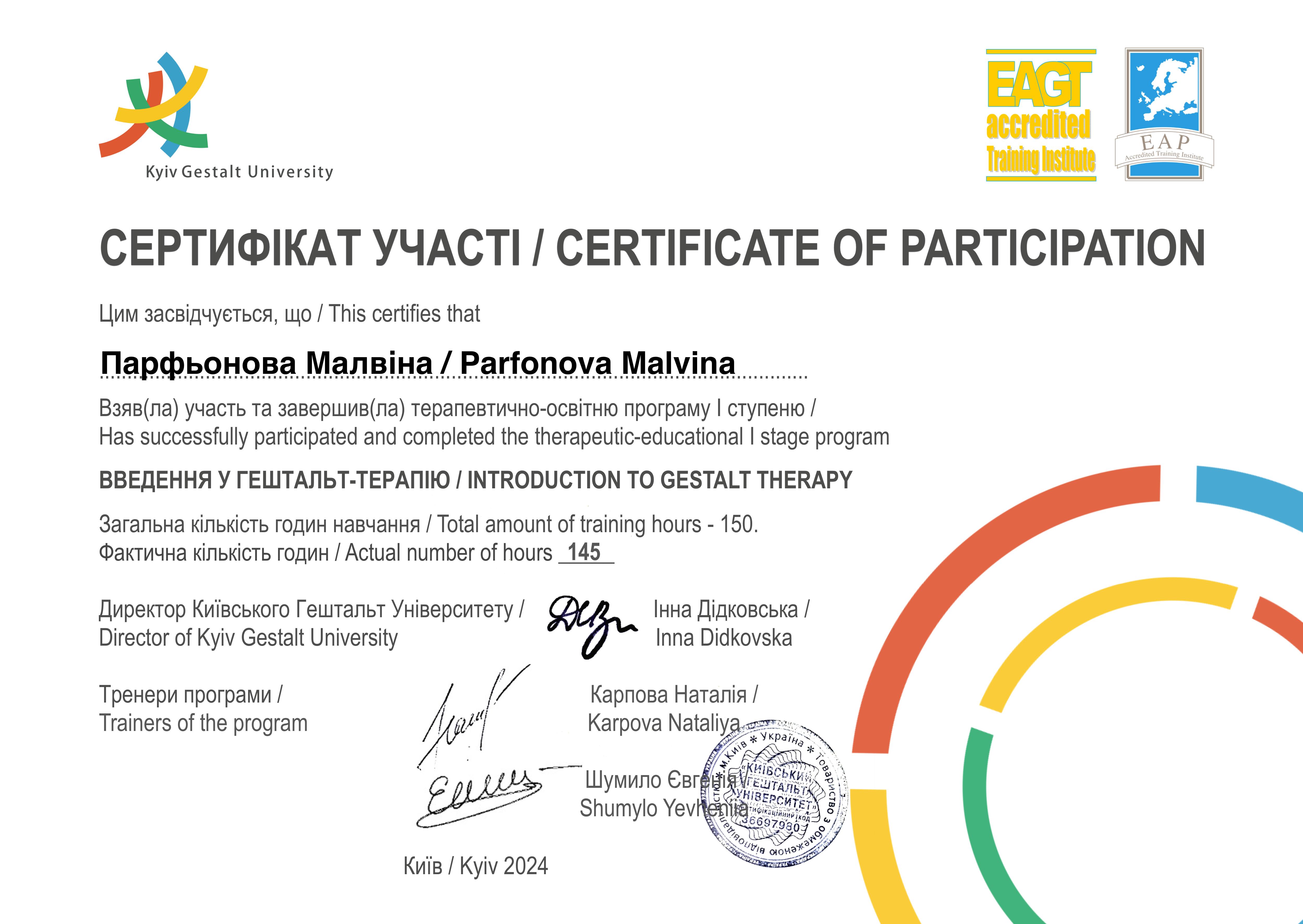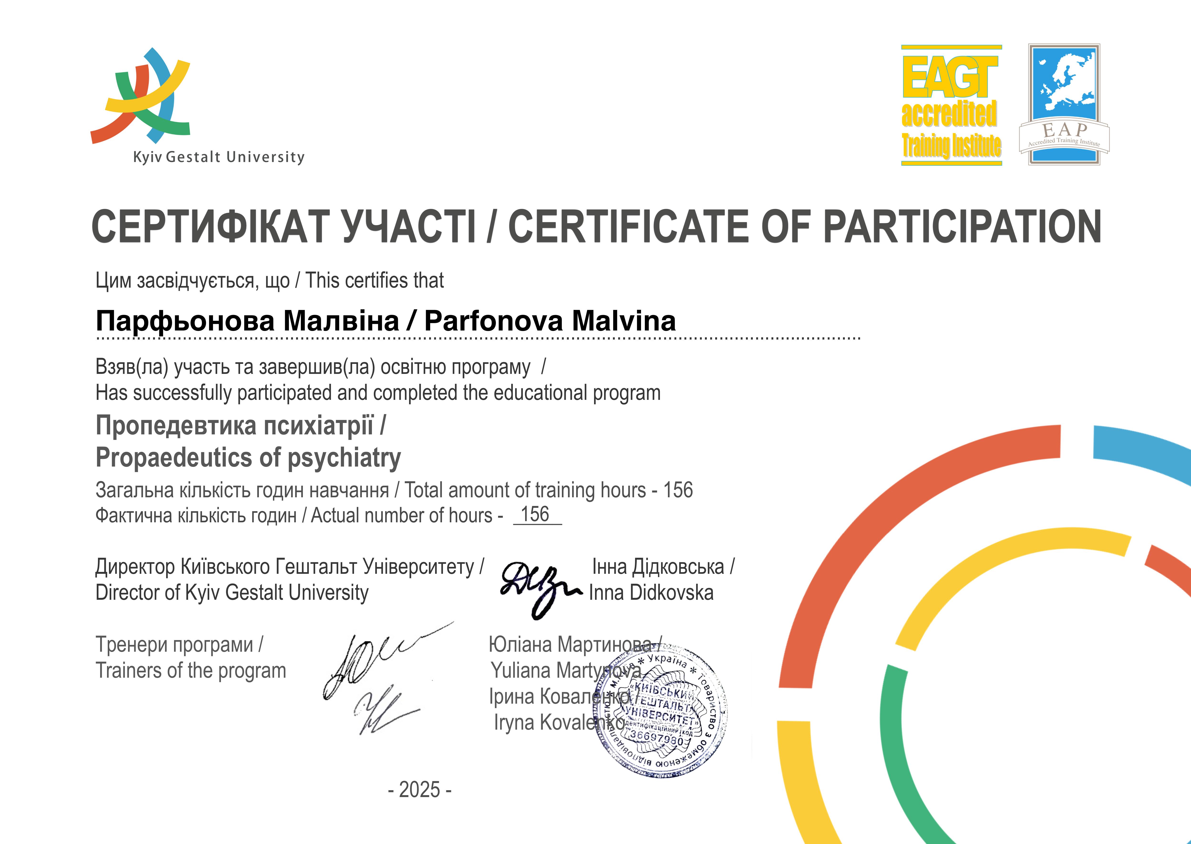 - Гештальт-терапевт у навчанні, 2-й ступінь, Київський Гештальт Університет.