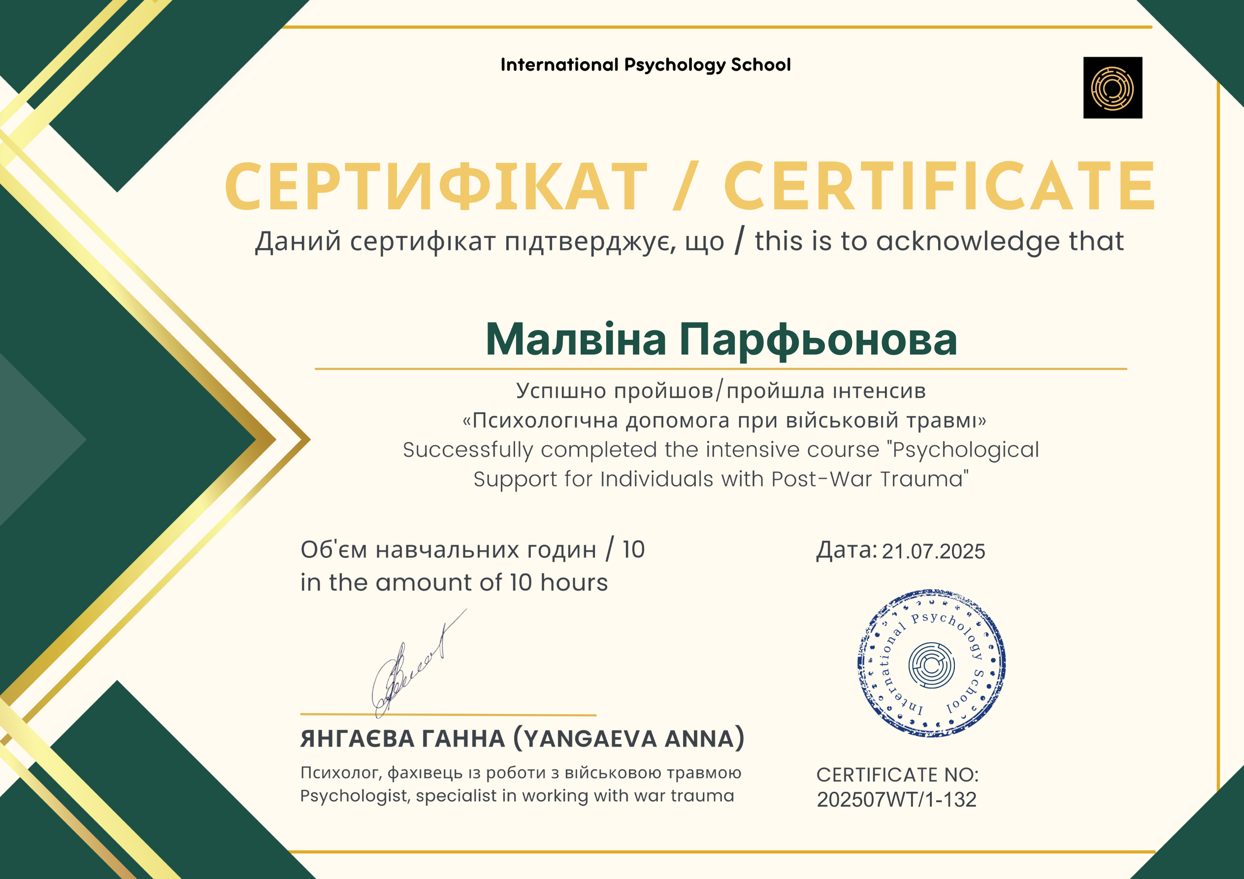 Маю диплом магістра практичної психології та проходжу навчання на другому ступені на гештальт-терапевта в Київському Гештальт Університеті. Одружена 11 років, мама чудового сина, який має РДУГ, тож добре розумію, як виглядають реальні щоденні виклики й пошуки балансу між сім’єю, роботою та турботою про себе.
