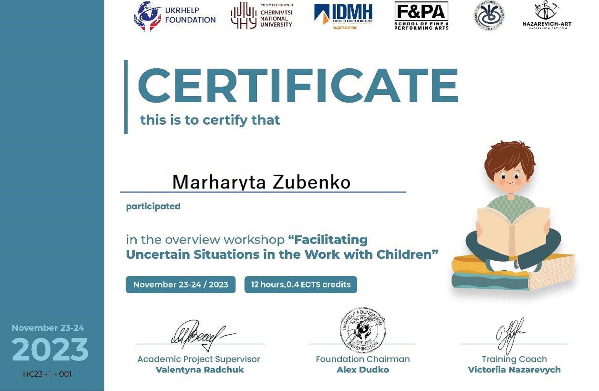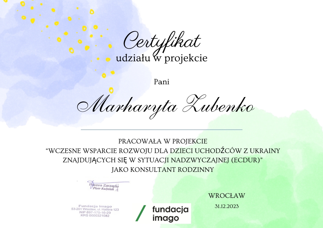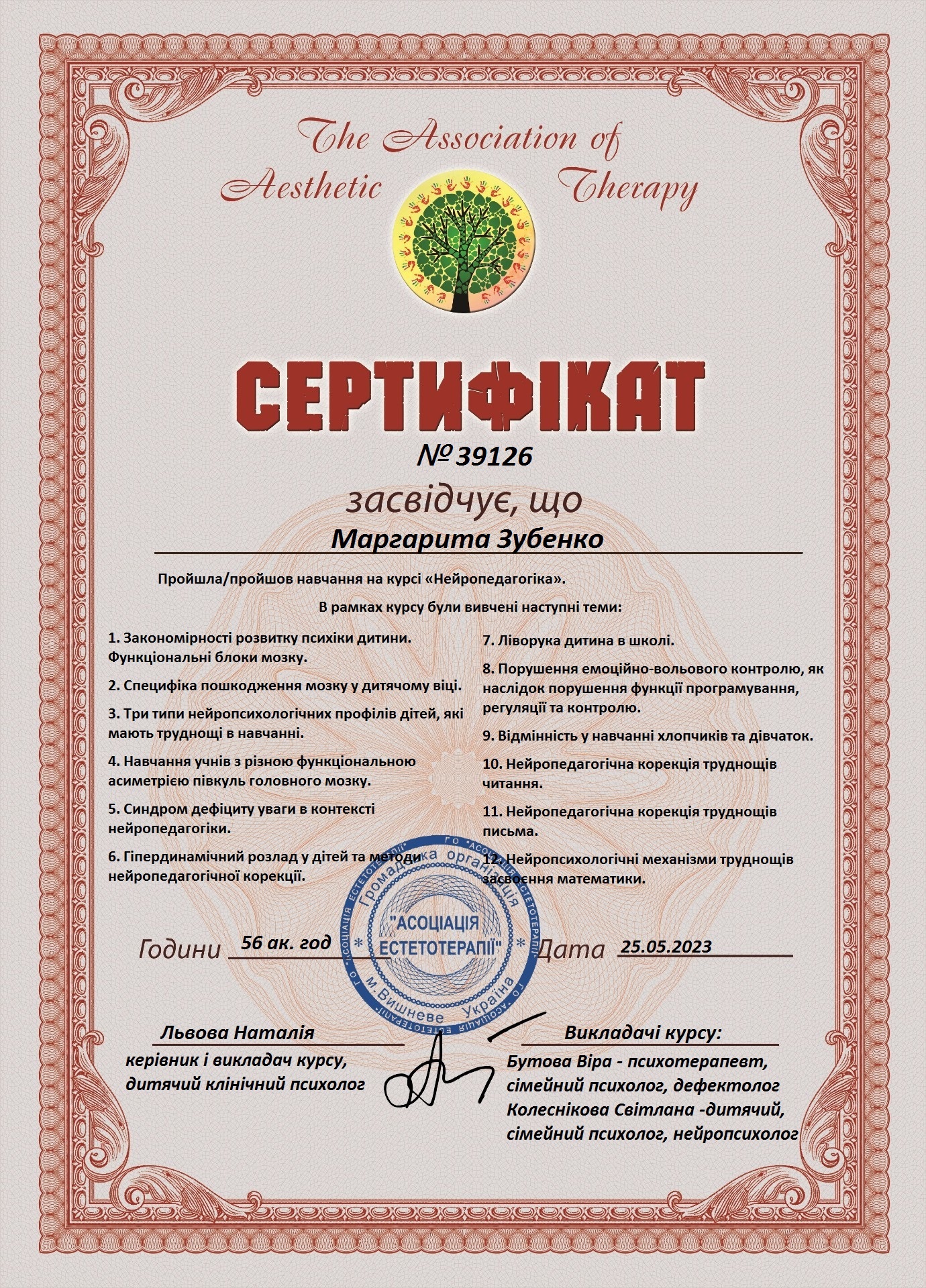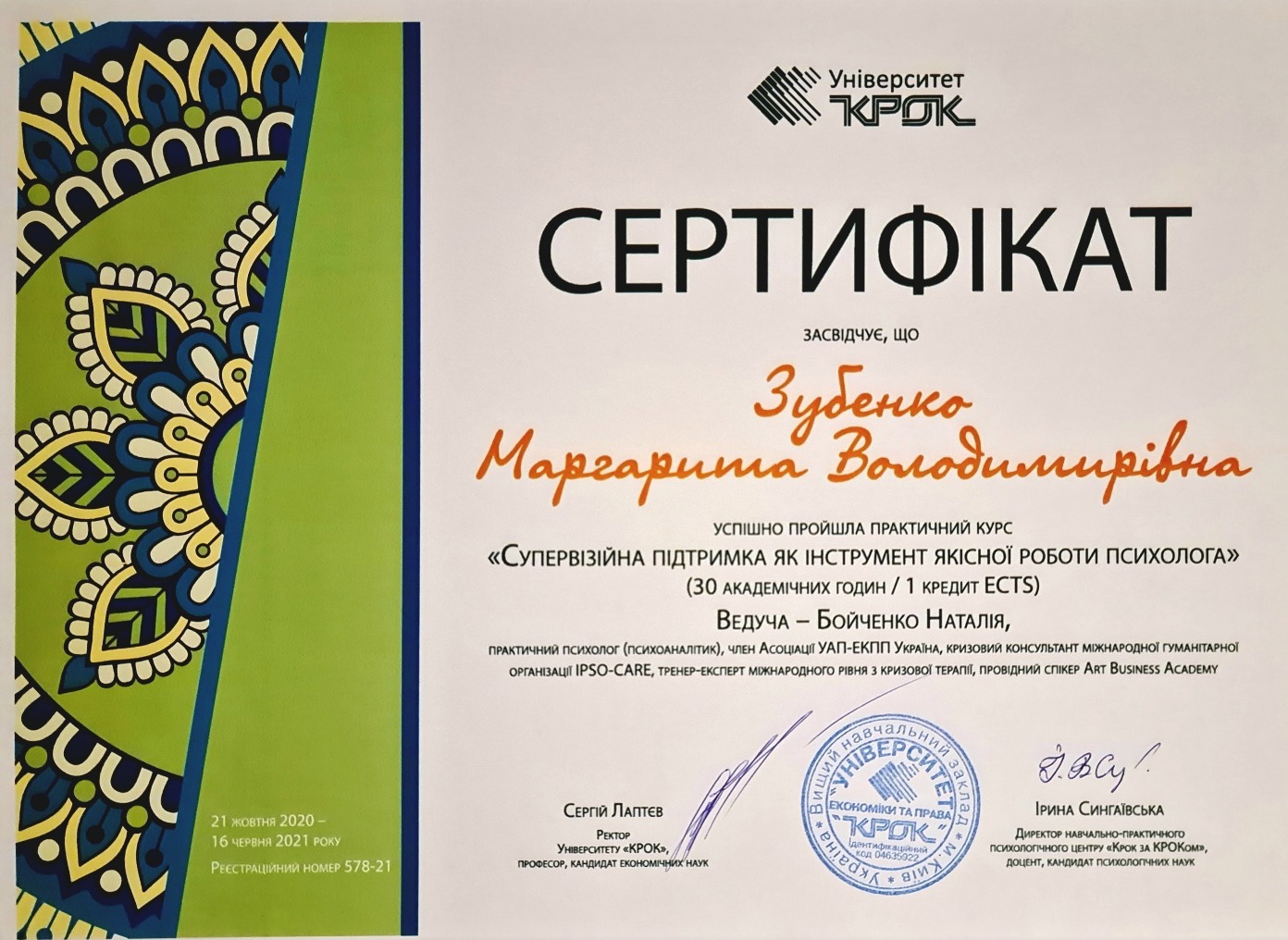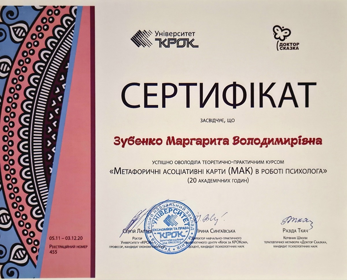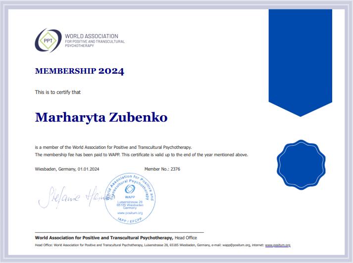 За освітою я магістр психології, маю диплом з відзнакою, працюю в методі Позитивної Психотерапії Пезешкіана (WAPP PPT), що є загально визнаним методом, та входить до Європейської асоціації психотерапевтів.