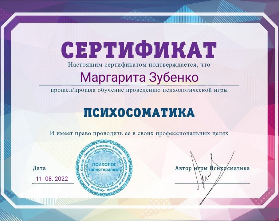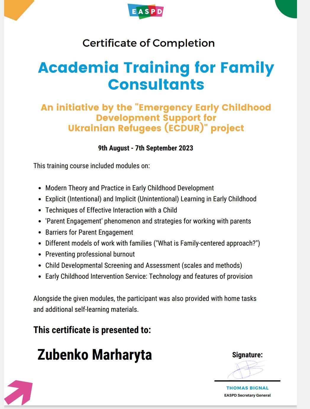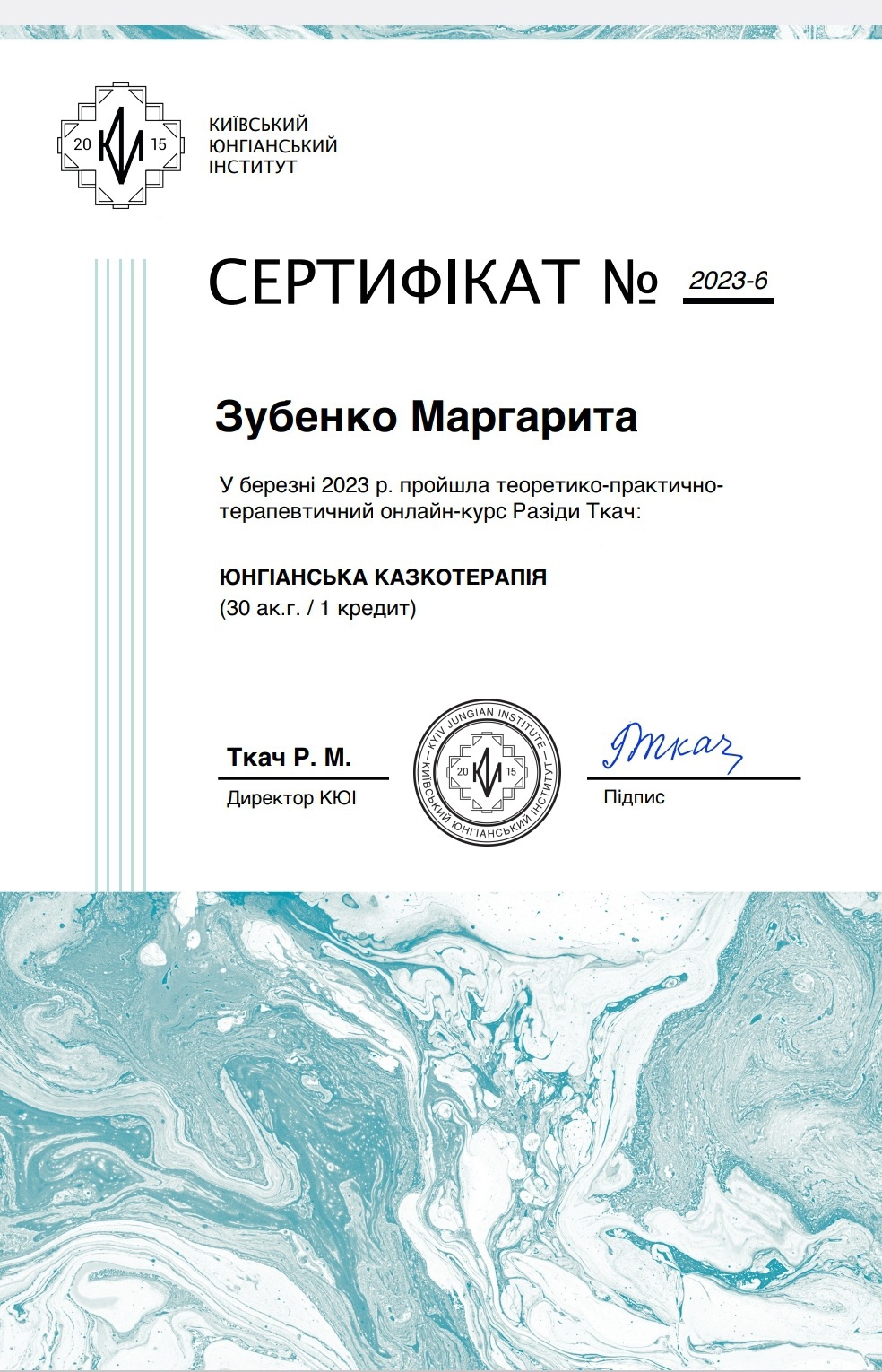 Я магістр психології, член WAPP PPT (що входить до Європейської асоціації психотерапевтів), дитячий психолог, кризовий психолог, арт-терапевт, ігропрактик.
