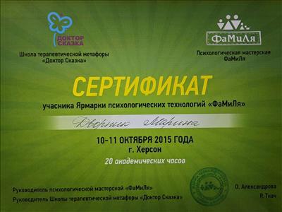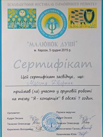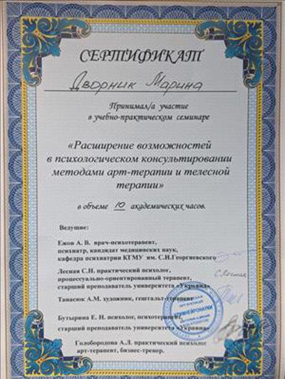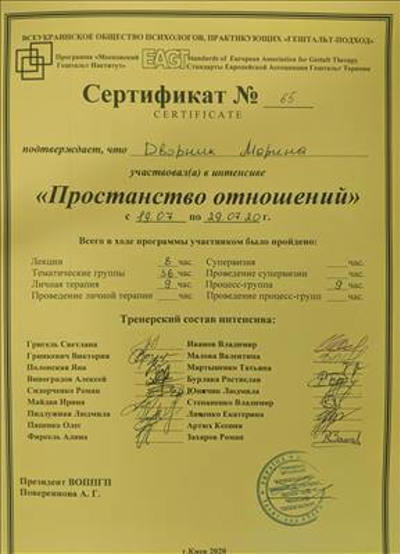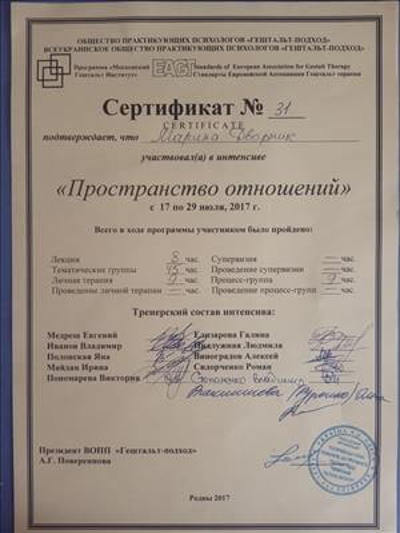 Гештальт-консультант (2019), гештальт-терапевт (сертифікація у 2022), Всеукраїнська спілка психологів, що практикують гештальт-підхід - "Український Гештальт Інститут".