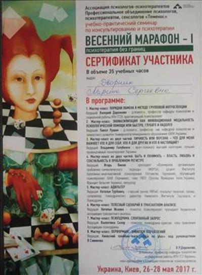 105 год. Науково-практичний семінар з консультування та психотерапії «Психотерапія без кордонів». Асоціація психологів-психотерапевтів, Професійна асоціація психологів, психотерапевтів, сексологів "Теменос", Київ, Україна, 2019, 2017.