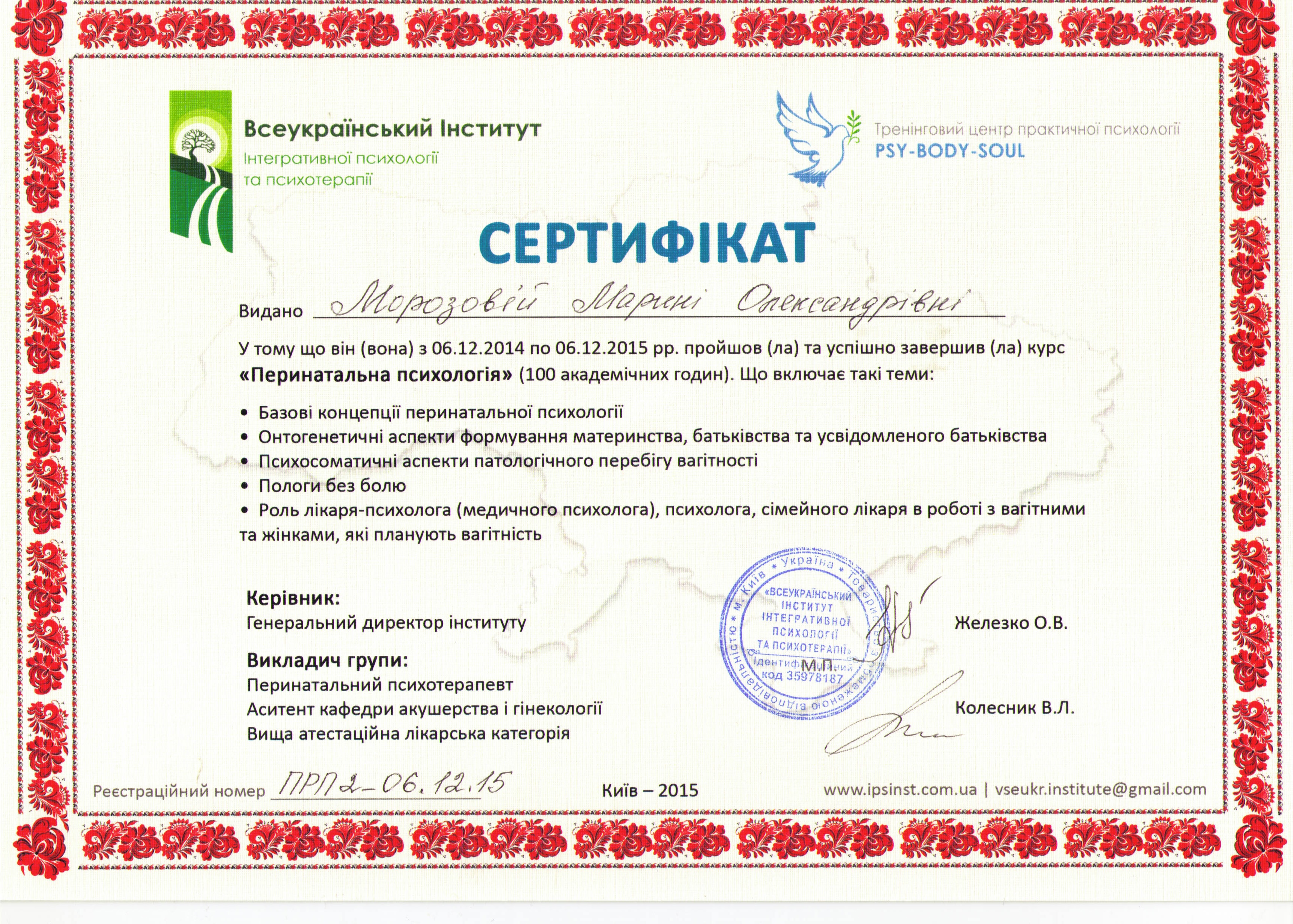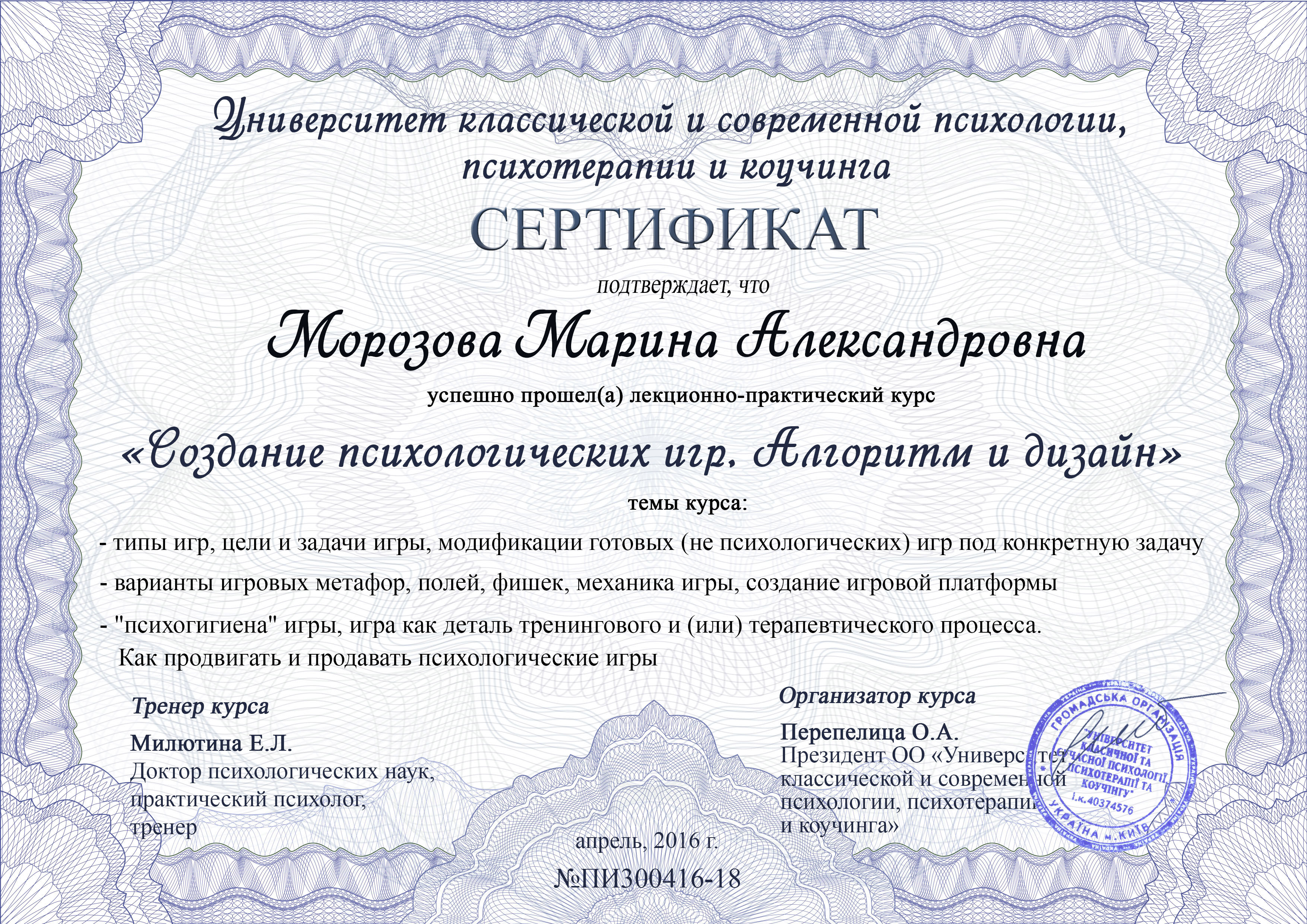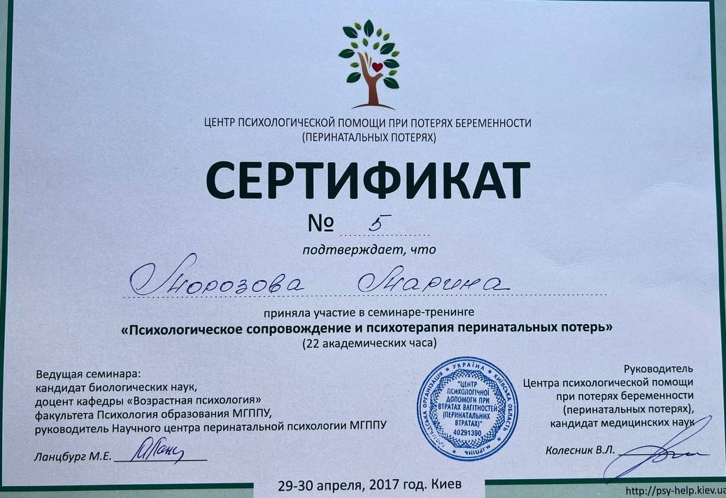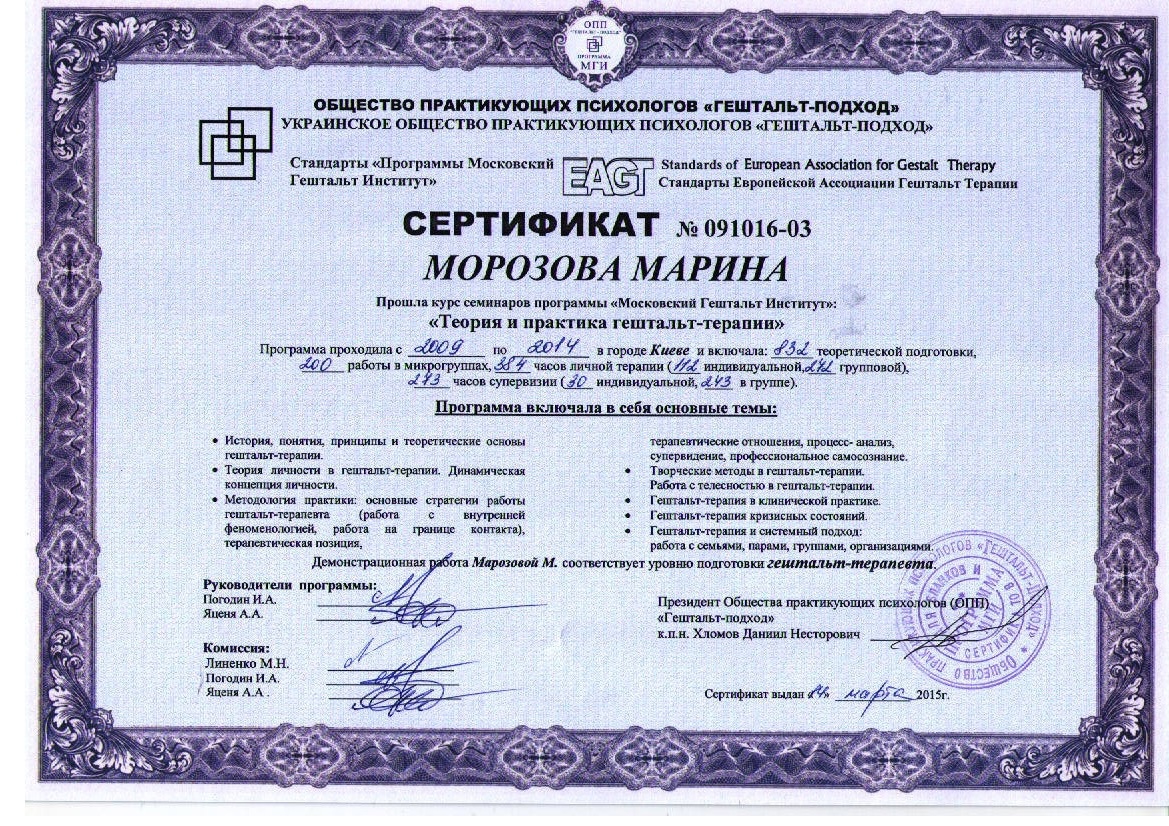 - Гештальт-терапевт, сертифікована Московським Гештальт Інститутом