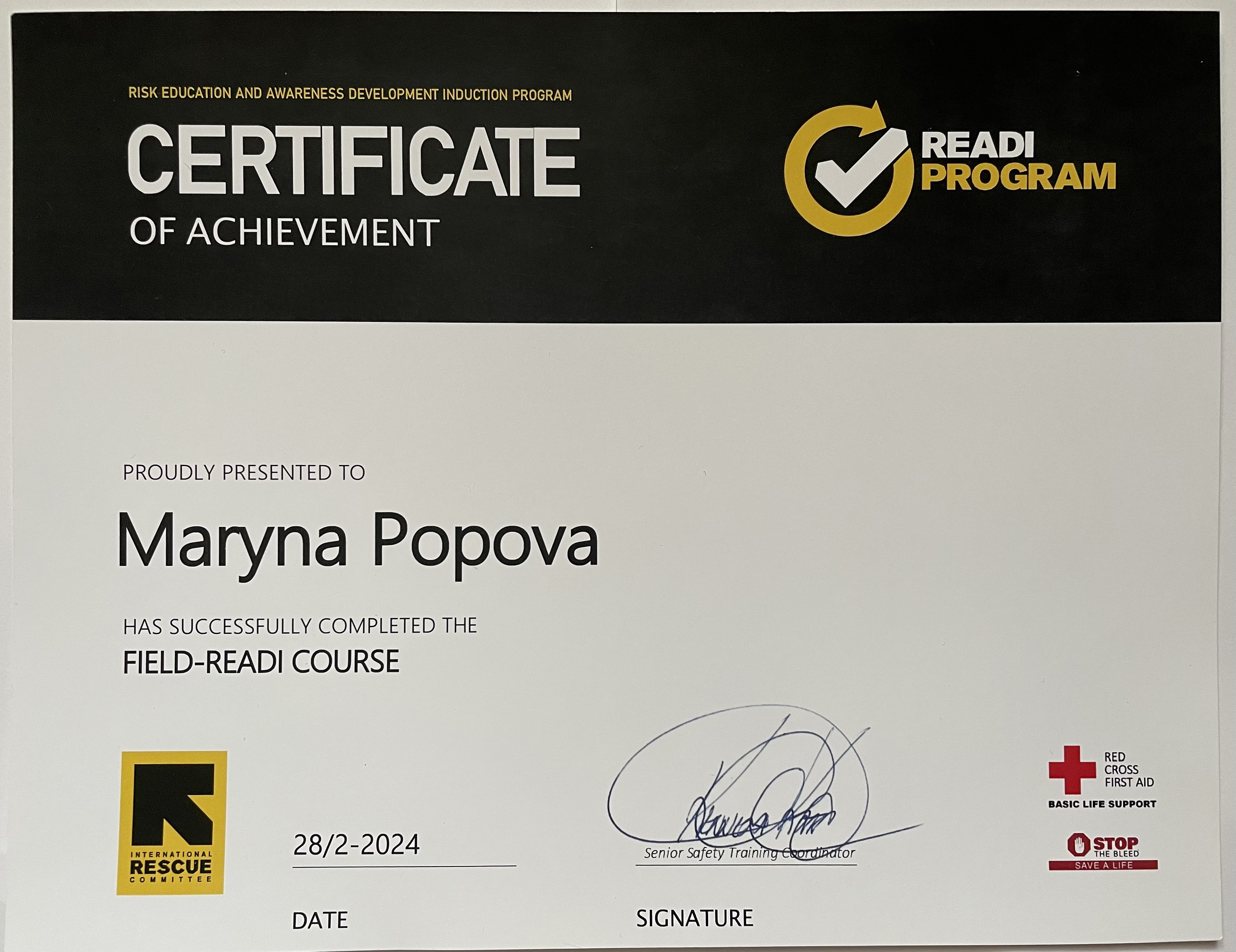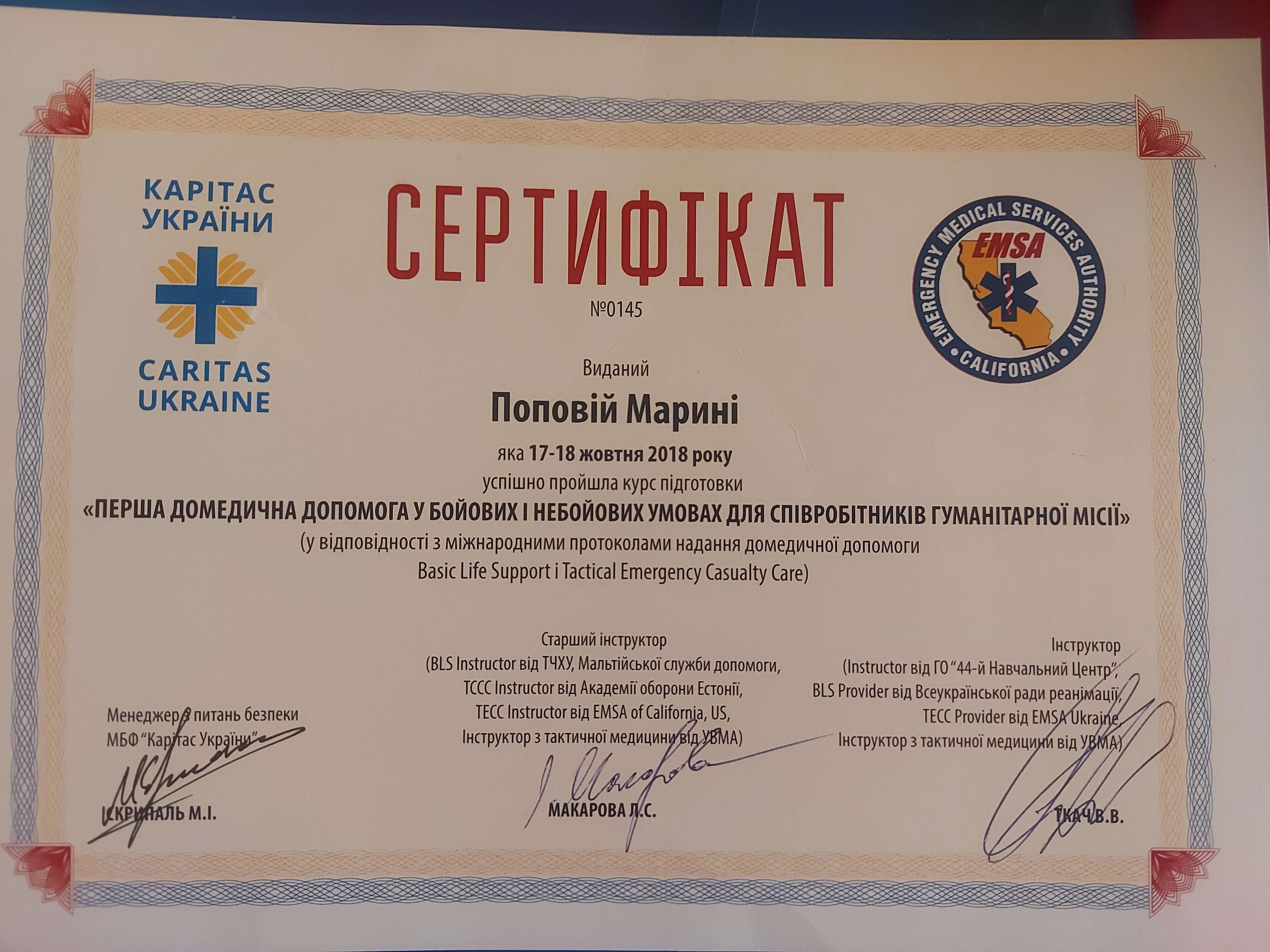 2018 курс підготовки «Перша домедична допомога у бойових та не бойових умовах для співробітників гуманітарної місії»