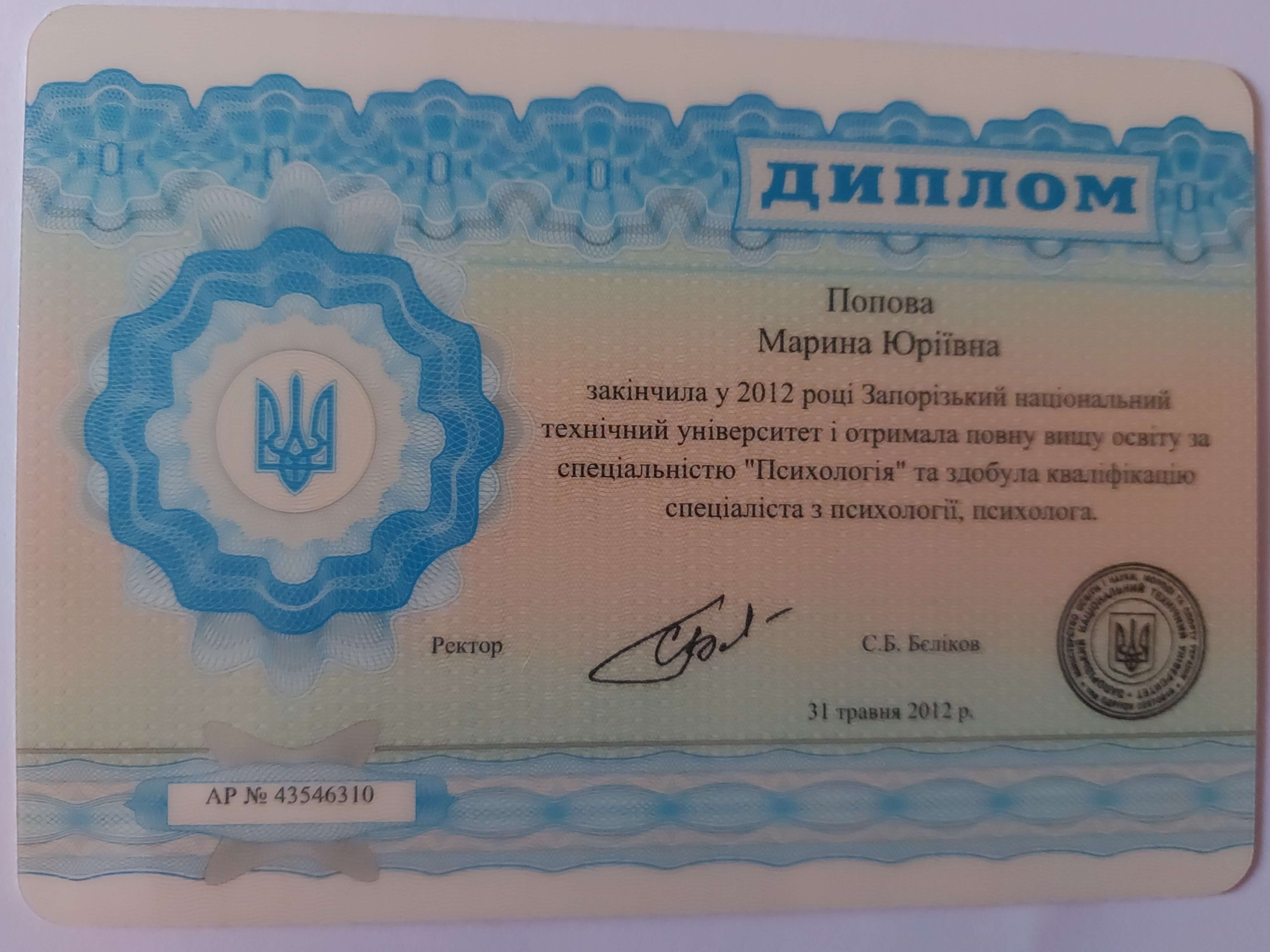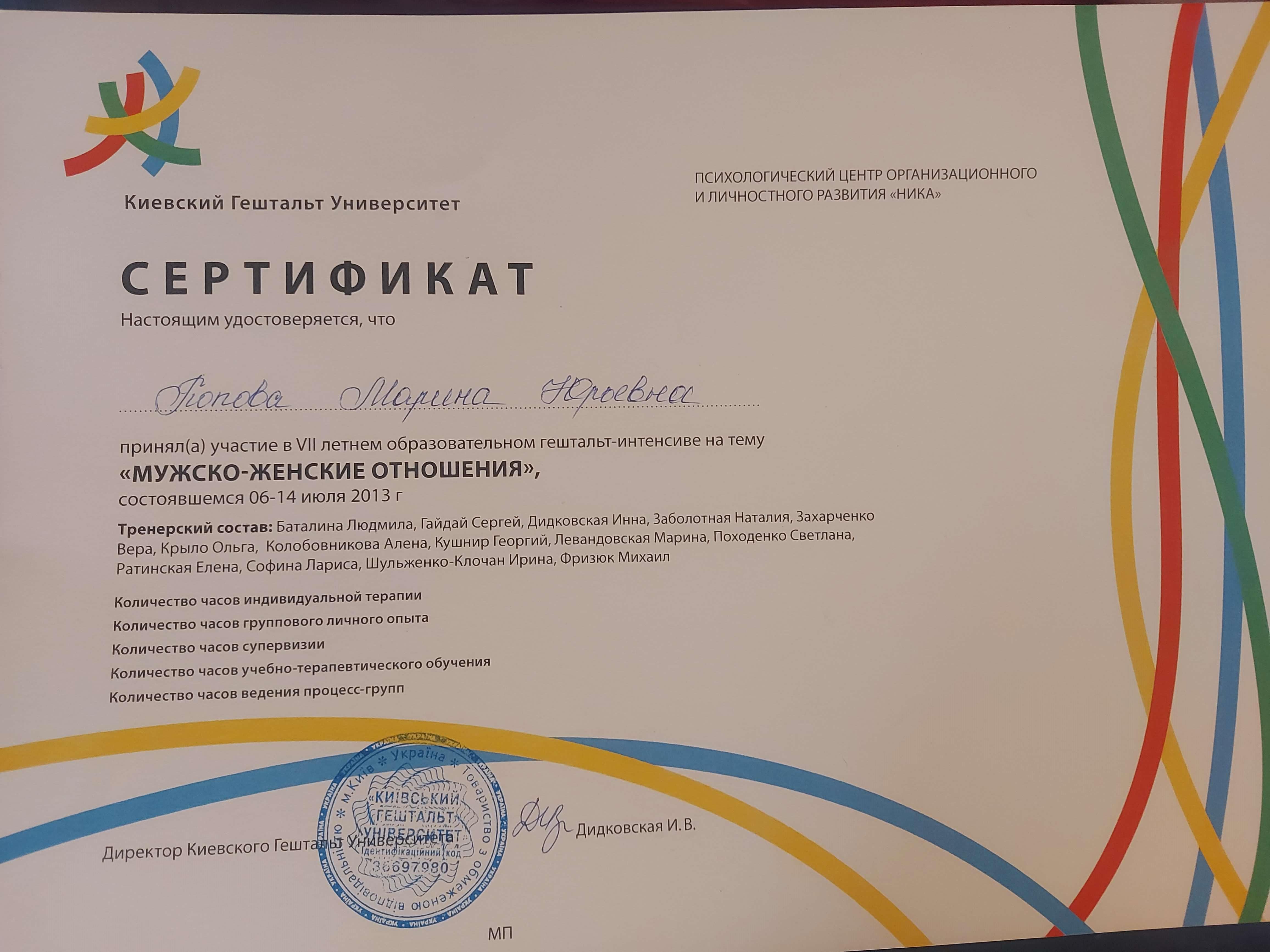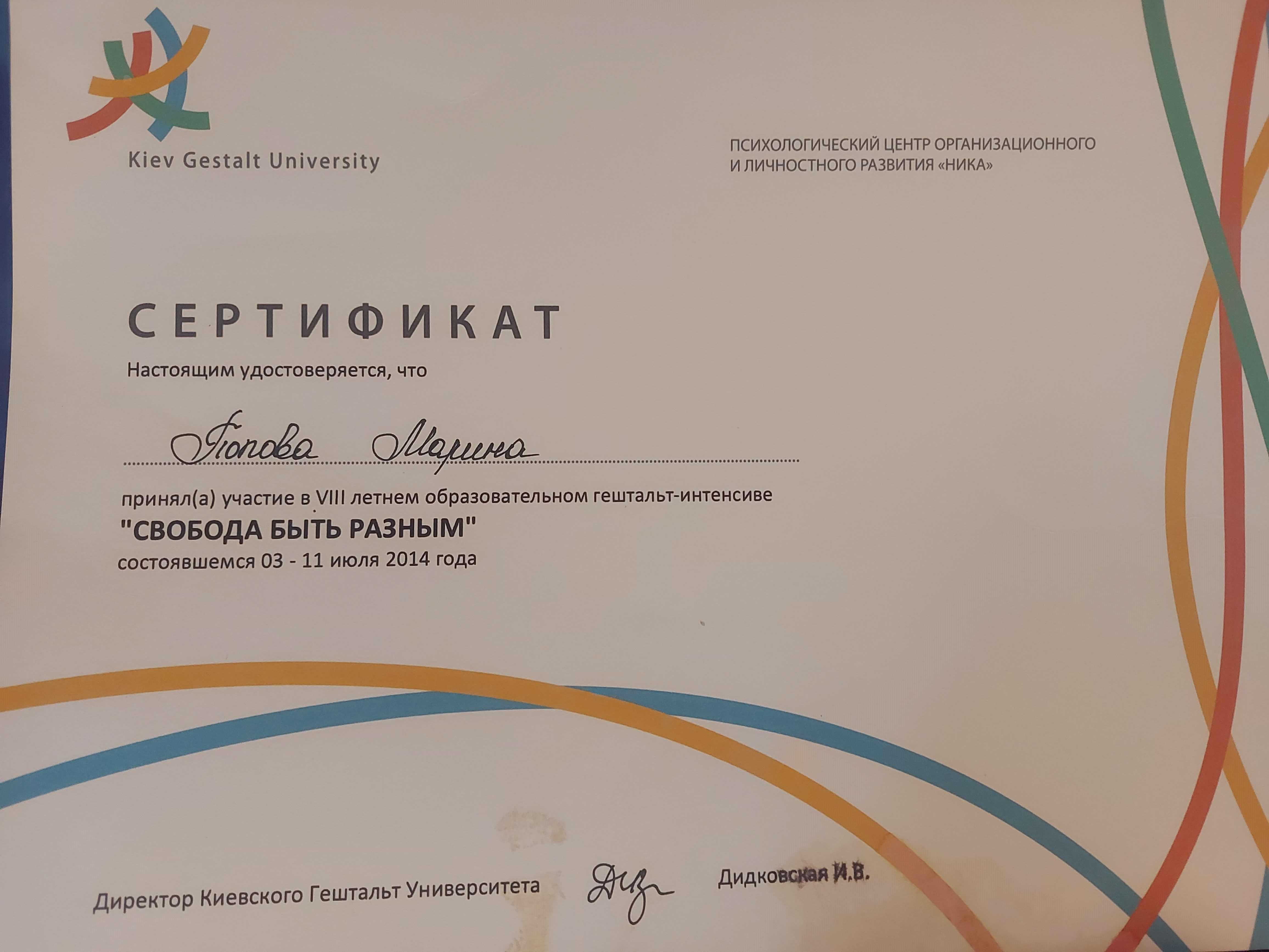 2011 - 2014 - Київський гештальт університет, 1-2 ступінь підвищення професійної кваліфікації у галузі практичної психології та психотерапії.