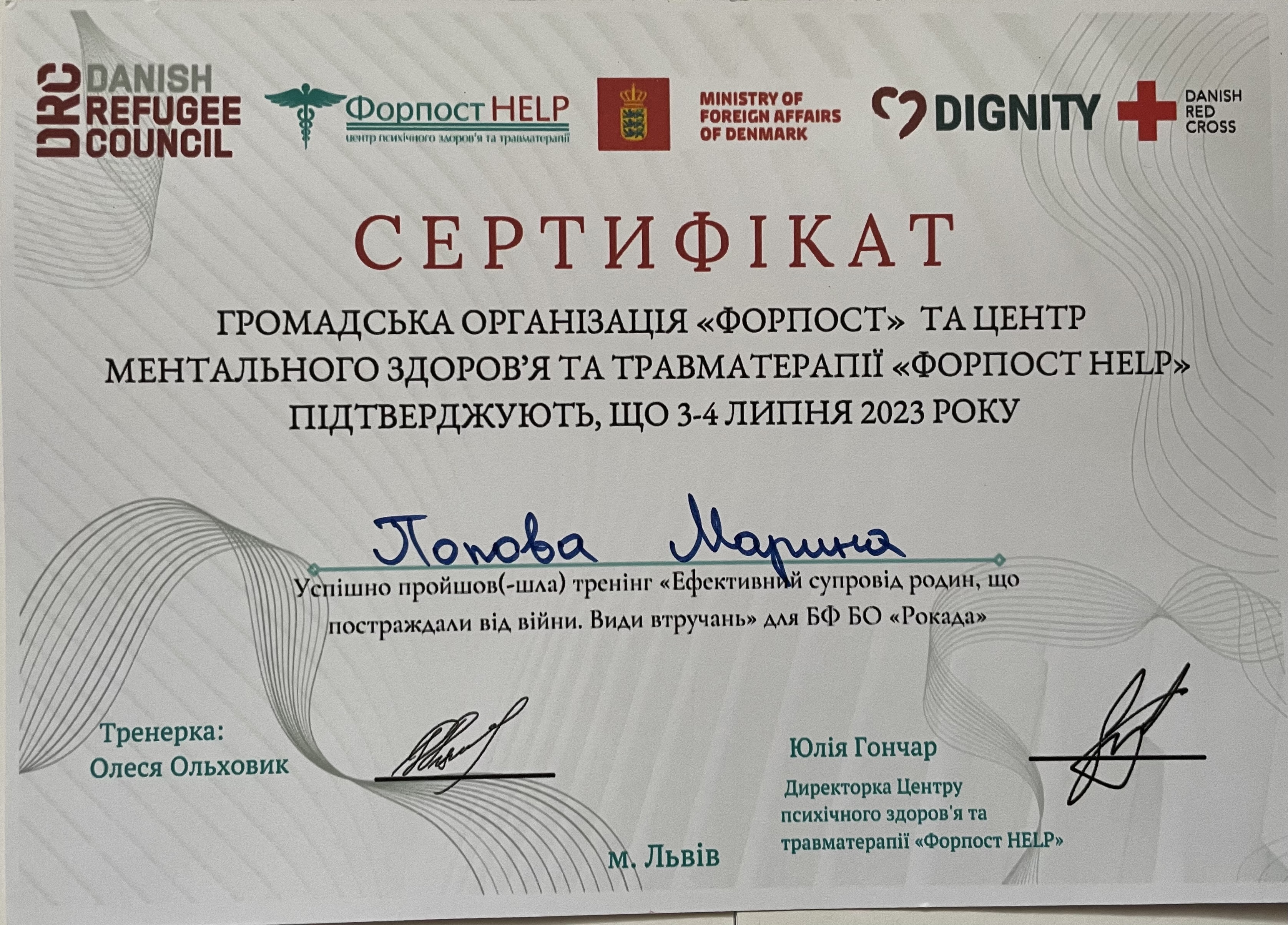 2019 Підвищення професійної кваліфікації програма «Управління проблемами +, створення груп взаємопідтримки та допомоги для осіб, які перебувають у складних життєвих обставинах або потерпілих від стресових подій. Український інститут когнітивно-поведінкової терапії.