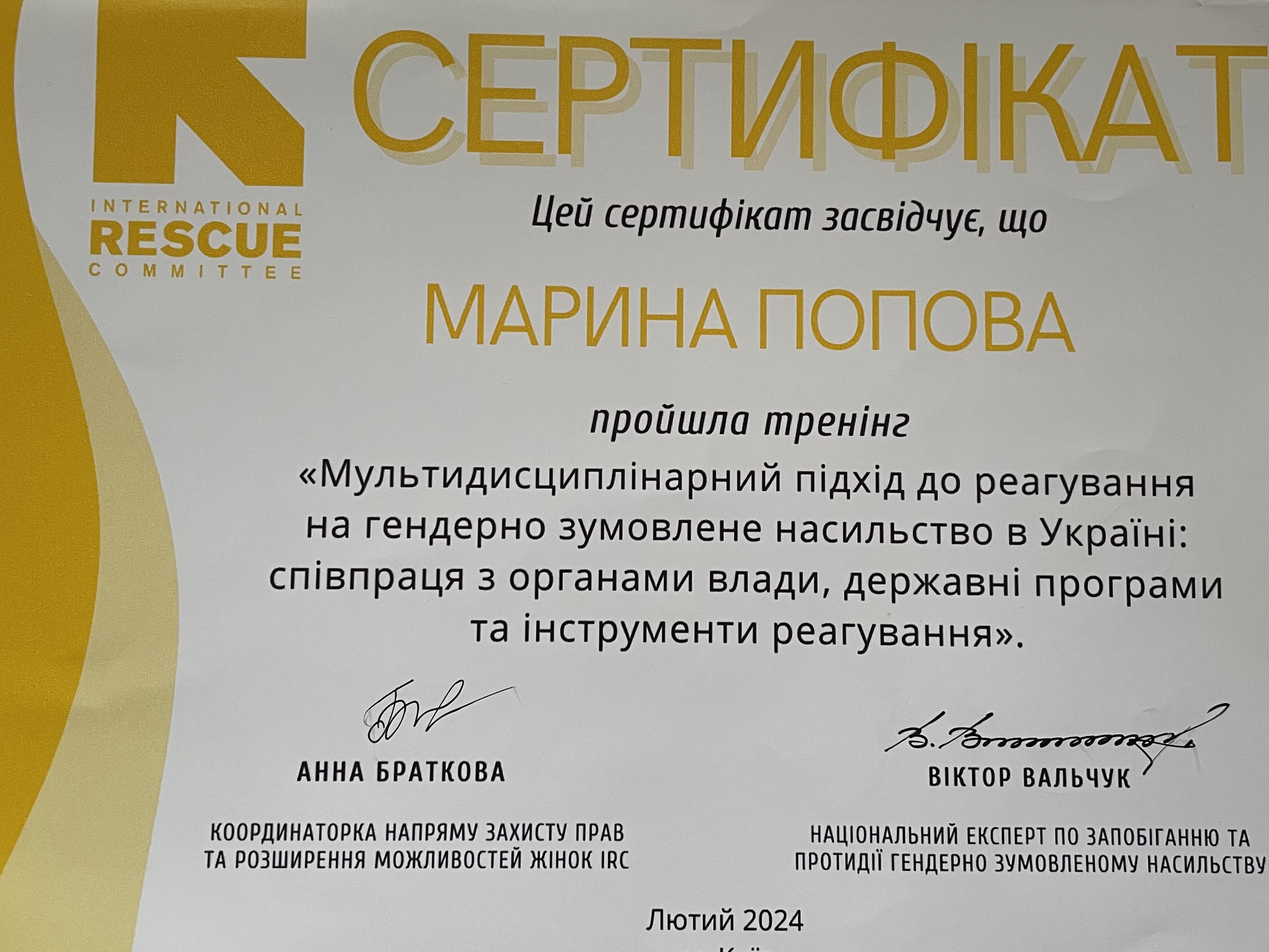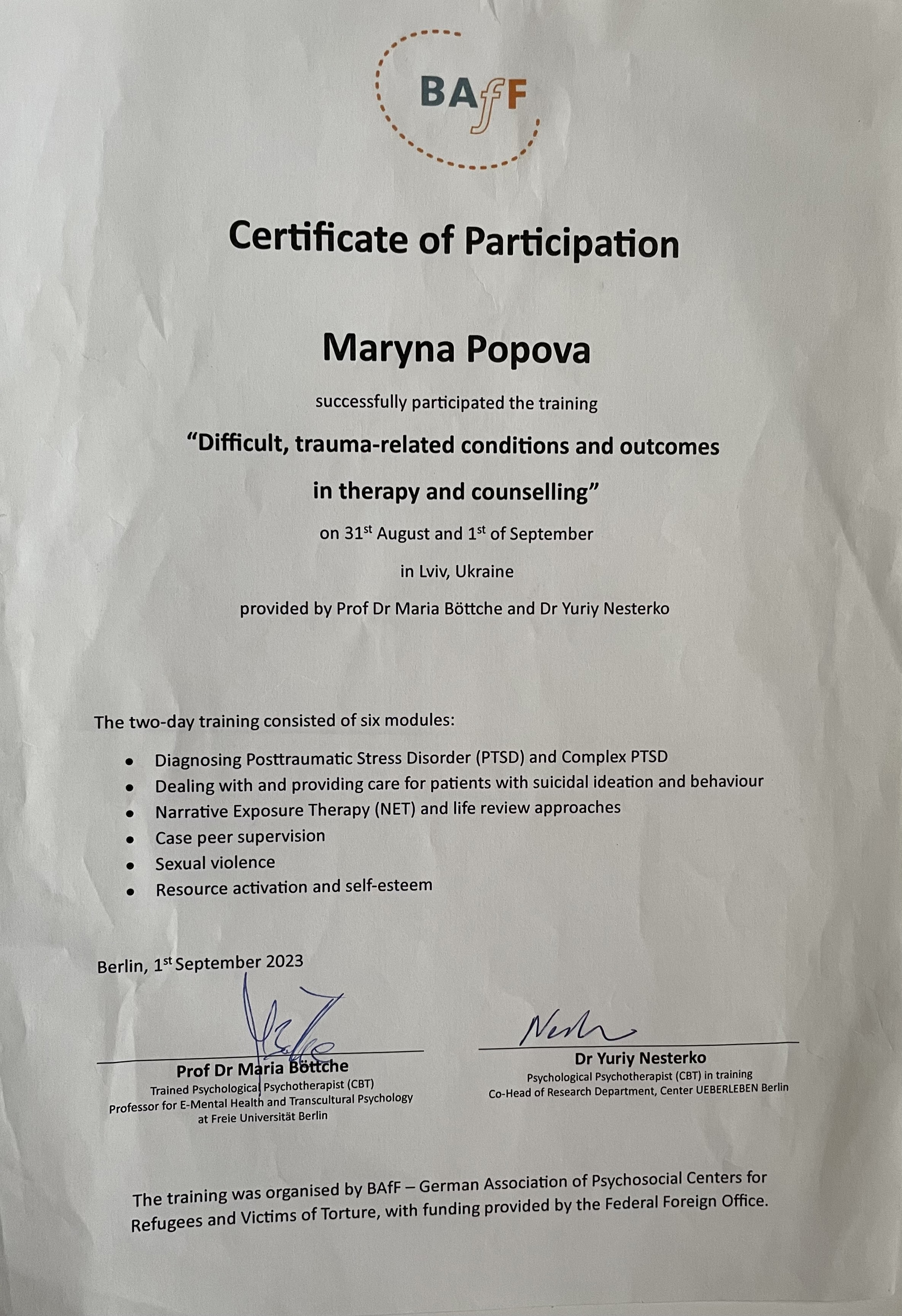 2015 - 2016 - Київський гештальт університет, спеціалізація «Робота з травмами та втратами у гештальт-підході»