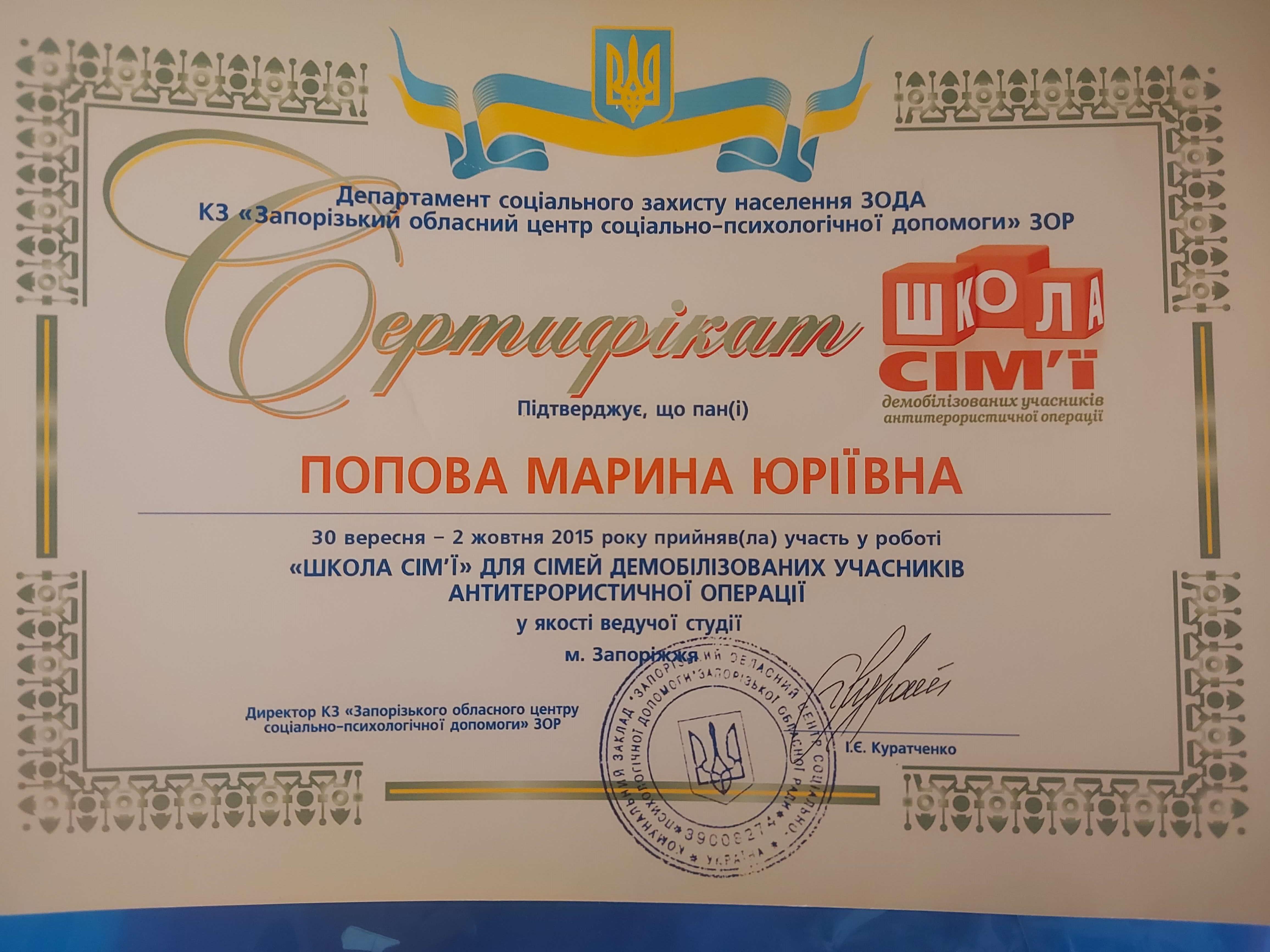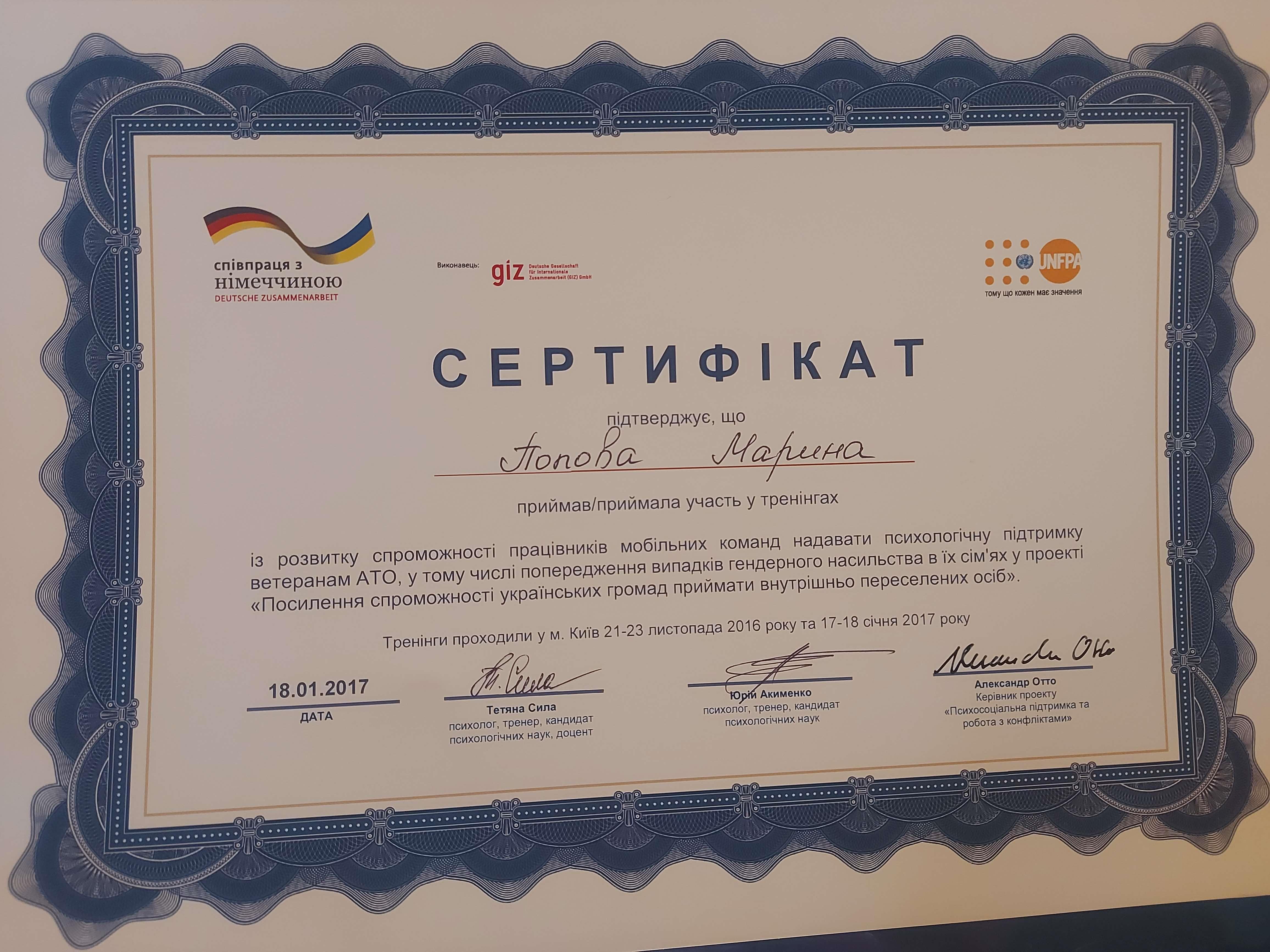 2016, 2017 Підвищення професійної кваліфікації «Підвищення здібностей фахівців мобільних бригад у психологічній підтримці ветеранам АТО та членам їх сімей.