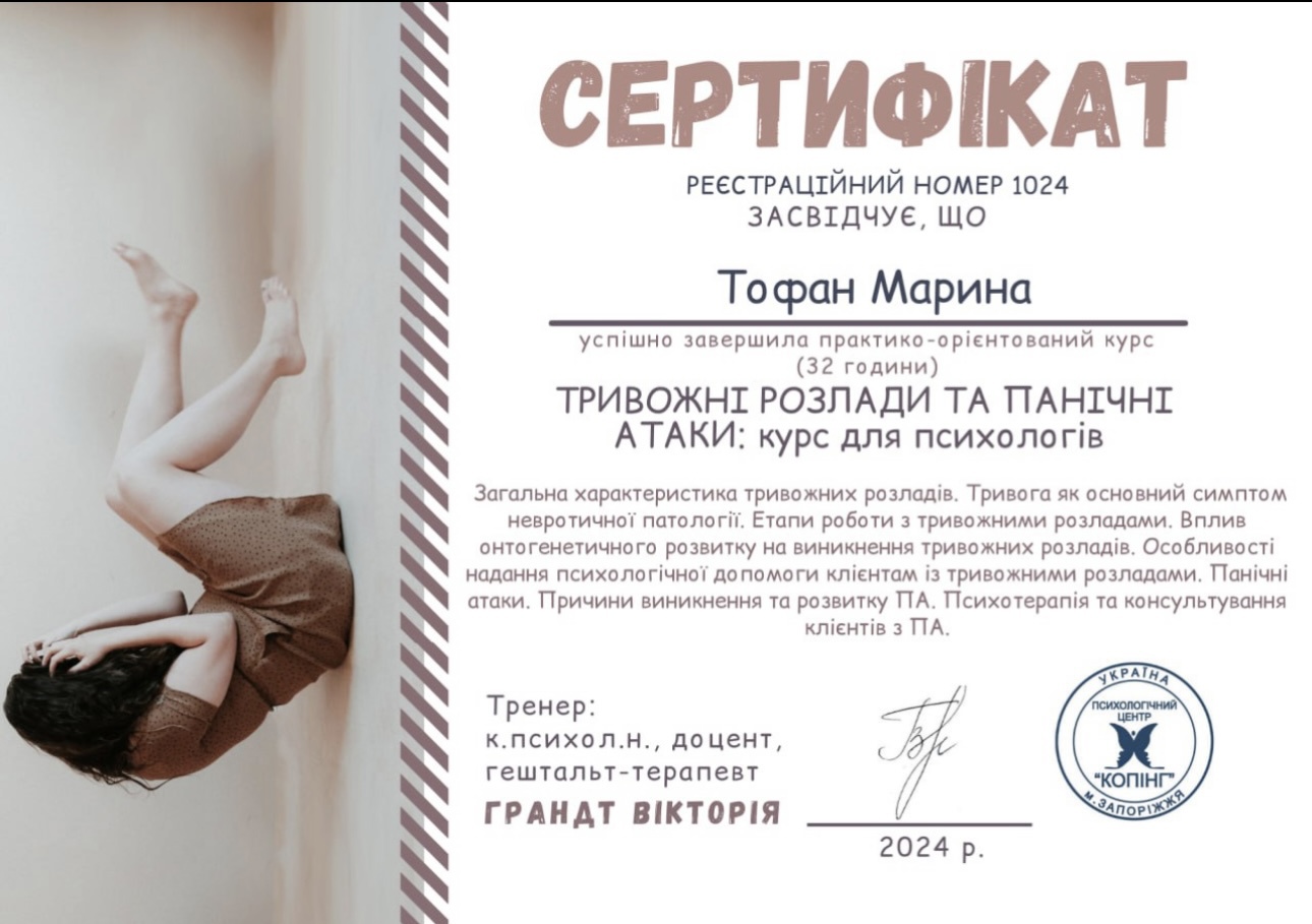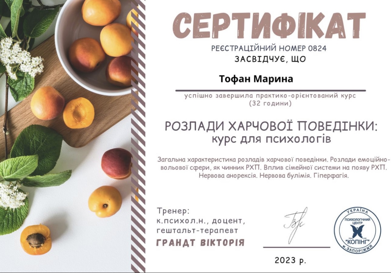 Український інститут Позитивної психотерапії «консультант з психосоматики в методі позитивної психотерапії Н. Пезешкіана» ( 2021- 2022).